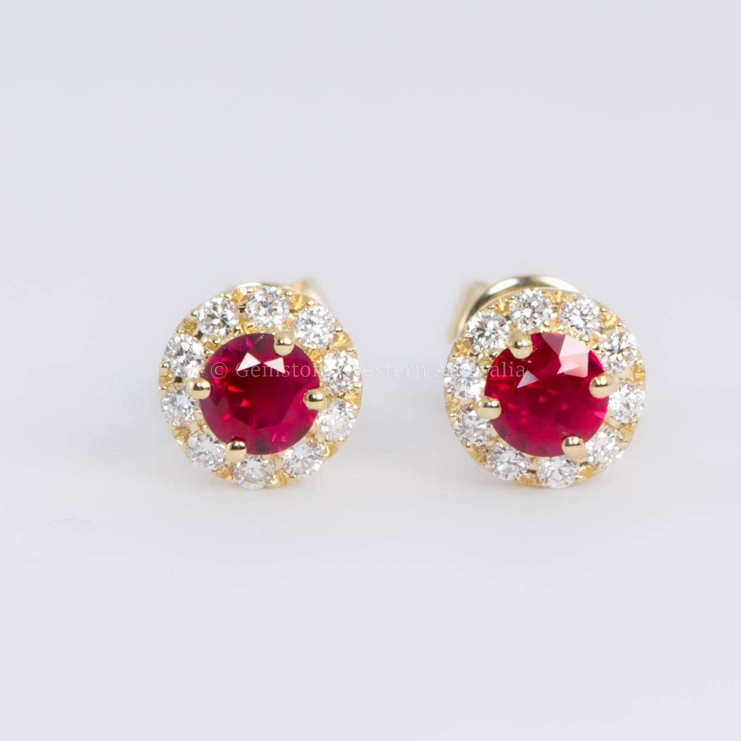Indulge in everyday elegance with our stunning pair of Natural Ruby Stud Earrings. These dainty yet dazzling earrings showcase two round-cut rubies surrounded by a brilliant halo of diamonds, all meticulously set in 18k yellow gold. Ensuring both style and security, the earrings are designed with safety screw backs.
