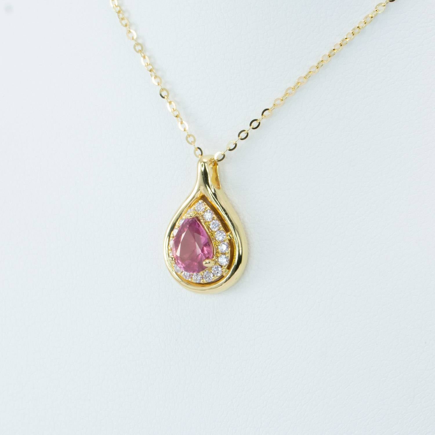 A dainty and elegant 1.0 Carat Pink Sapphire and Diamonds Pendant showcasing a pear-cut natural pink sapphire. The sapphire is delicately claw-set at the center of a teardrop-shaped halo of diamonds, framed by a yellow gold edge that gracefully transforms into a veil at the pendant's top. Explore our collection of 2000+ gems in stock, including Loose Sapphires. Can't find what you want? Contact us here for a wider selection. For custom designs, expert advice, and more information, book here a complimentary appointment with our expert gemologist and designers.