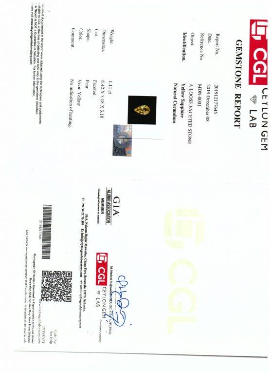 Certificate: Ceylon Gem Lab, Gemological Association of Australia