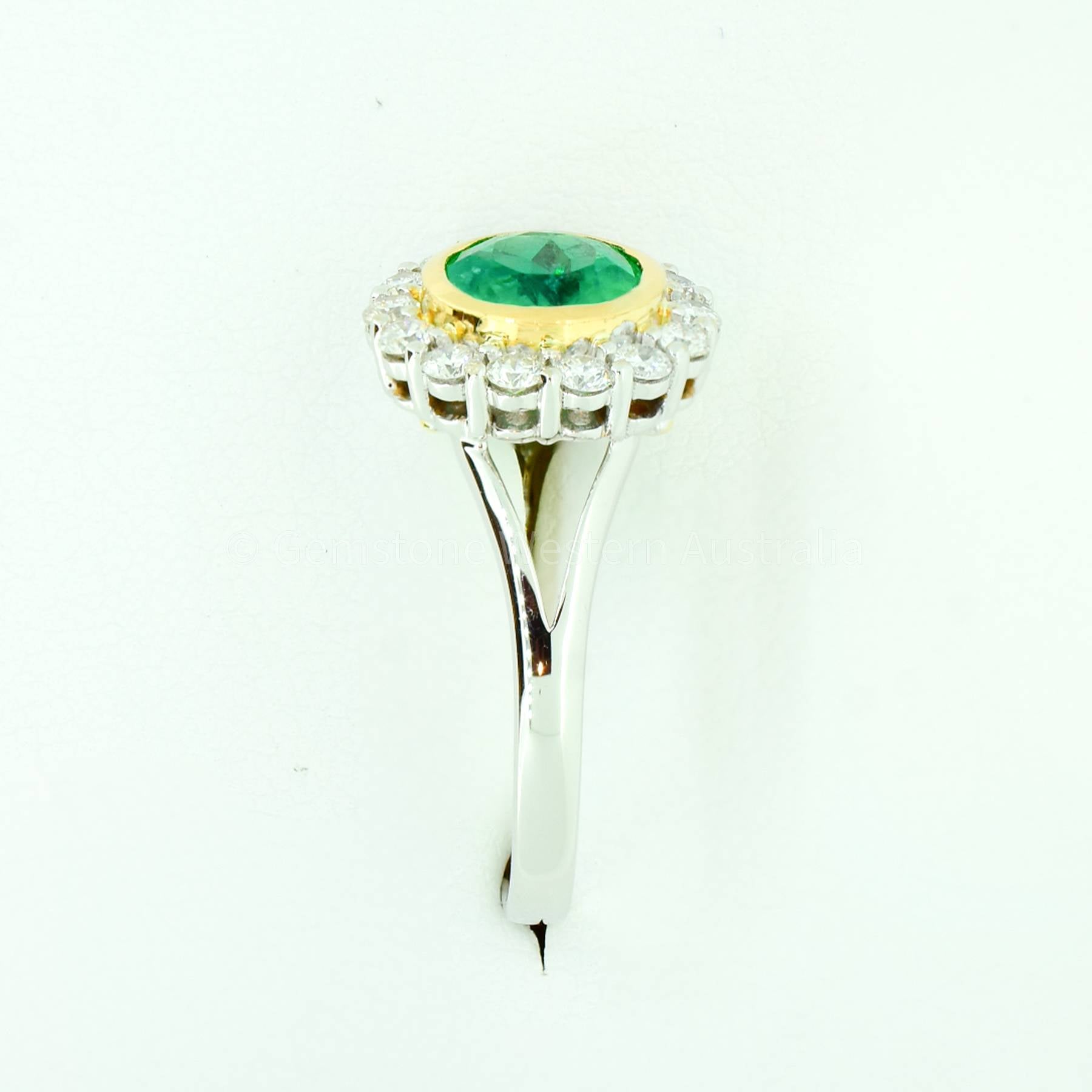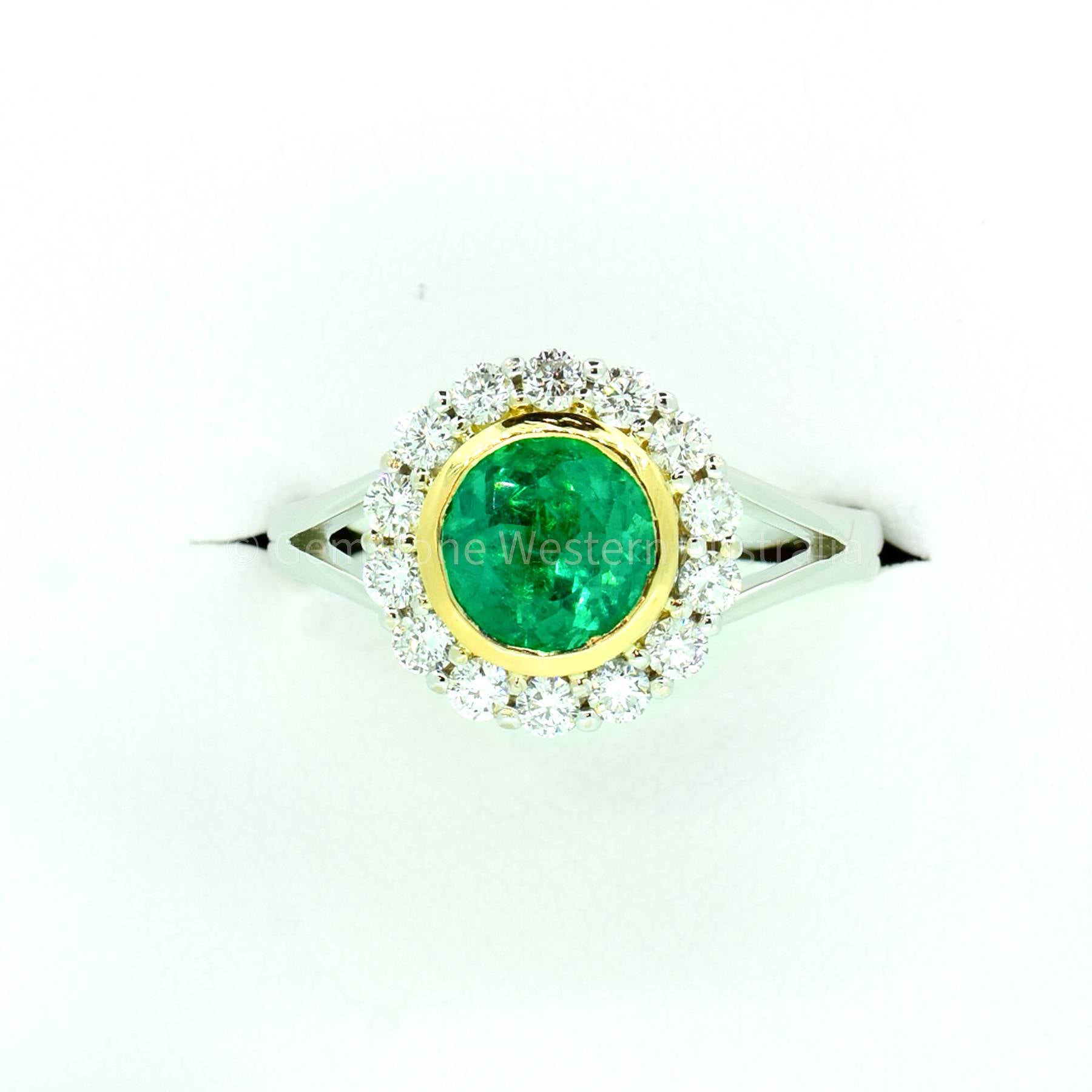 An elegant and stunning 1.50 Carat Colombian Emerald and Diamond Ring showcases an outstanding quality vivid green, round cut emerald weighting 1.50ct and surrounded by a halo of 14 round brilliant cut diamonds weighing 0.49 carats. The ring is made in mixed yellow and white 18K gold. The emerald is fabulously set and protected by a bezel of yellow gold. Explore our collection of 2000+ gems in stock, including Loose Emeralds. Can't find what you want? Contact us here for a wider selection. For custom designs, expert advice, and more information, book here a complimentary appointment with our expert gemologist and designers. RRV: $19.250