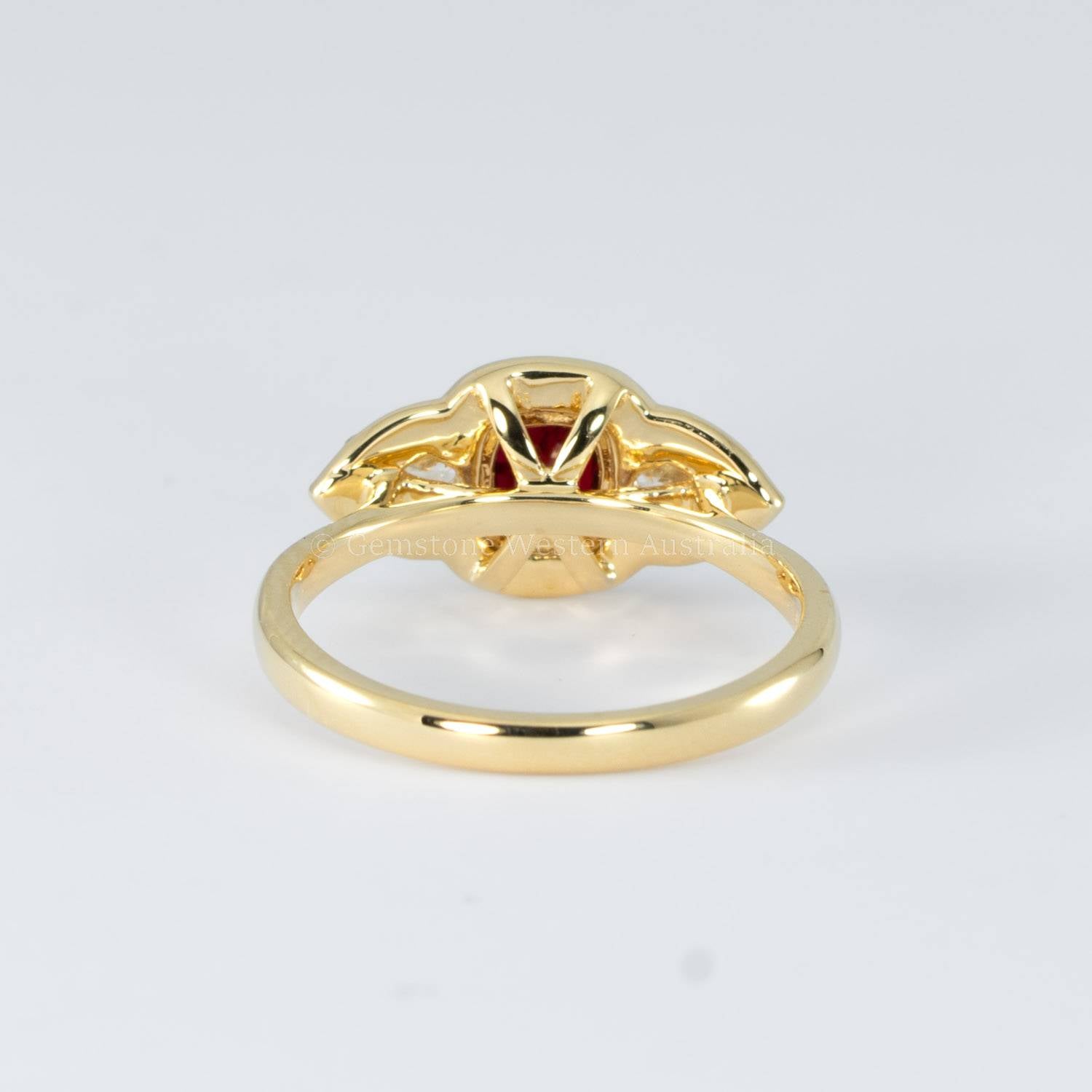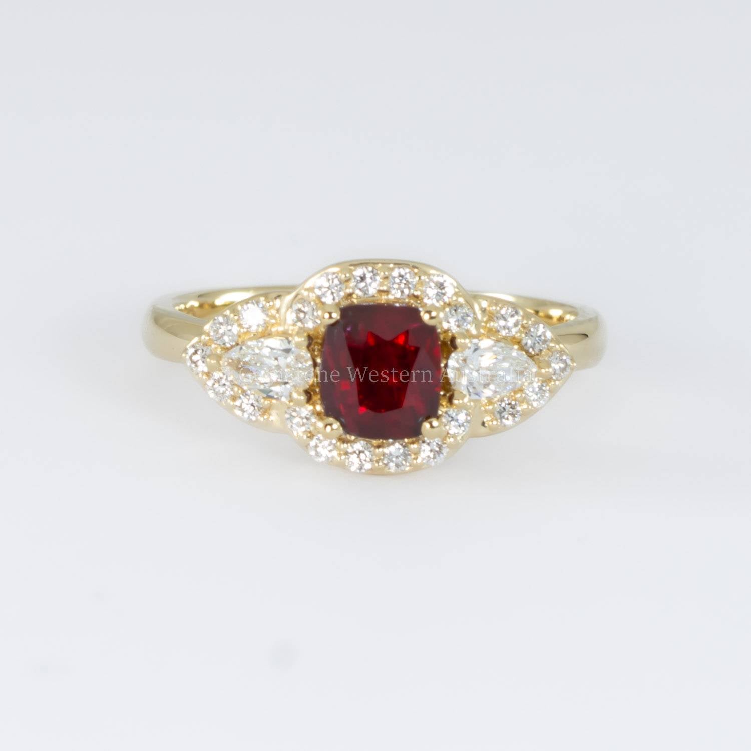 Discover the allure of our vibrant 1 Carat Cushion Cut Ruby and Diamond Halo Ring , expertly crafted in 18K yellow gold. This exquisite piece features a 1.02ct natural unheated ruby as the center gemstone, flanked by a pair of pear-cut diamonds. The arrangement is further enhanced by a surrounding halo of sparkling diamonds, creating a breathtaking display of brilliance and elegance. Explore our collection of 2000+ gems in stock, including Loose Rubies. Can't find what you want? Contact us here for a wider selection. For custom designs, expert advice, and more information, book here a complimentary appointment with our expert gemologist and designers.