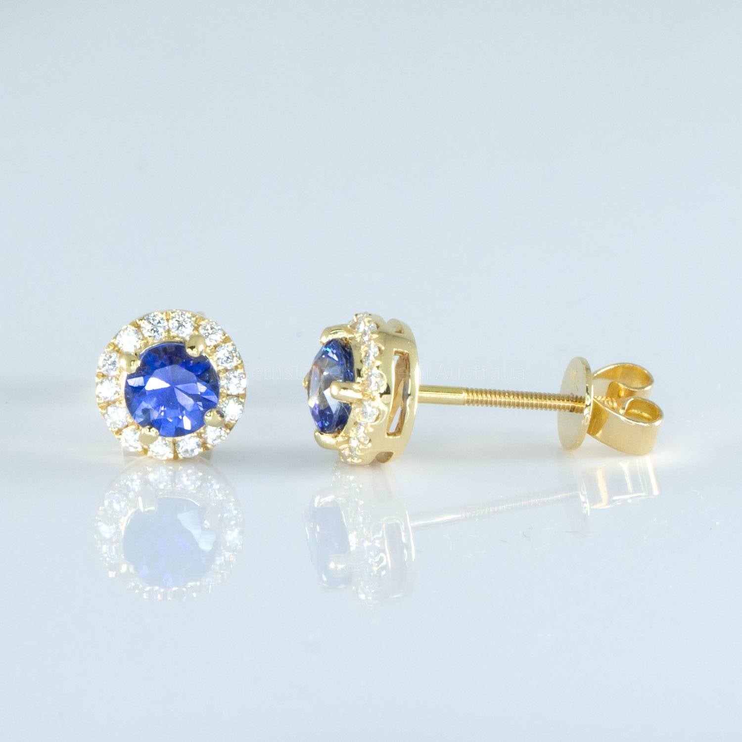 These stunning 18K Yellow Gold Sapphire Stud Earrings, showcase exquisite round blue sapphires embraced by a halo of round brilliant-cut diamonds elegantly set in 18K yellow gold. These earrings have secure safety screw backs for your peace of mind.