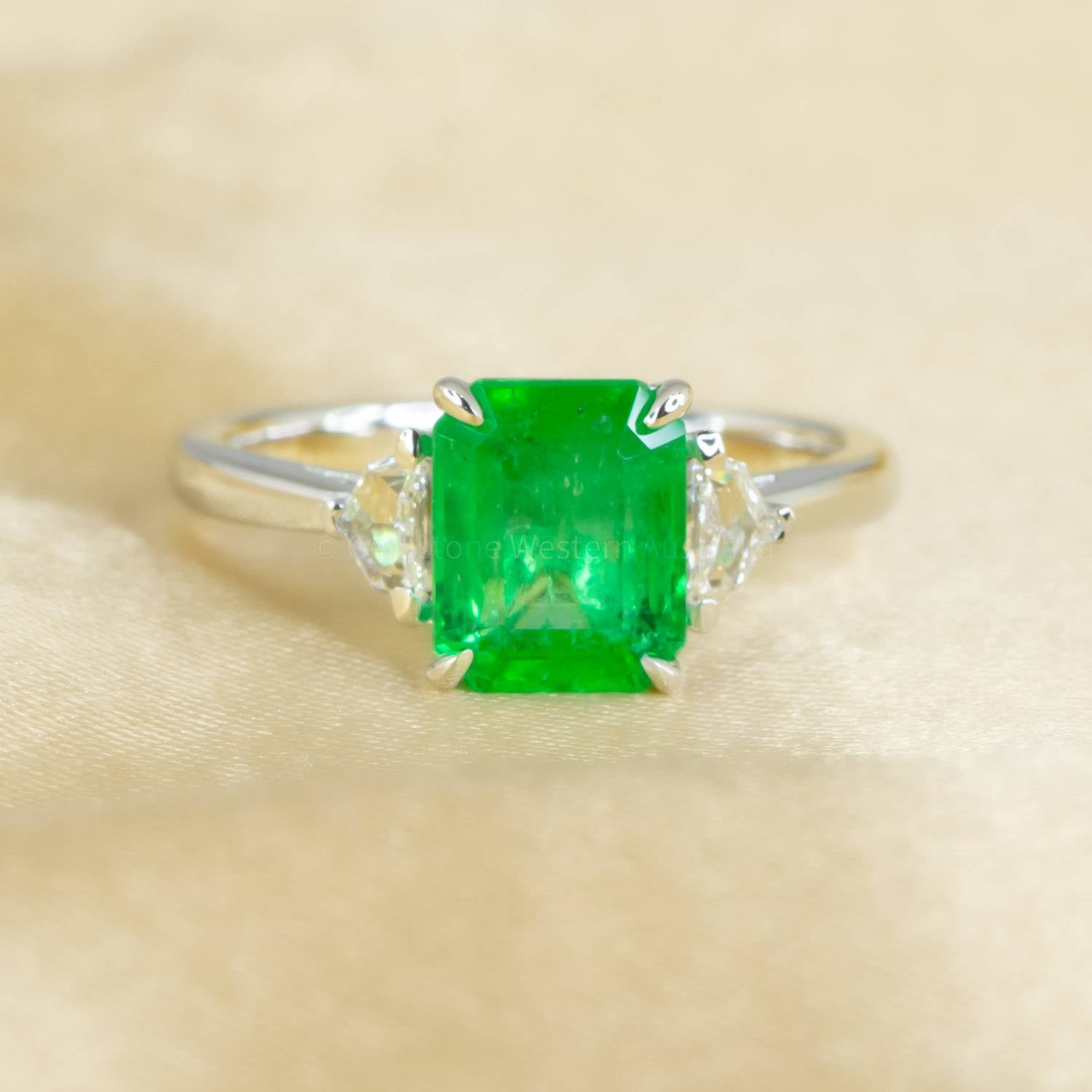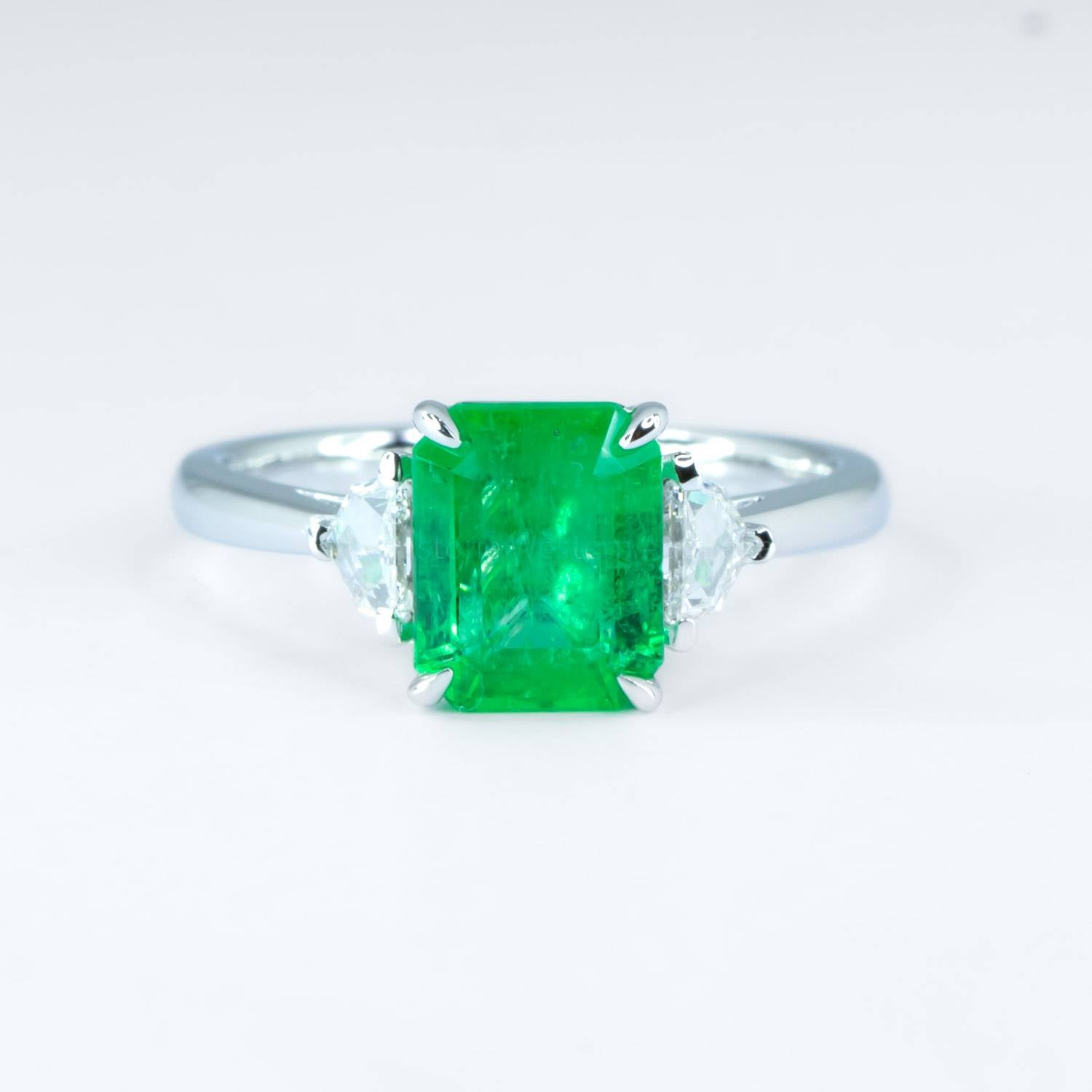 A vibrant Emerald Cut Emerald Ring features a stunning 2.01ct natural Colombian emerald flanked by two Cadillac cut diamonds that beautifully adorn the emerald to create a one-of-a-kind three-stone ring. The ring is crafted in 18K white gold. Explore our collection of 2000+ gems in stock, including Loose Emeralds. Can't find what you want? Contact us here for a wider selection. For custom designs, expert advice, and more information, book here a complimentary appointment with our expert gemologist and designers.
