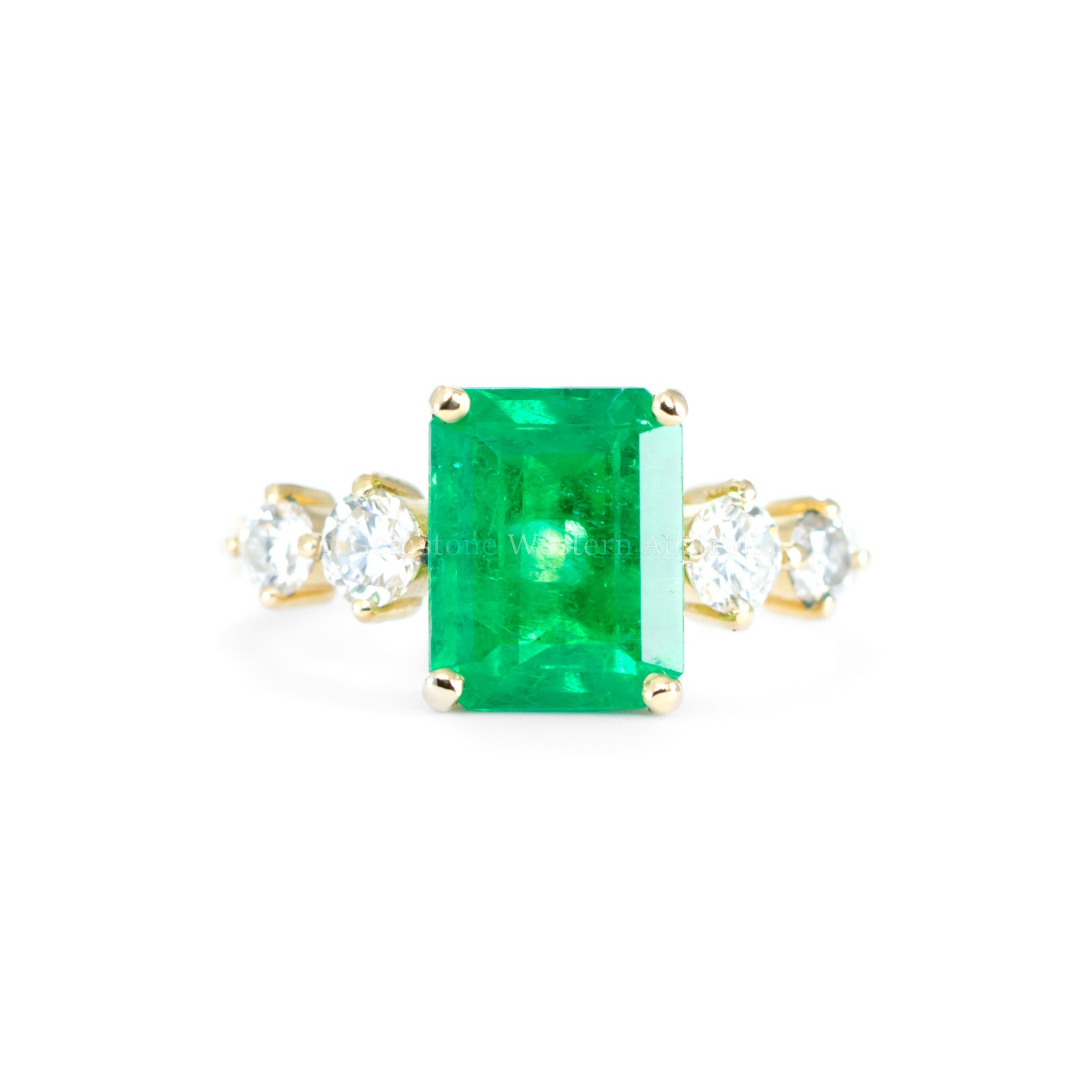 2.29ct Natural Colombian Emerald Ring with GIA Diamonds This 2.29ct natural Colombian emerald ring is a true showstopper, featuring a stunning emerald-cut Colombian emerald that radiates an intense, vibrant green hue. Known for their rarity and exceptional clarity, Colombian emeralds are some of the most sought-after gemstones in the world, and this piece is no exception. The emerald is beautifully flanked by two larger GIA-certified diamonds (3.5mm) and two smaller round brilliant-cut diamonds (2.9mm), each diamond carefully chosen for its sparkle and set in perfect harmony with the centre gem. The 18K yellow gold band adds a touch of warmth to the design, featuring a uniquely elevated rim at the centre of the band, giving it a subtle yet striking line-pattern effect that complements the rich colour of the Colombian emerald. This ring is an exceptional combination of classic beauty and contemporary elegance, ideal for anyone who values rare gemstones and sophisticated craftsmanship.
