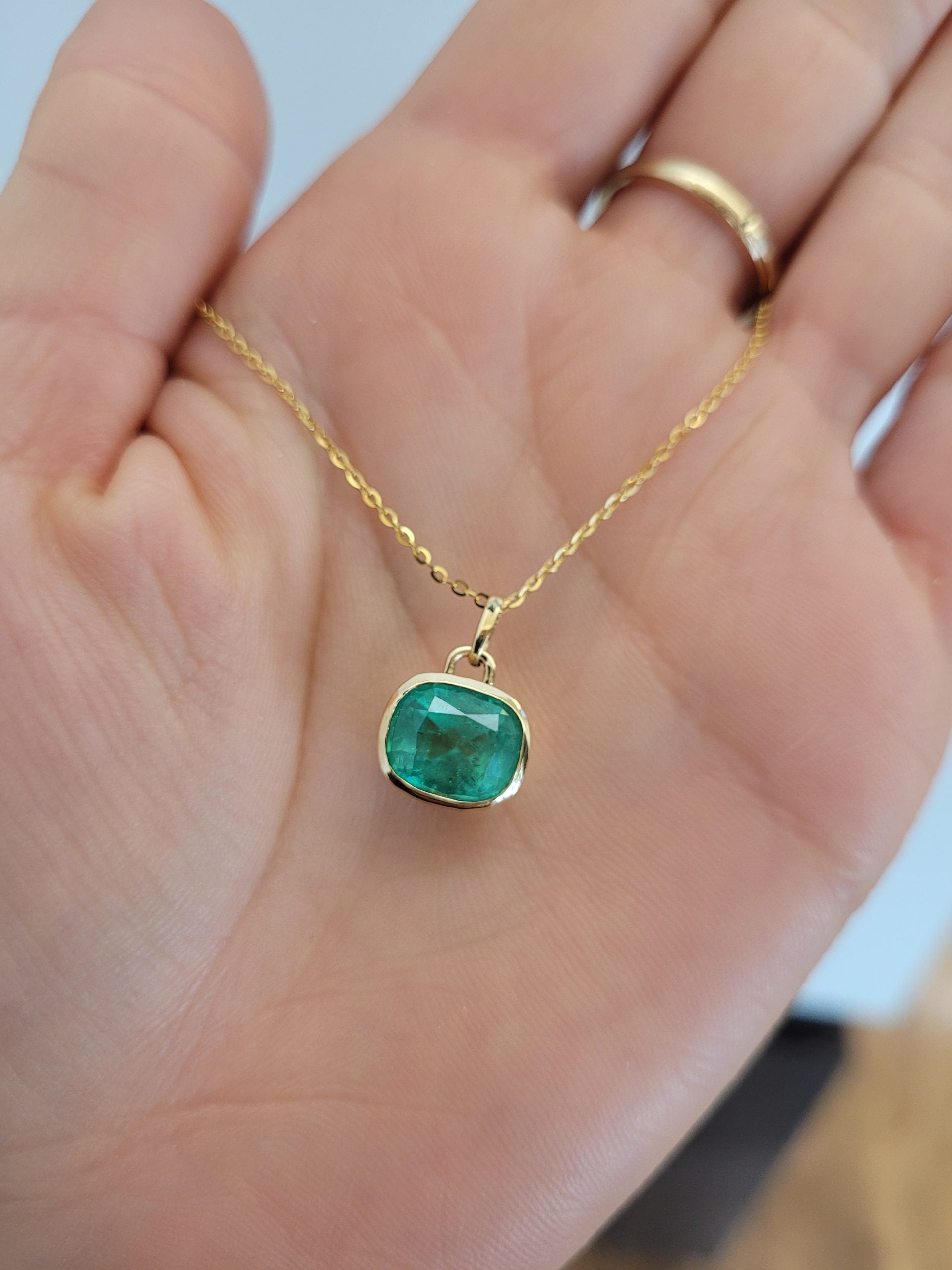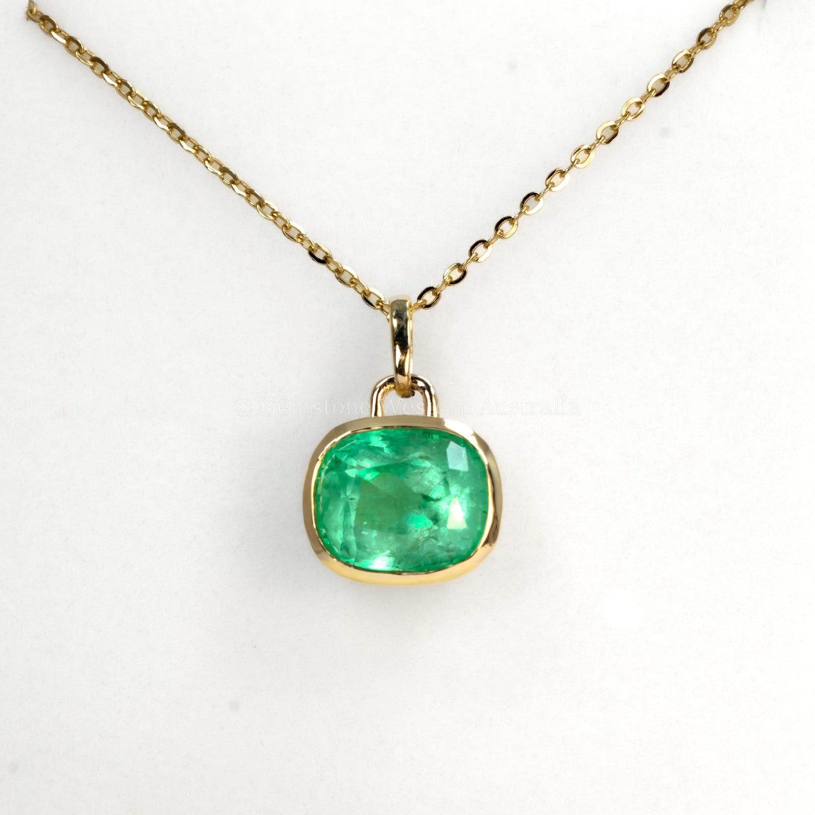 Colombian Emerald Cushion Cut Pendant This stunning pendant showcases a 3.08ct natural Colombian emerald, cut into a classic cushion shape. Set east to west in a sleek bezel setting, this emerald's vibrant green hues are beautifully framed, allowing its rich colour and natural beauty to shine through. The pendant is crafted in 18K yellow gold, a perfect complement to the emerald's vivid tones. The elegant design is completed with a unique gold bar bail, connecting seamlessly to the top of the cushion cut, offering both stability and style. This pendant is a perfect blend of timeless elegance and modern flair, making it an exceptional addition to any jewellery collection. Explore our collection of 2000+ gems in stock, including Loose Emeralds. Can't find what you want? Contact us here for a wider selection. For custom designs, expert advice, and more information, book here a complimentary appointment with our expert gemologist and designers.