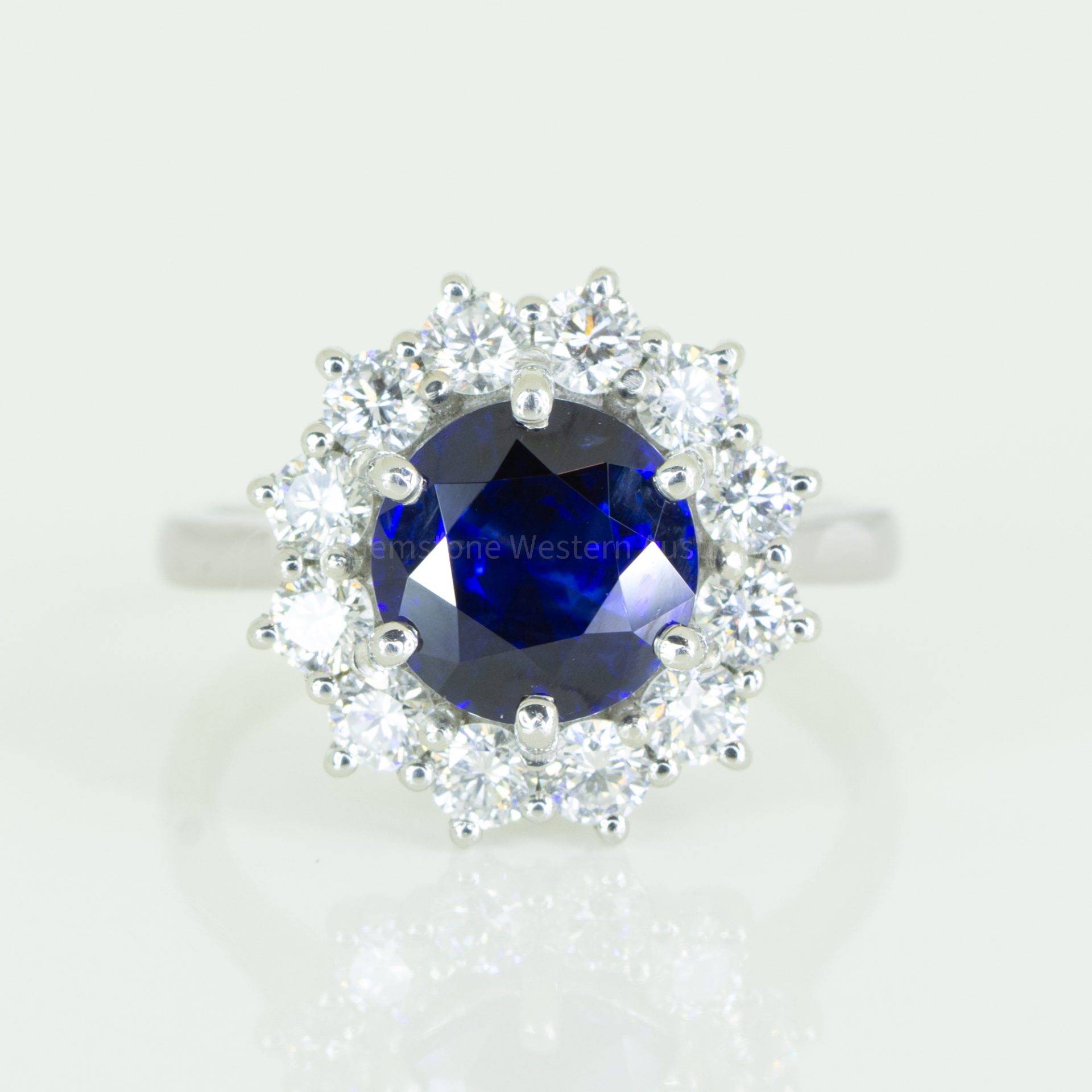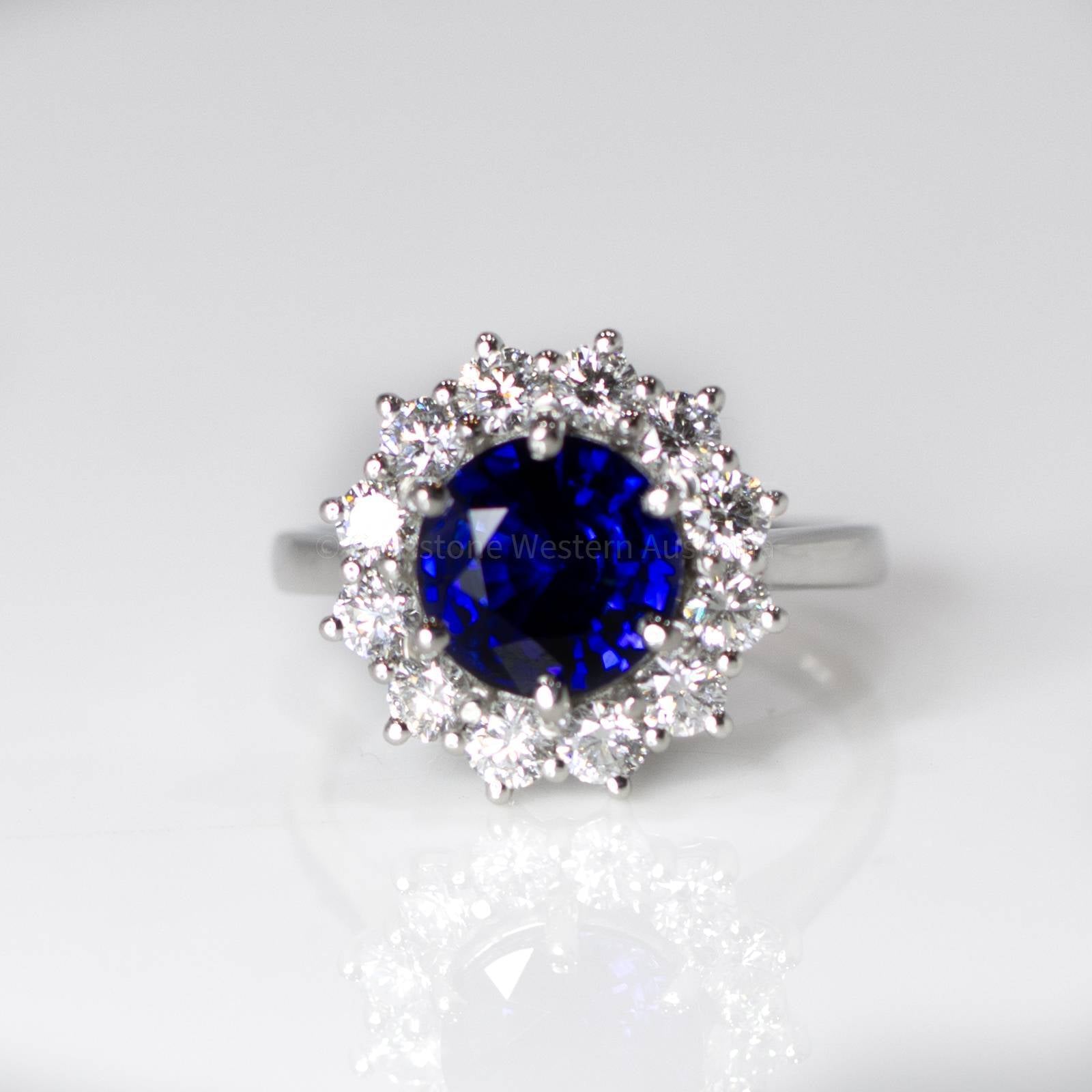 A stunning royal blue sapphire halo ring features a dazzling 3.16 carats round, natural blue sapphire at the centre of an impressive halo of diamonds to create the most spectacular ring. Created in platinum for more strength and durability, this piece makes a stunning addition to any jewellery collection as well as a superb engagement ring. RRV: $19.700 Explore our collection of 2000+ gems in stock, including Loose Sapphires. Can't find what you want? Contact us here for a wider selection. For custom designs, expert advice, and more information, book here a complimentary appointment with our expert gemologist and designers.