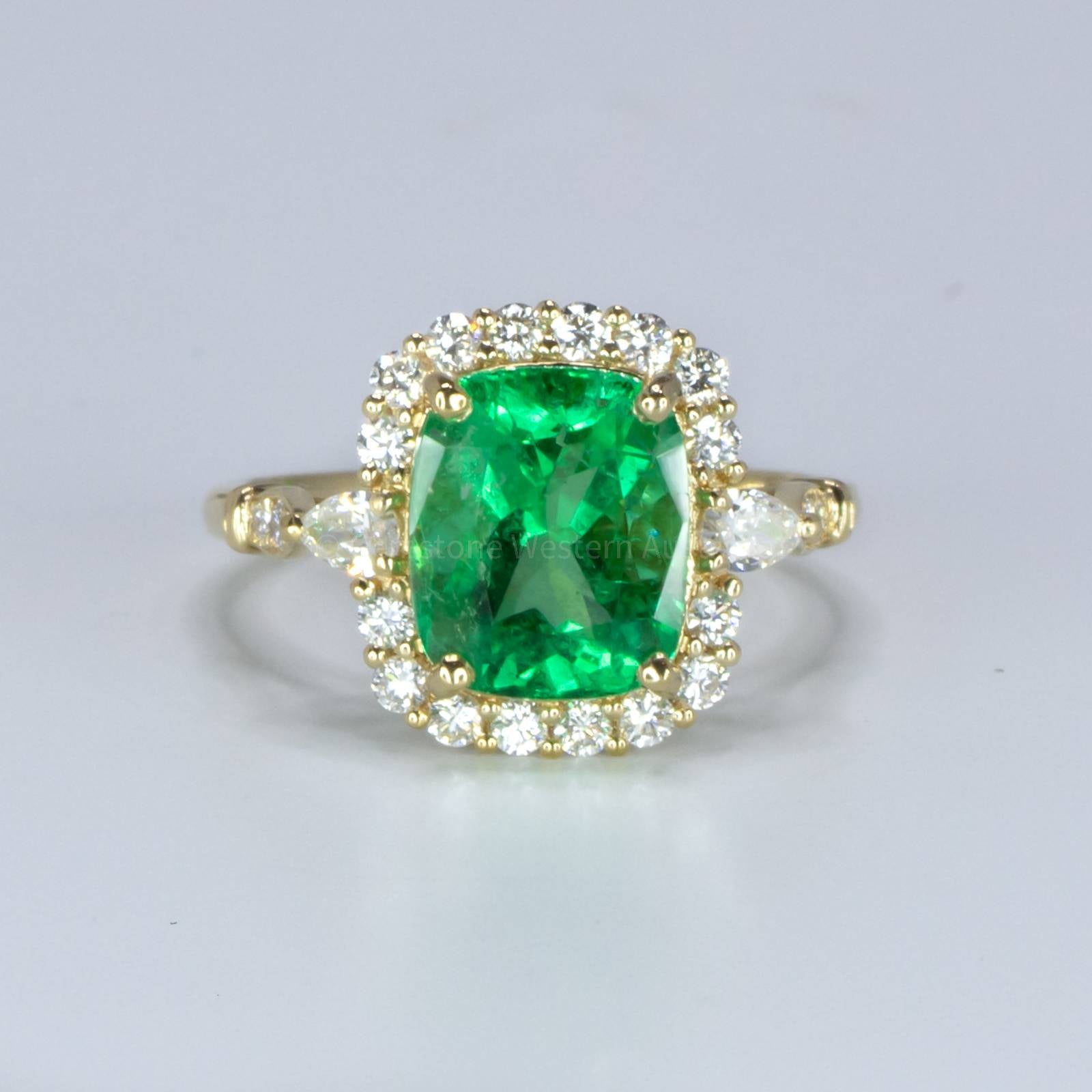 A magnificent Natural Cushion Colombian Emerald Statement Ring designed in 18 carats of yellow gold presents a breathtaking 2.99 carats Colombian emerald with an enchanting vivid green colour. The emerald, featuring a cushion cut, is surrounded by a gorgeous diamond halo. A pear-cut diamond is delicately placed at the start of the shank on each side and is followed by some more brilliant-cut diamonds to elevate the design. Explore our collection of 2000+ gems in stock, including Loose Emeralds. Can't find what you want? Contact us here for a wider selection. For custom designs, expert advice, and more information, book here a complimentary appointment with our expert gemologist and designers.