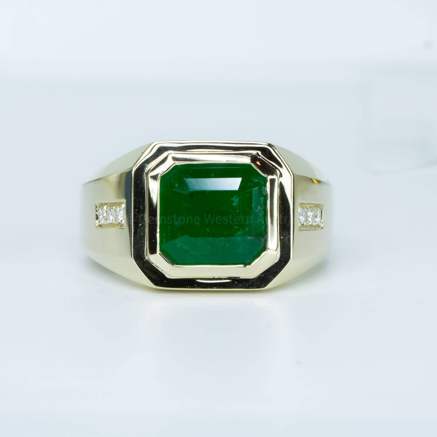 Introducing our exquisite 3.9ct Natural Emerald Men's Ring, a true symbol of timeless elegance. This captivating piece features a magnificent natural Colombian emerald, expertly cut in an emerald shape, with a weight of 3.9 carats. Complementing the emerald are six dazzling round brilliant cut diamonds. Designed for lasting beauty, this ring is crafted in 14K yellow gold. Elevate your style with this remarkable jewellery piece. Explore our collection of 2000+ gems in stock, including Loose Emeralds. Can't find what you want? Contact us here for a wider selection. For custom designs, expert advice, and more information, book here a complimentary appointment with our expert gemologist and designers.