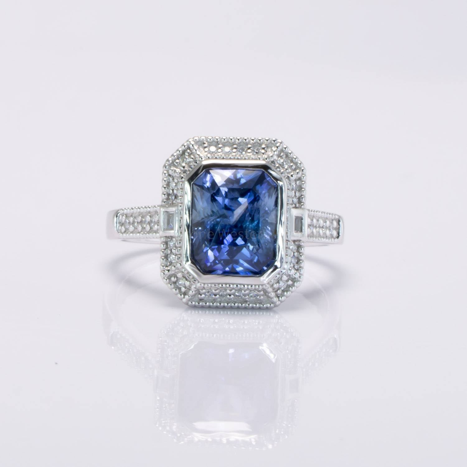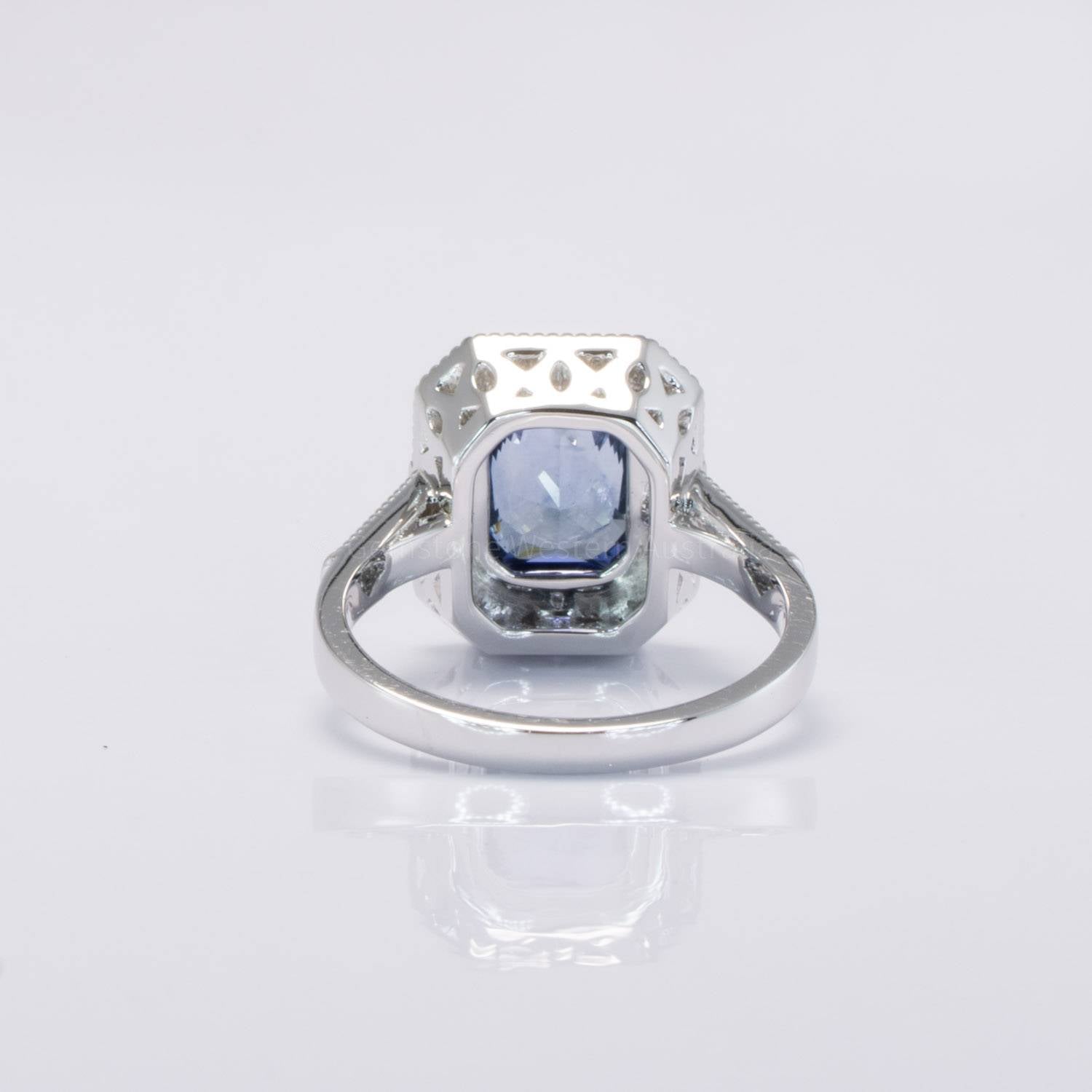 Indulge in sophistication with our exquisite Unheated Sapphire Platinum Ring showcasing a 3.12-carat natural unheated emerald-cut blue sapphire, meticulously bezel-set for a timeless appeal. Surrounded by a luminous halo of round and baguette diamonds, each set with delicate milligrain detailing, this piece is a stunning fusion of elegance and artistry. Elevate your style with a touch of luxury that transcends trends. Explore our collection of 2000+ gems in stock, including Loose Sapphires. Can't find what you want? Contact us here for a wider selection. For custom designs, expert advice, and more information, book here a complimentary appointment with our expert gemologist and designers.