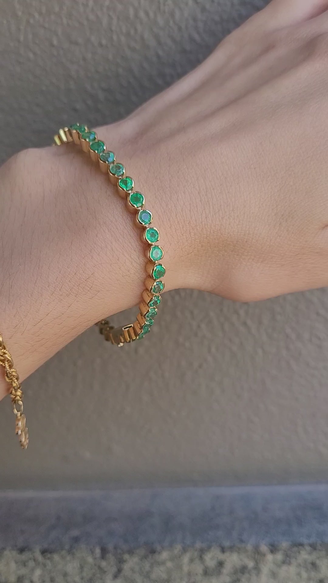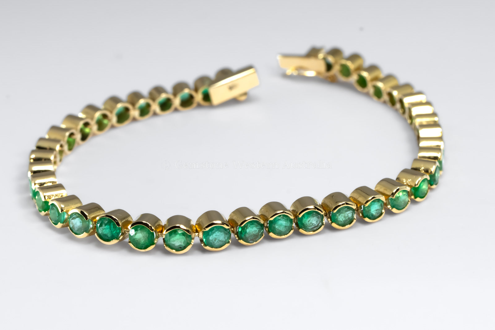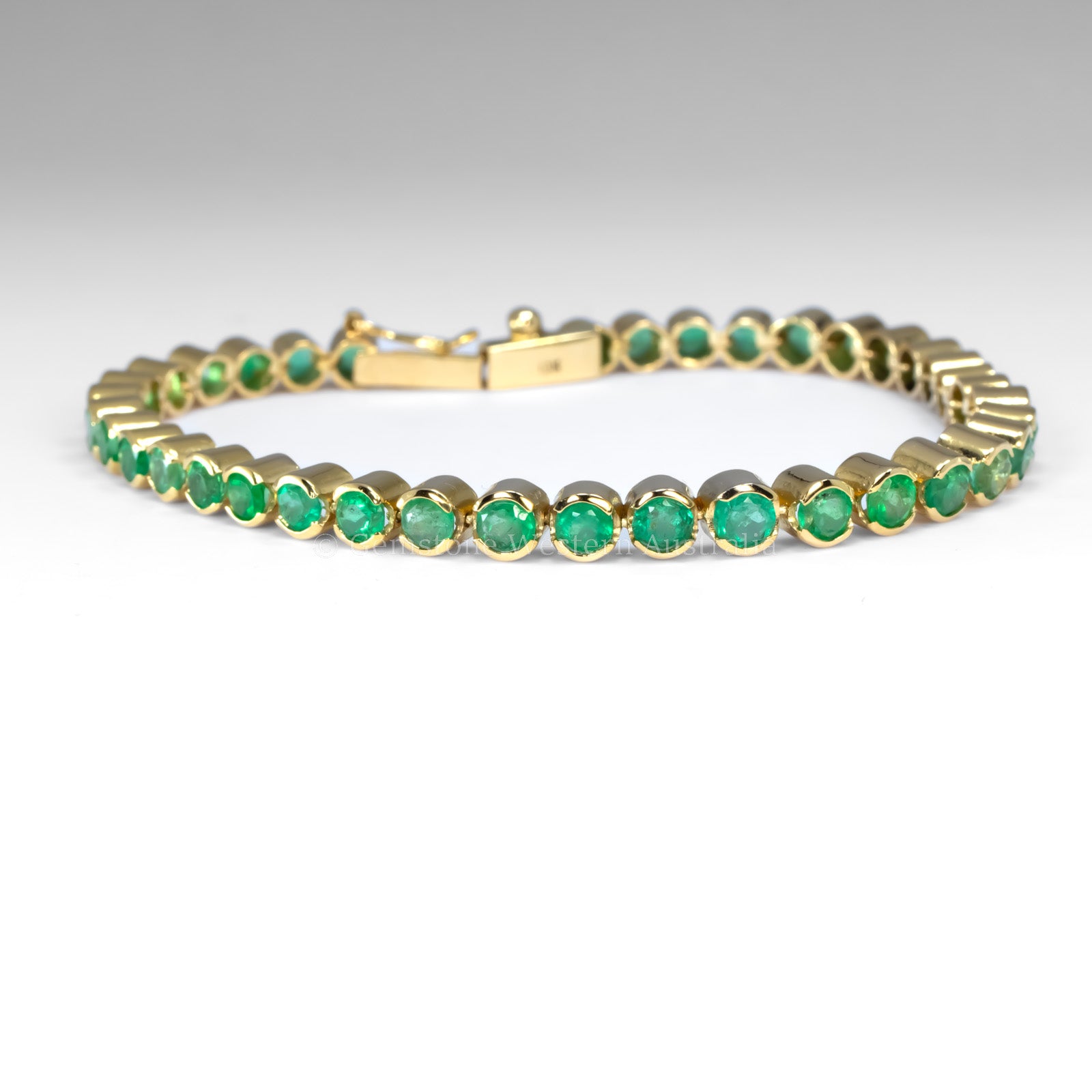 Colombian Emerald Tennis Bracelet This exquisite Colombian emerald tennis bracelet showcases 39 round faceted emeralds, totaling 6.82ct, set in handcrafted 18K yellow gold. The emeralds display a captivating range of vivid green hues, beautifully linked in a chenier/partial bezel setting for a seamless, elegant look. Designed with a secure snap clasp and safety clip, this sophisticated bracelet is a timeless addition to any fine jewellery collection. Certified by FGAA & NCJV, ensuring authenticity and quality. $27600 AUD SPECIFICATIONS: 1982136