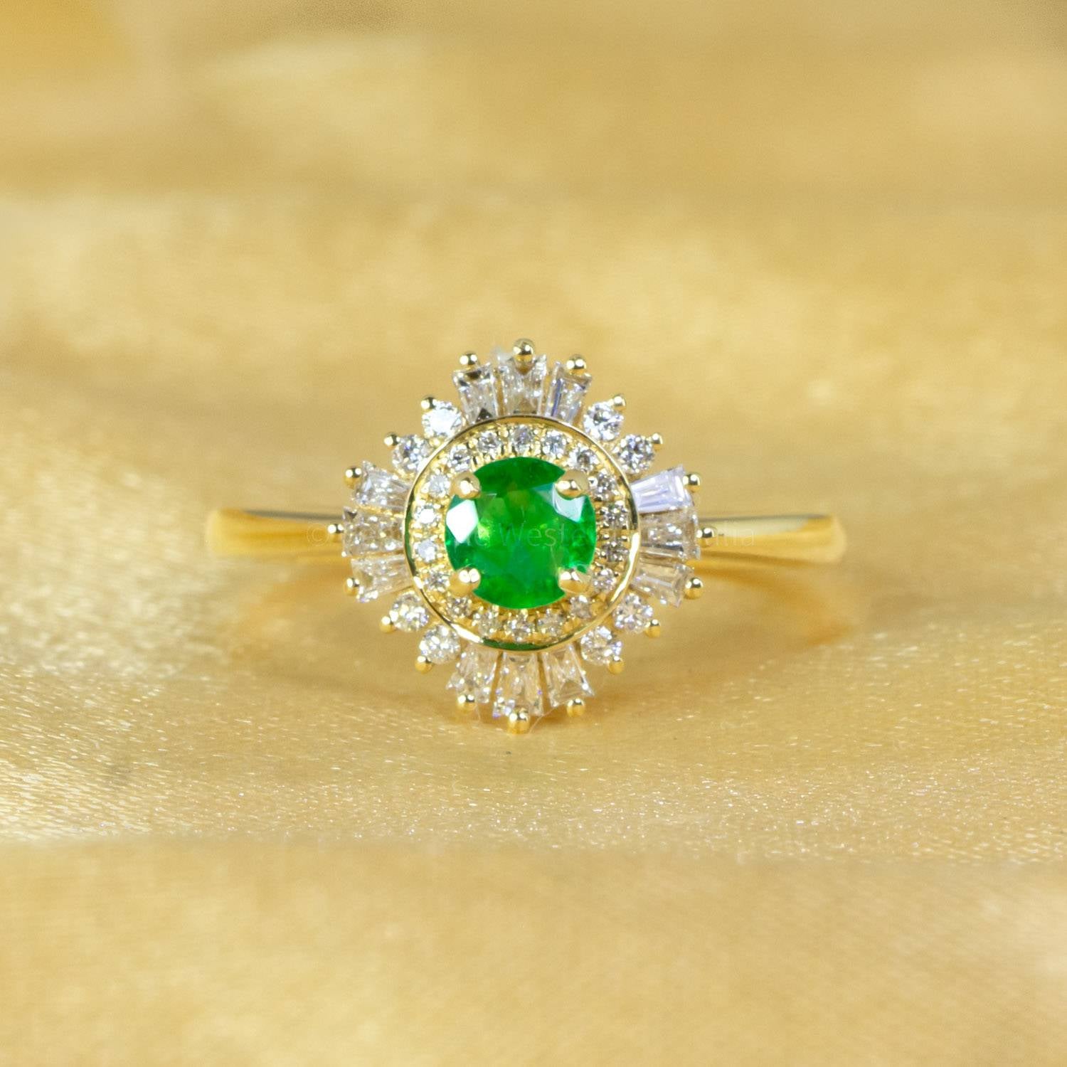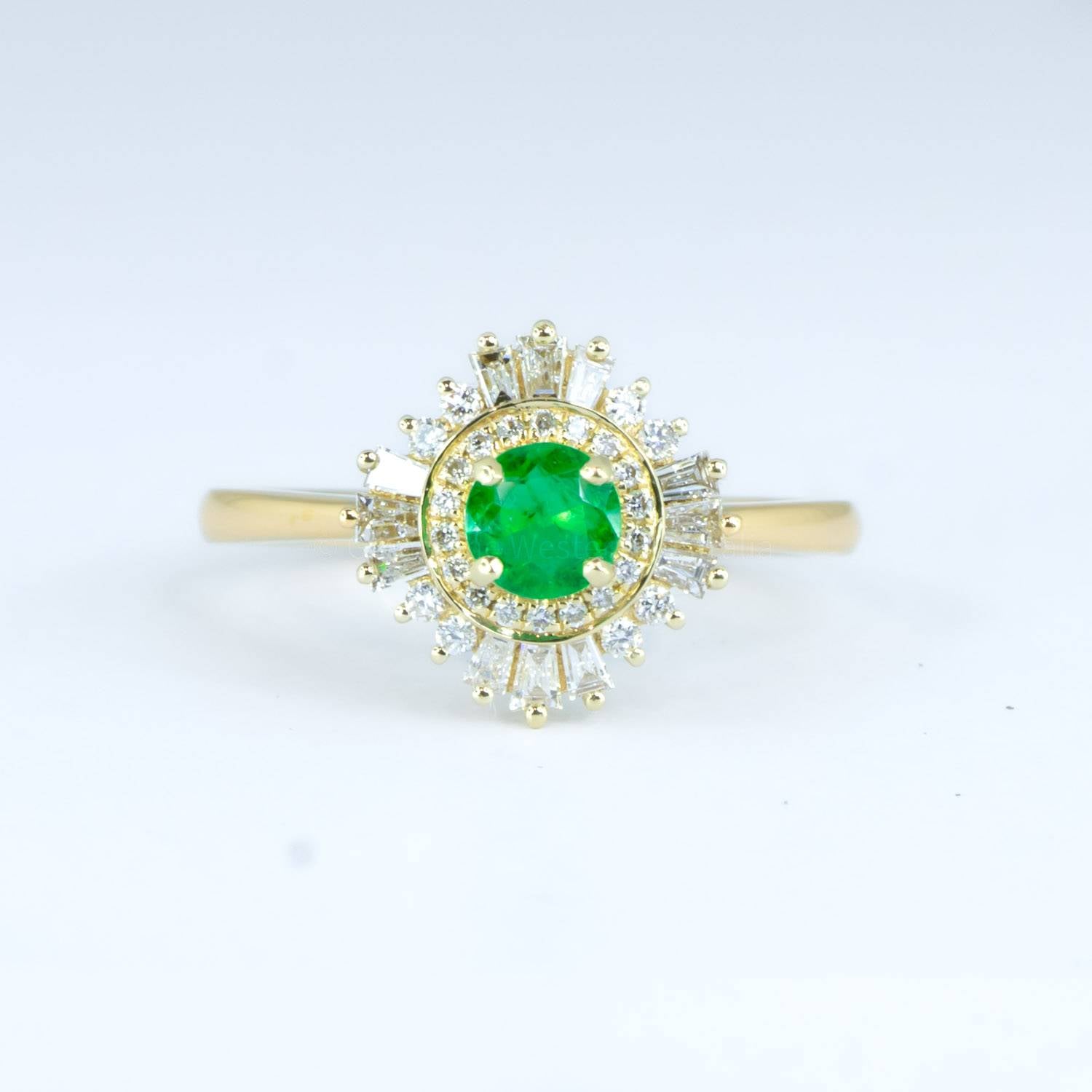Art Deco Style Emerald Ring Radiating with elegance, this Colombian Emerald Engagement Ring in 18K Yellow Gold exudes timeless allure and captivating brilliance. The focal point is a stunning round Colombian Emerald, gracefully embraced by a delicate halo of diamonds. Encircling the halo, meticulously arranged custom-cut baguette and round diamonds cascade gracefully at varying levels, evoking an enchanting Art Deco charm. Explore our collection of 2000+ gems in stock, including Loose Emeralds. Can't find what you want? Contact us here for a wider selection. For custom designs, expert advice, and more information, book here a complimentary appointment with our expert gemologist and designers.