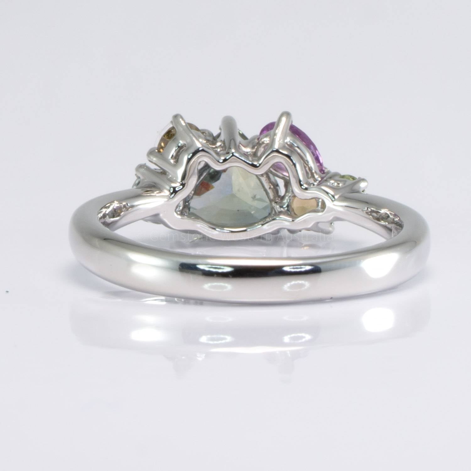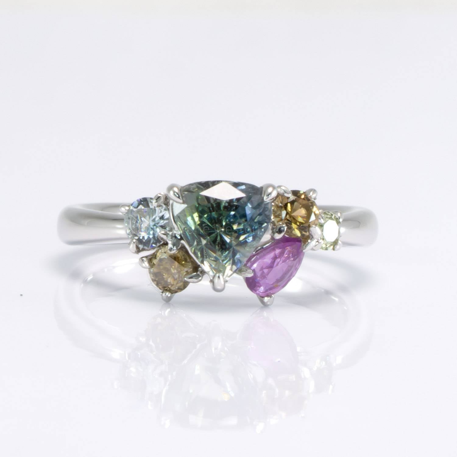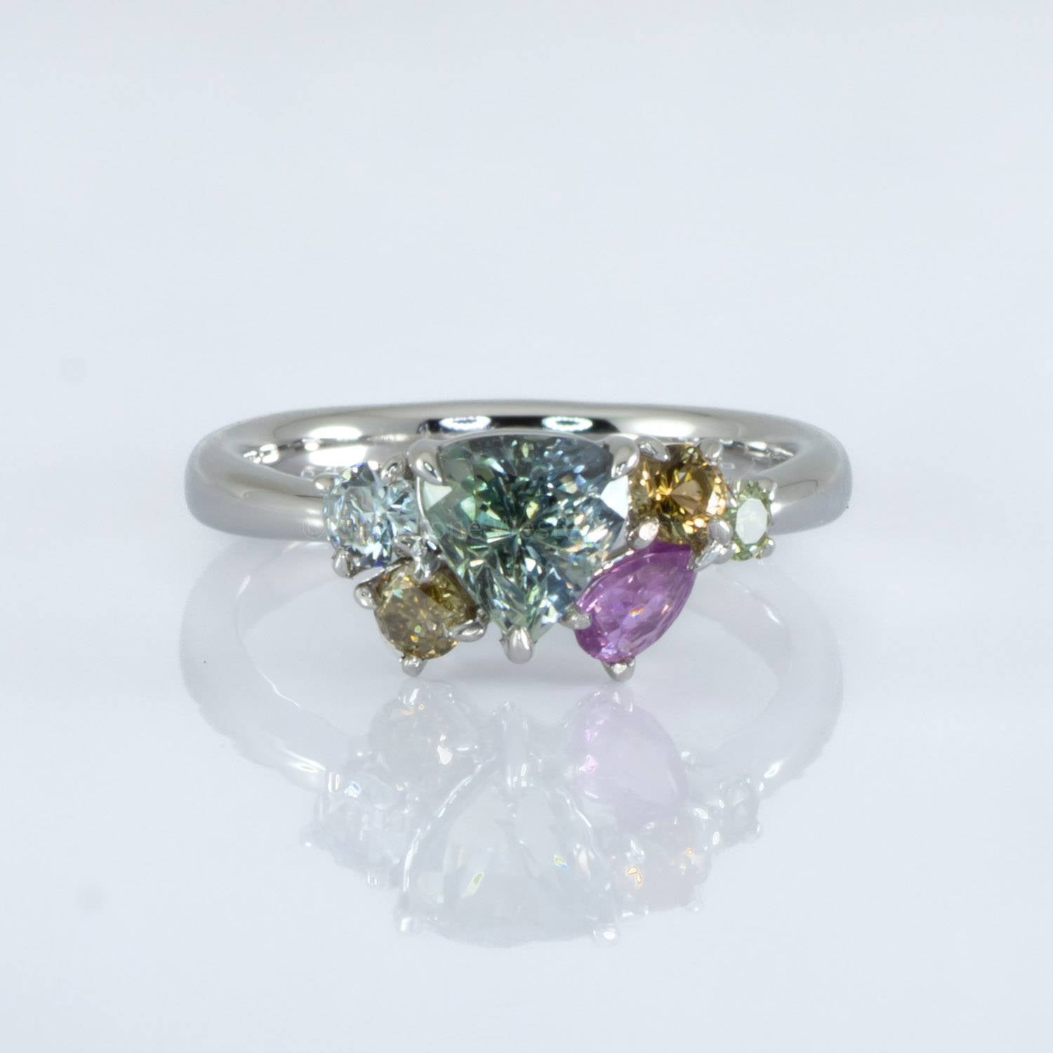 Dare to be different with our Platinum Asymmetrical Cluster Ring, a unique masterpiece featuring a captivating trillion-cut natural teal sapphire at its centre. Embracing the essence of individuality, this distinctive ring showcases an array of precious gems including a light blue tourmaline, an Argyle chocolate diamond, a pink sapphire, a yellow tourmaline, and a green tourmaline, all meticulously and asymmetrically set. Elevate your style with this bold and unconventional expression of artistry and sophistication. Explore our collection of 2000+ gems in stock, including Loose Sapphires. Can't find what you want? Contact us here for a wider selection. For custom designs, expert advice, and more information, book here a complimentary appointment with our expert gemologist and designers.