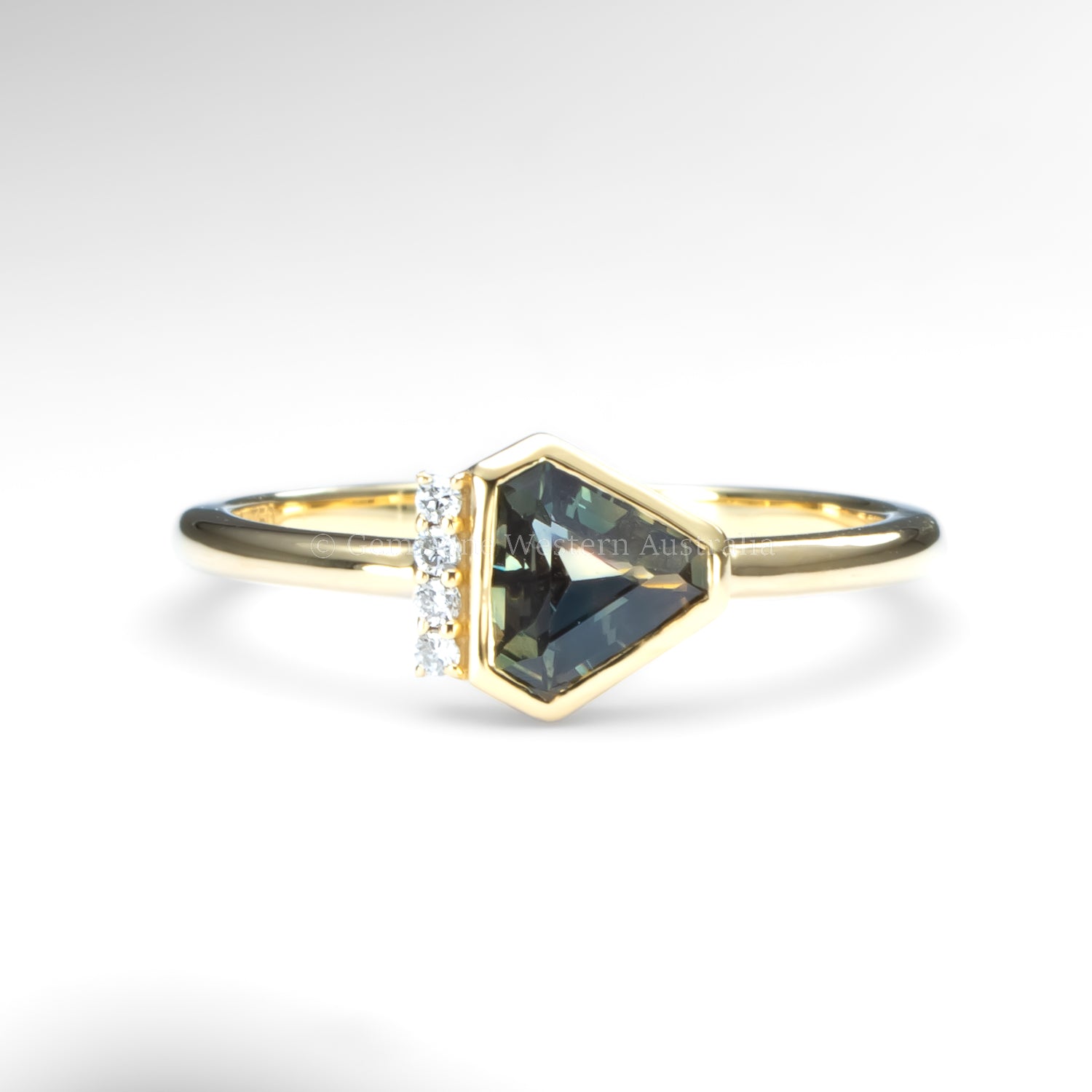 • Central stone: Natural teal sapphire, shield-cut, 9.6 x 5.1 x 2.9mm. Weight: 0.71ct.