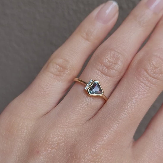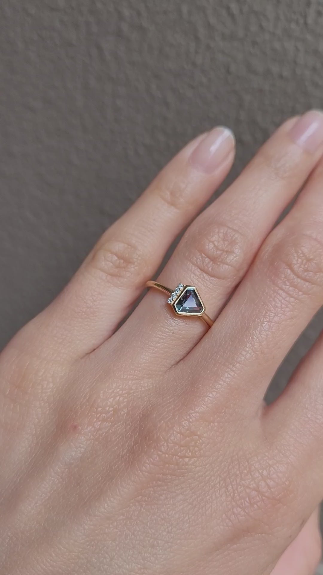 This sapphire displays an intriguing mix of earthy and cool tones, shifting gracefully with the light. Its asymmetric cut enhances the gem’s natural depth, while the side diamonds provide a brilliant visual balance.
