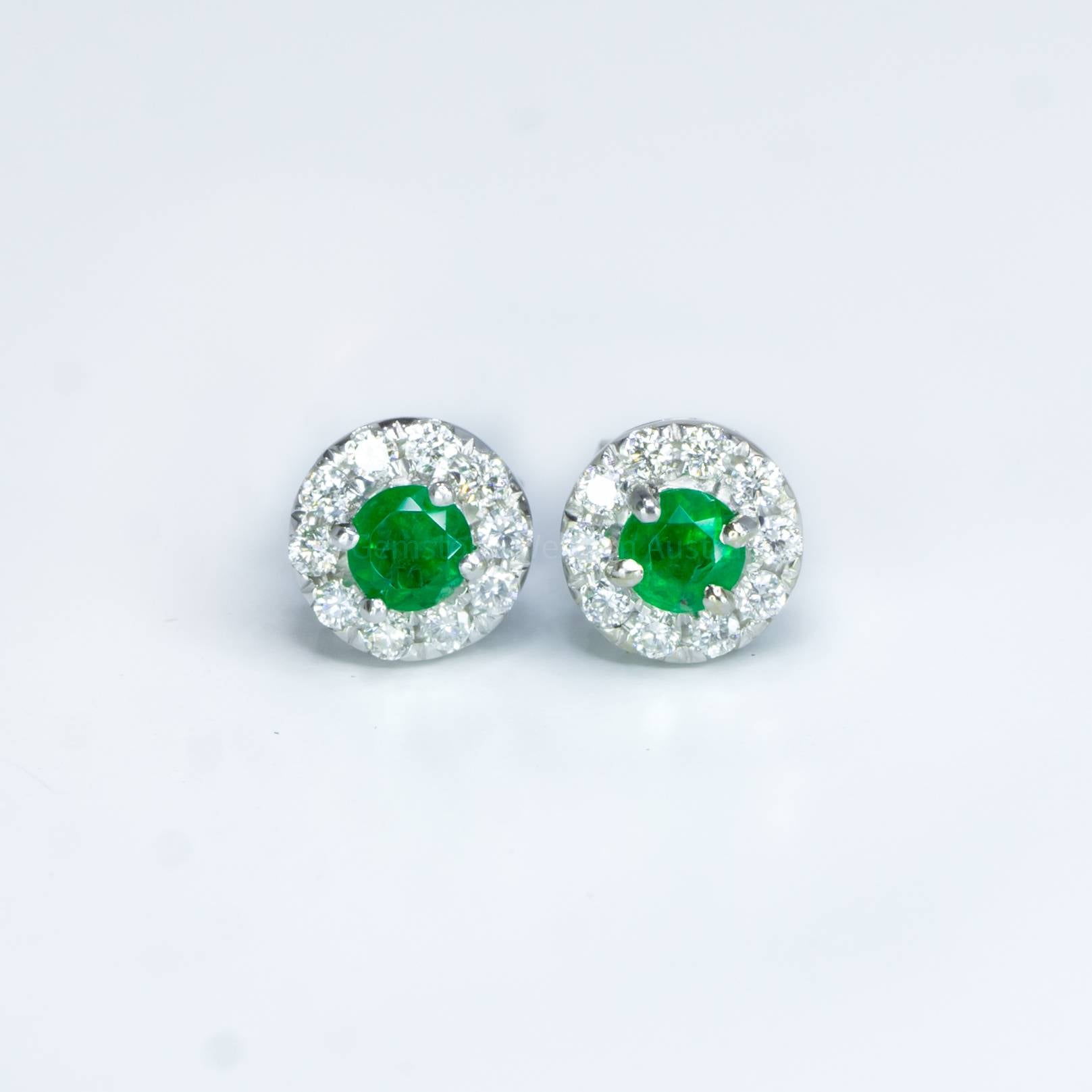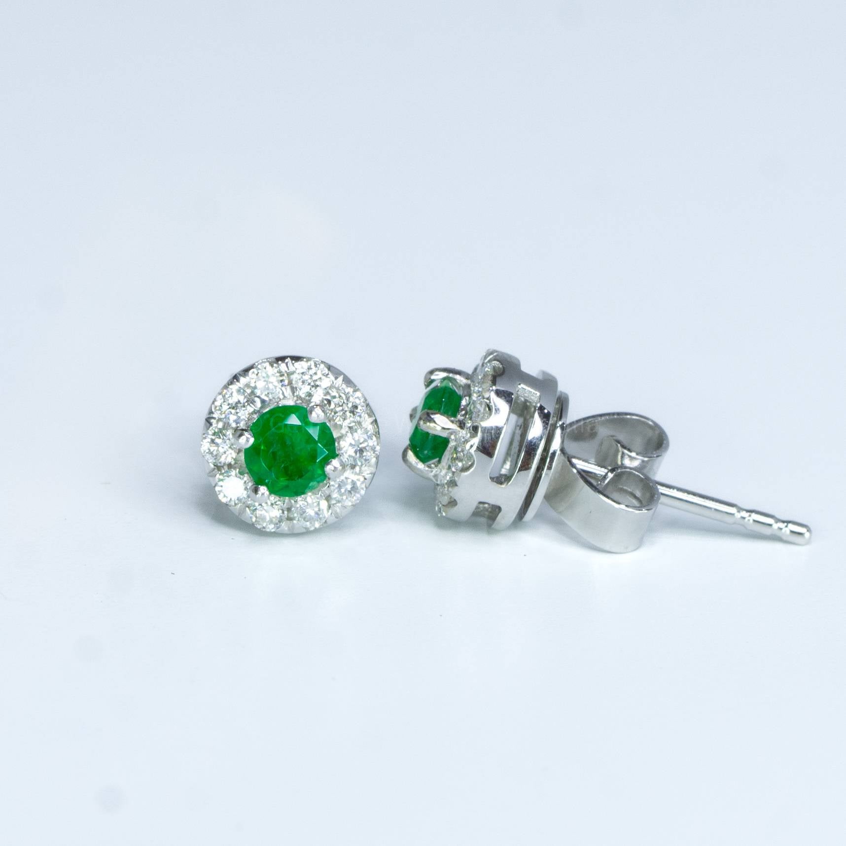 A beautiful and delicate pair of Colombian Emerald Diamond Studs Earrings showcase two beautiful round-cut natural Colombian emeralds surrounded by a halo of diamonds elegantly set in 18 carats of white gold. These stud earrings are the perfect piece of jewellery for everyday wear and will also stand out on special occasions for their sparkle and the vivid green colour of the central emeralds.  Explore our collection of 2000+ gems in stock, including Loose Emerald pairs. Can't find what you want? Contact us here for a wider selection. For custom designs, expert advice, and more information, book here a complimentary appointment with our expert gemologist and designers. SPECIFICATIONS: 1982511