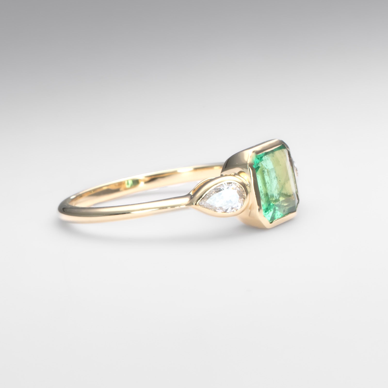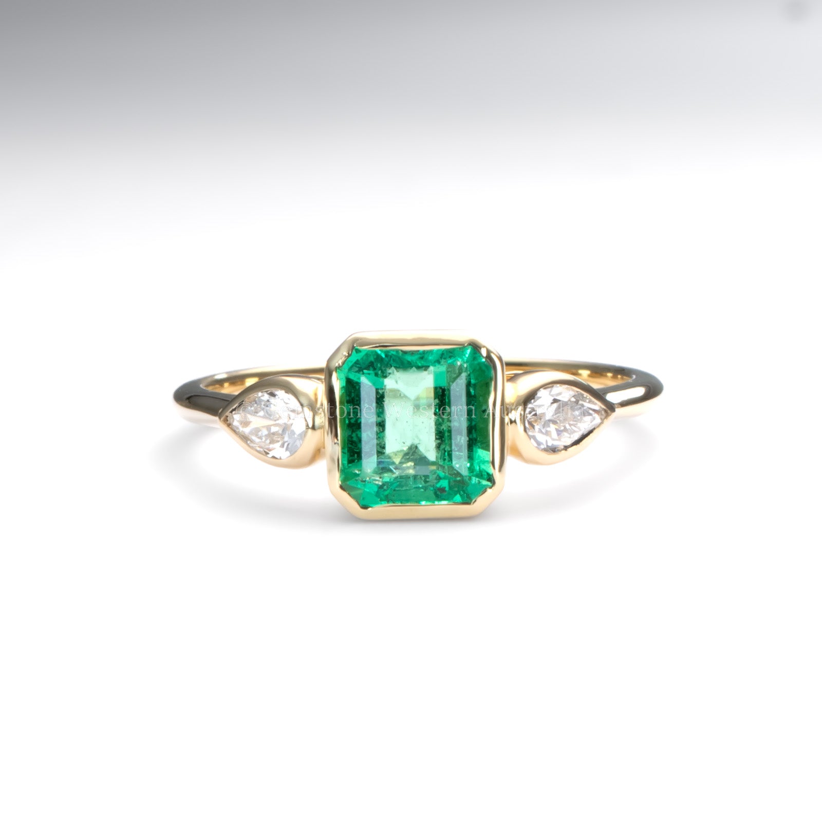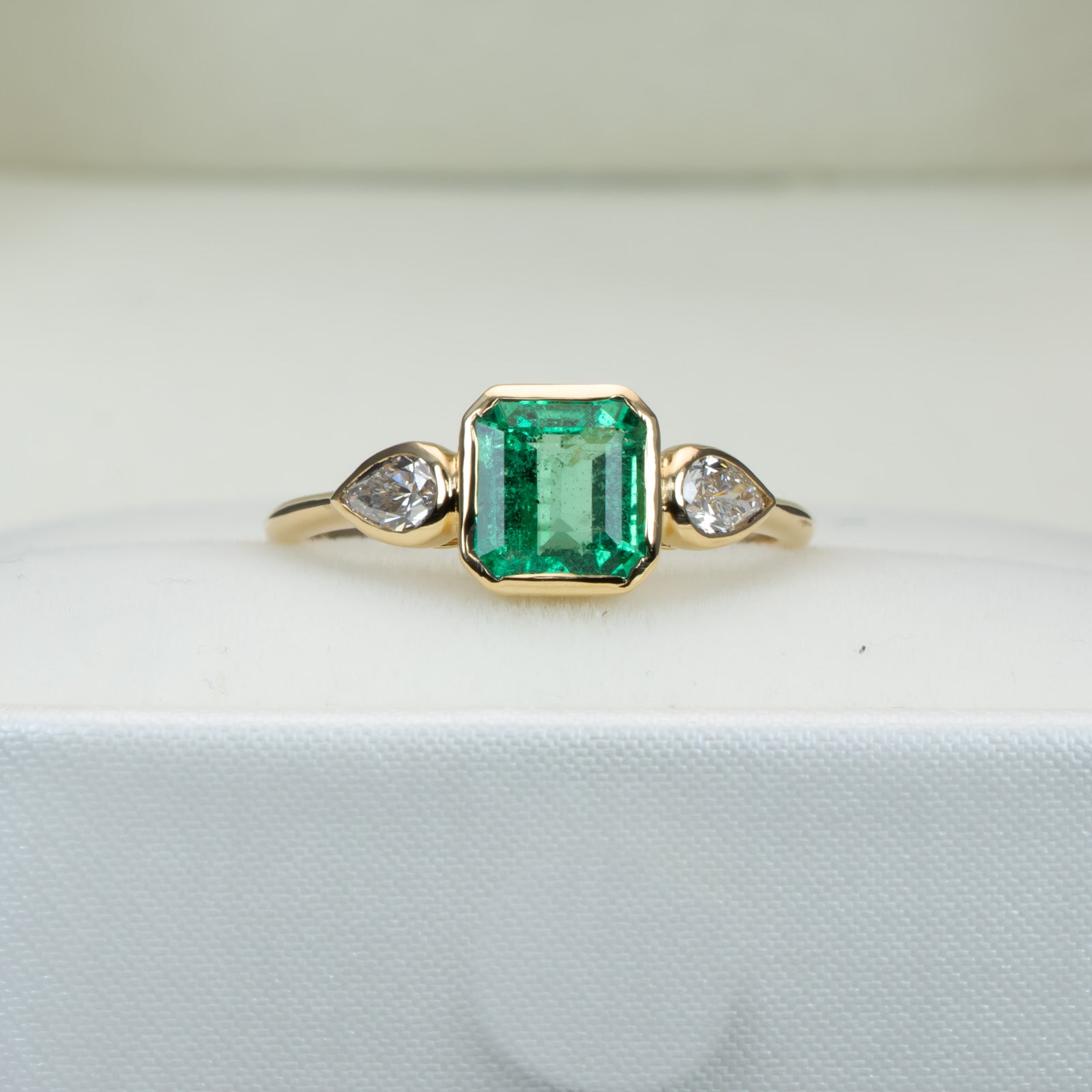 Colombian Emerald Engagement Ring Colombian emerald engagement ring crafted in rich 18K yellow gold and set with a vibrant 1.08ct natural emerald from Colombia. This emerald-cut gemstone is framed by two sparkling pear shape diamonds, all bezel set for a sleek and modern profile. The vivid green of the Colombian emerald, known for its exceptional quality and colour, pairs beautifully with the warm tone of yellow gold and the brilliance of the side diamonds. A timeless design with a contemporary edge, perfect for those who appreciate rare gemstones and refined craftsmanship. Explore our collection of 2000+ gems in stock, including Loose Emeralds. Can't find what you want? Contact us here for a wider selection. For custom designs, expert advice, and more information, book here a complimentary appointment with our expert gemologist and designers. SPECIFICATIONS: 1982871