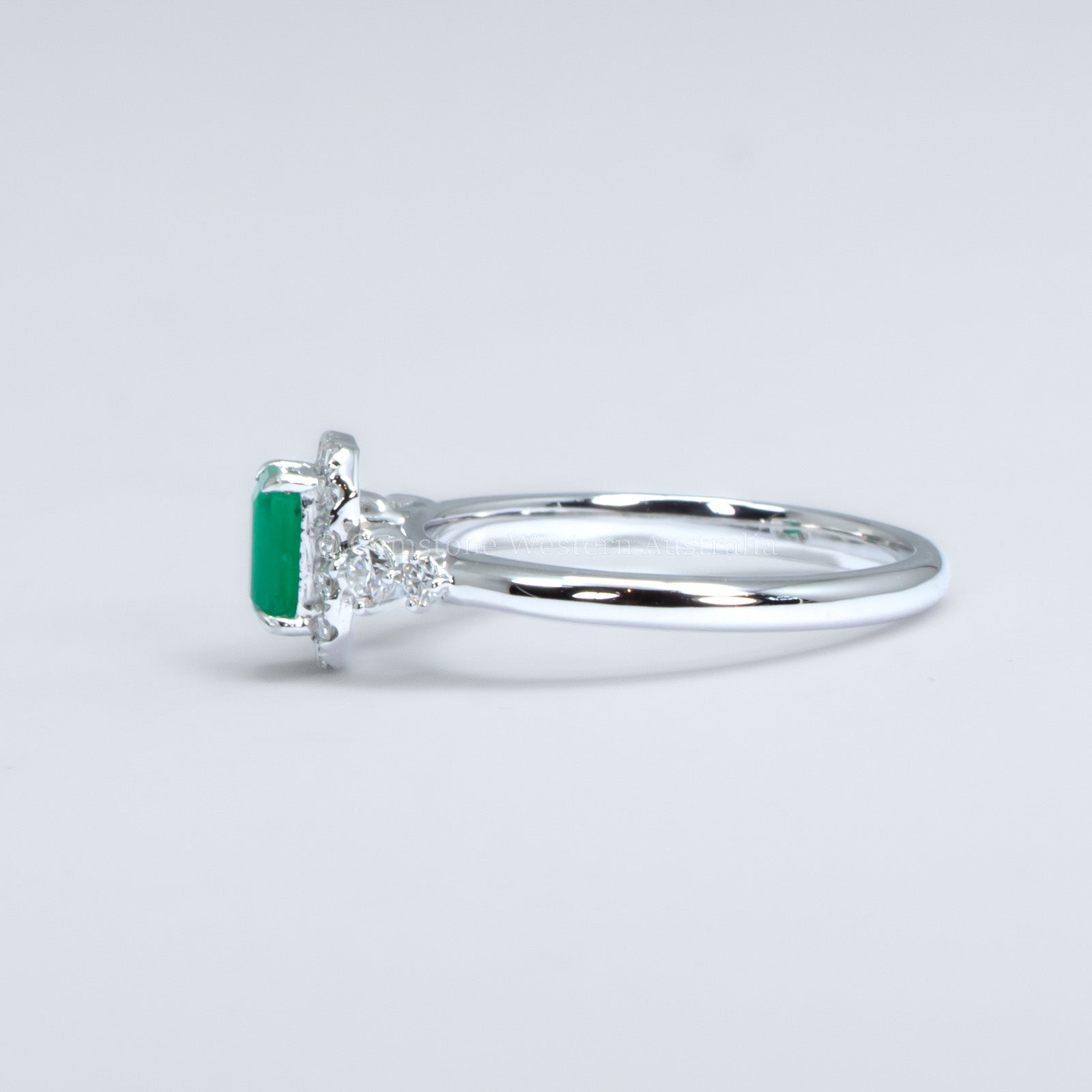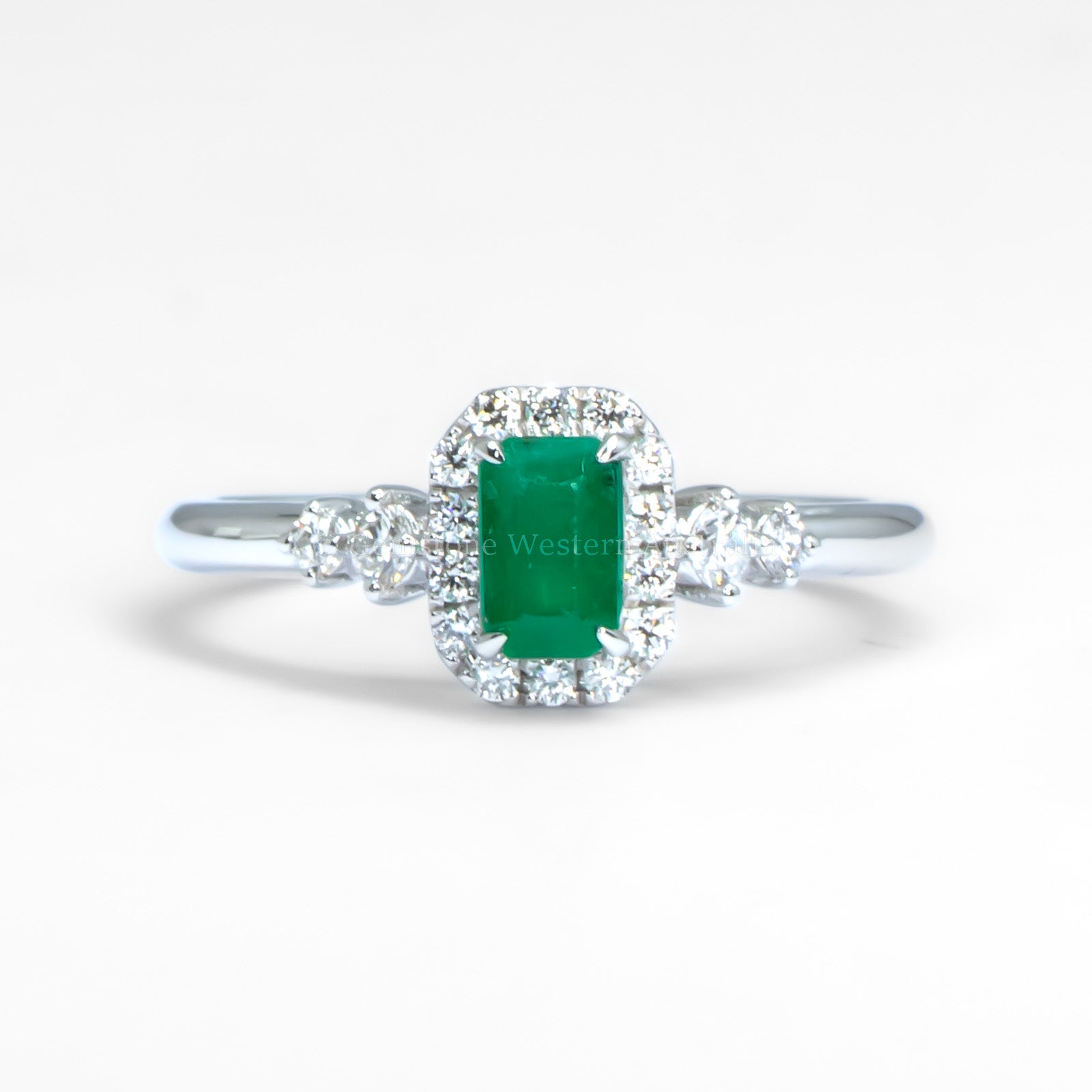 Colombian Emerald Halo Ring Colombian emerald halo ring crafted in luxurious Platinum 950, this timeless piece features a natural Colombian emerald at its centre. The elongated emerald cut gemstone is framed by a seamless halo of sparkling diamonds, perfectly following its octagonal shape. To each side of the halo, a pair of round brilliant cut diamonds in a compass-style setting adds an elegant detail to the band. Bold yet refined, this ring brings together heirloom quality and modern sophistication—ideal for those who appreciate the unmatched beauty and rarity of Colombian emeralds. Explore our collection of 2000+ gems in stock, including Loose Emeralds. Can't find what you want? Contact us here for a wider selection. For custom designs, expert advice, and more information, book here a complimentary appointment with our expert gemologist and designers.