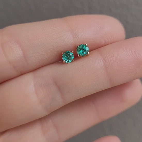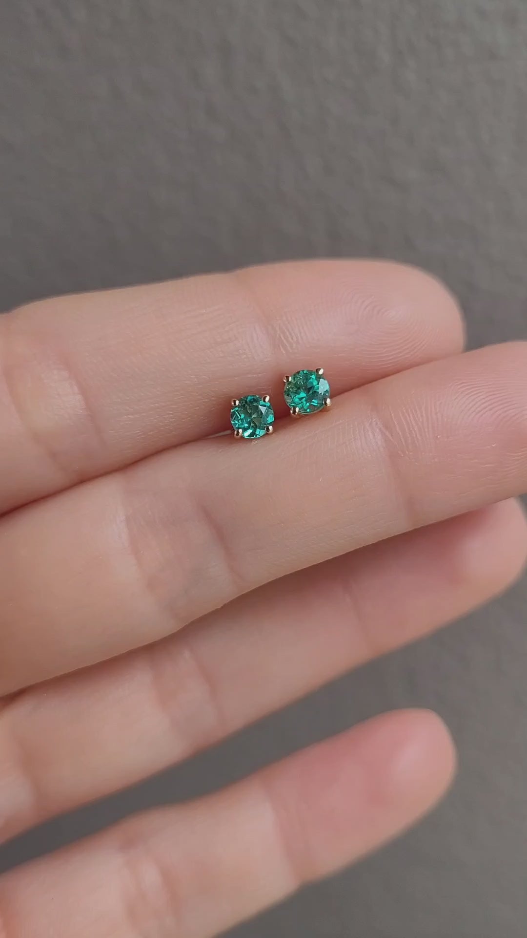 These elegant stud earrings feature two natural Colombian emeralds with a combined weight of 0.56 carat. Each round emerald is securely set in 18K yellow gold with a classic four-claw design that enhances the gemstone’s vivid green hue.