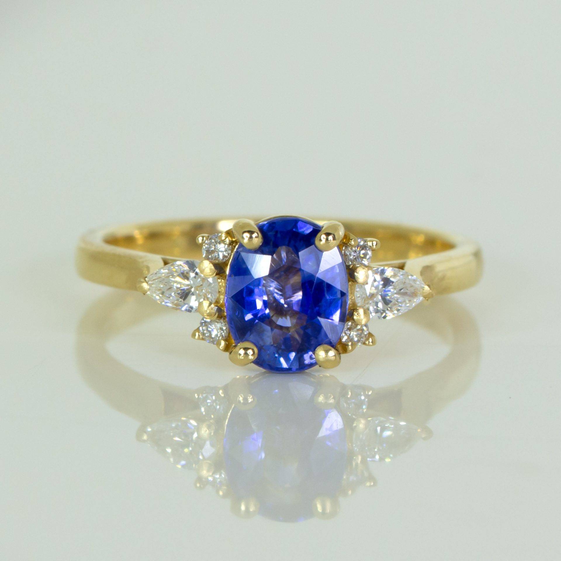 A contemporary Sapphire Ring presents a natural unheated sapphire set in between an arrangement of pear and round brilliant cut diamonds. The vibrant colour of the sapphire together with the brilliance of the diamonds makes this ring a captivating piece. This is a perfect ring for the everyday wear. *Item made to order. Specifications are a guide of a previous ring made to this design. Item can be customised.