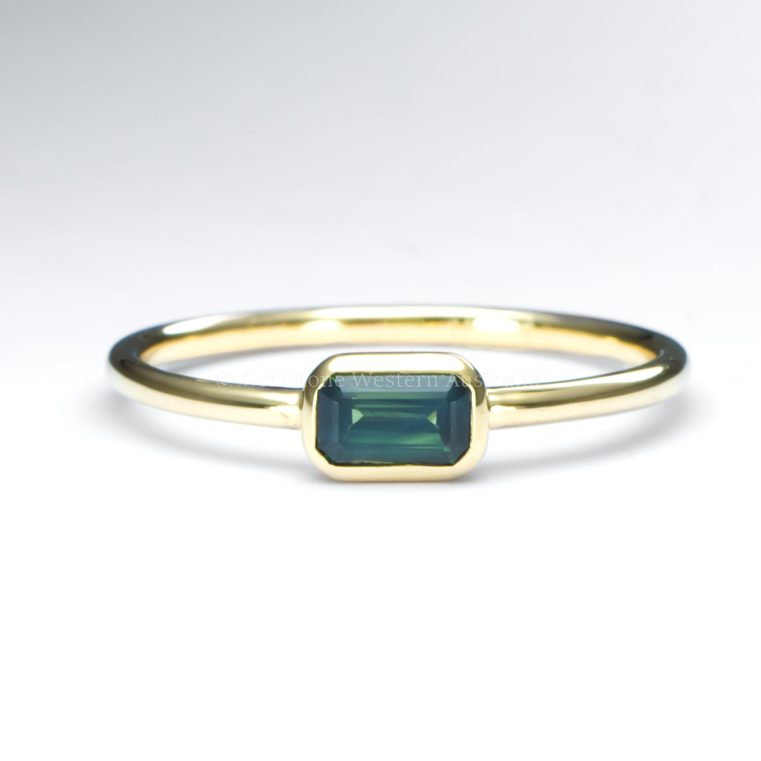 Dainty Solitaire Australian Teal Sapphire Ring – 9K Yellow or Rose Gold, Emerald Cut