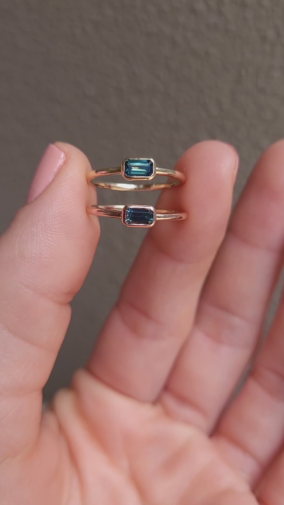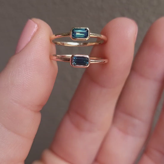 This petite and elegant solitaire ring features a natural Australian teal sapphire, emerald cut, set delicately in 9K gold. Each ring is crafted with a specific gemstone and metal combination, ensuring a unique piece of fine jewellery.