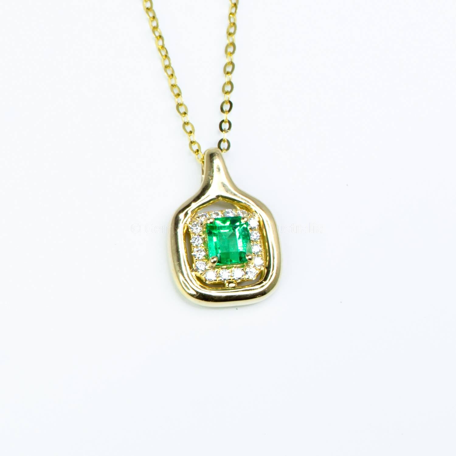A dainty and elegant Colombian Emerald and Diamonds Halo Pendant features a beautiful emerald cut vivid green natural Colombian emerald claw set at the centre of a square halo of diamonds in yellow gold. The natural emerald and diamonds are surrounded by a yellow-gold edge that converts to a veil at the top of the pendant.  Explore our collection of 2000+ gems in stock, including Loose Emeralds. Can't find what you want? Contact us here for a wider selection. For custom designs, expert advice, and more information, book here a complimentary appointment with our expert gemologist and designers.
