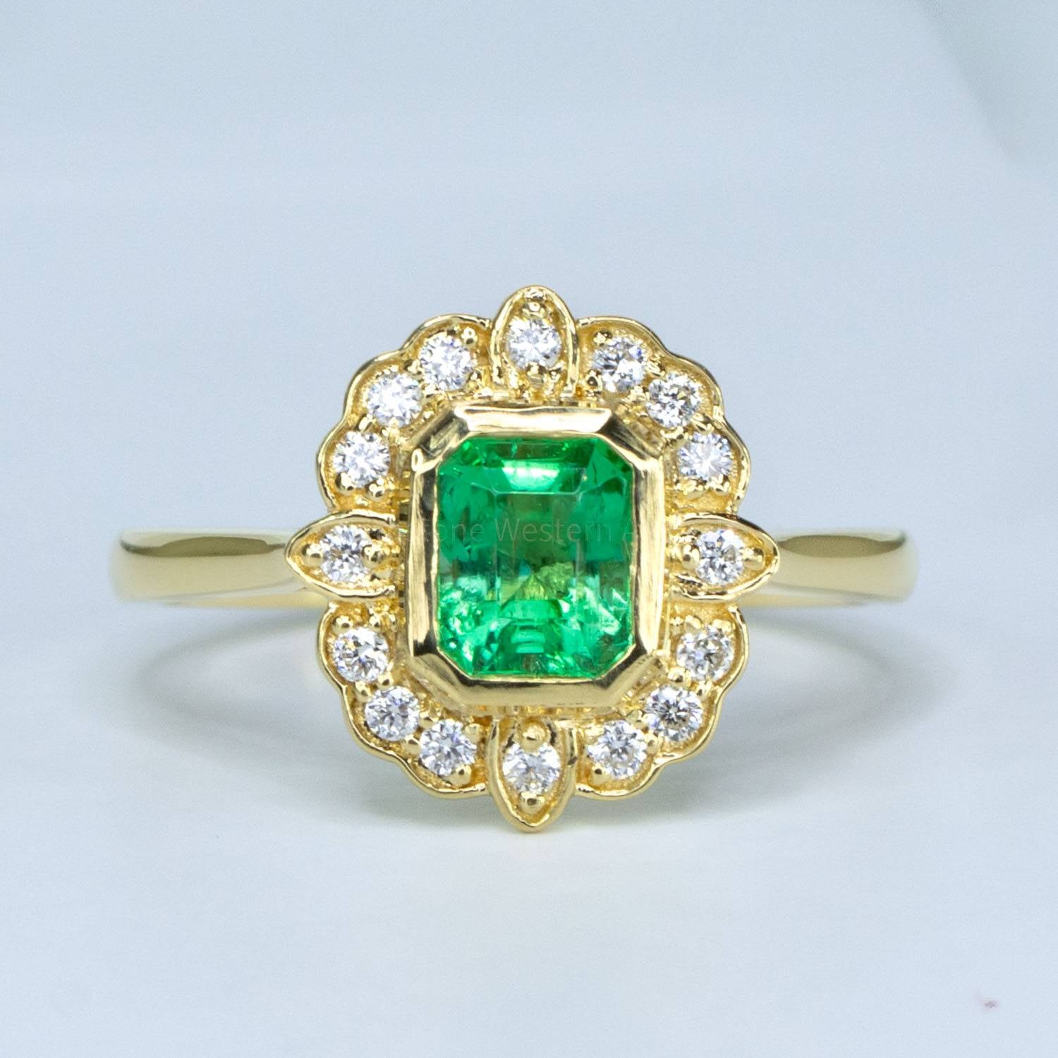 Crafted from 18 carats of yellow gold, the Emerald Cut Colombian Emerald and Diamonds Ring boasts a unique Art Deco-inspired setting that is sure to turn heads. This stunning ring showcases a natural Colombian emerald, cut in an elegant emerald shape, with remarkable clarity and vivid medium-green color that catches the eye. The breathtaking gemstone is further enhanced by a halo of round brilliant cut diamonds arranged in a striking Art Deco style, making this ring a true statement piece. Whether you're looking to add a touch of luxury to your everyday wardrobe or searching for the perfect piece for a special occasion, this ring is sure to leave a lasting impression. Explore our collection of 2000+ gems in stock, including Loose Emeralds. Can't find what you want? Contact us here for a wider selection. For custom designs, expert advice, and more information, book here a complimentary appointment with our expert gemologist and designers.   *Item made to order. Specifications are a guide of a previous ring made to this design. Item can be customised.