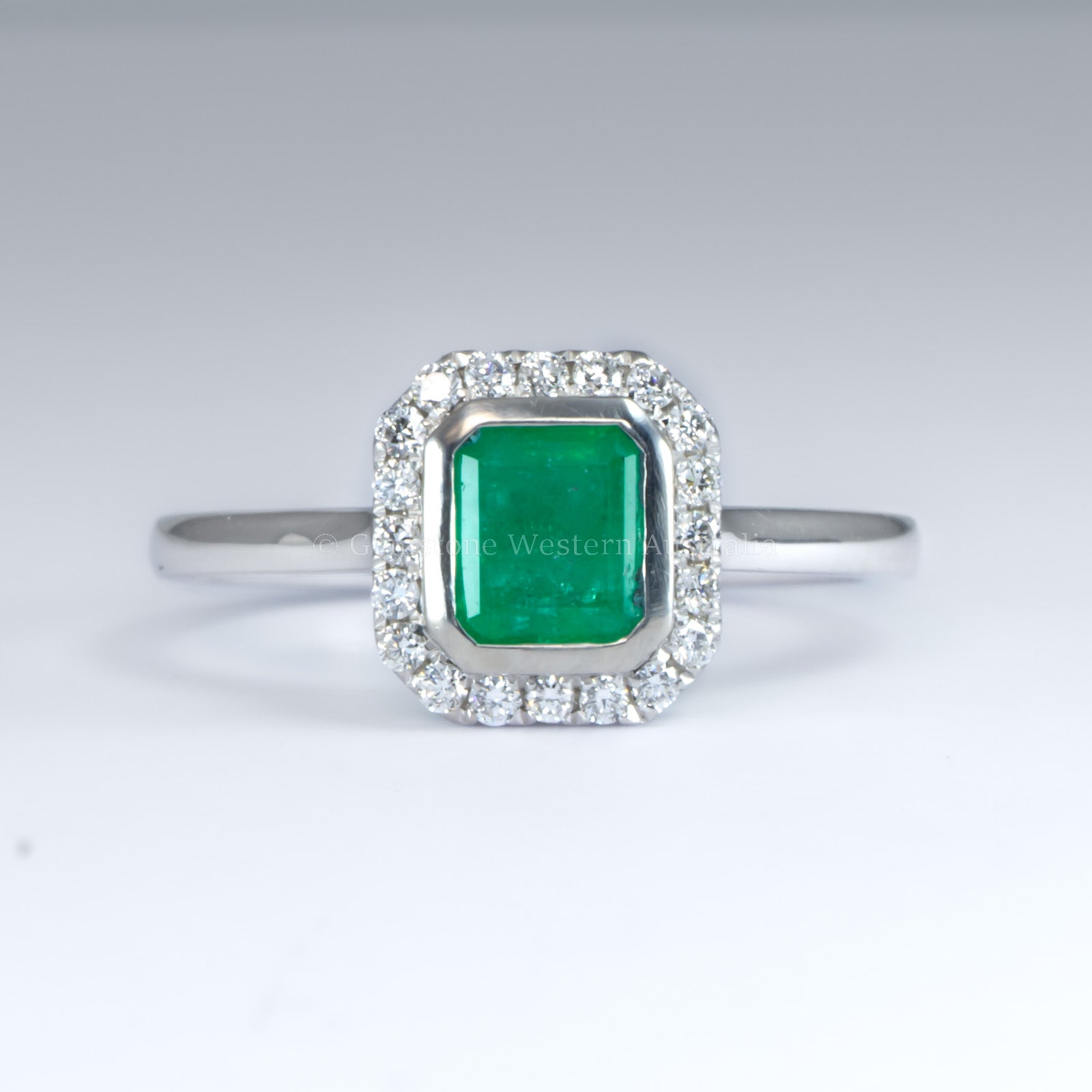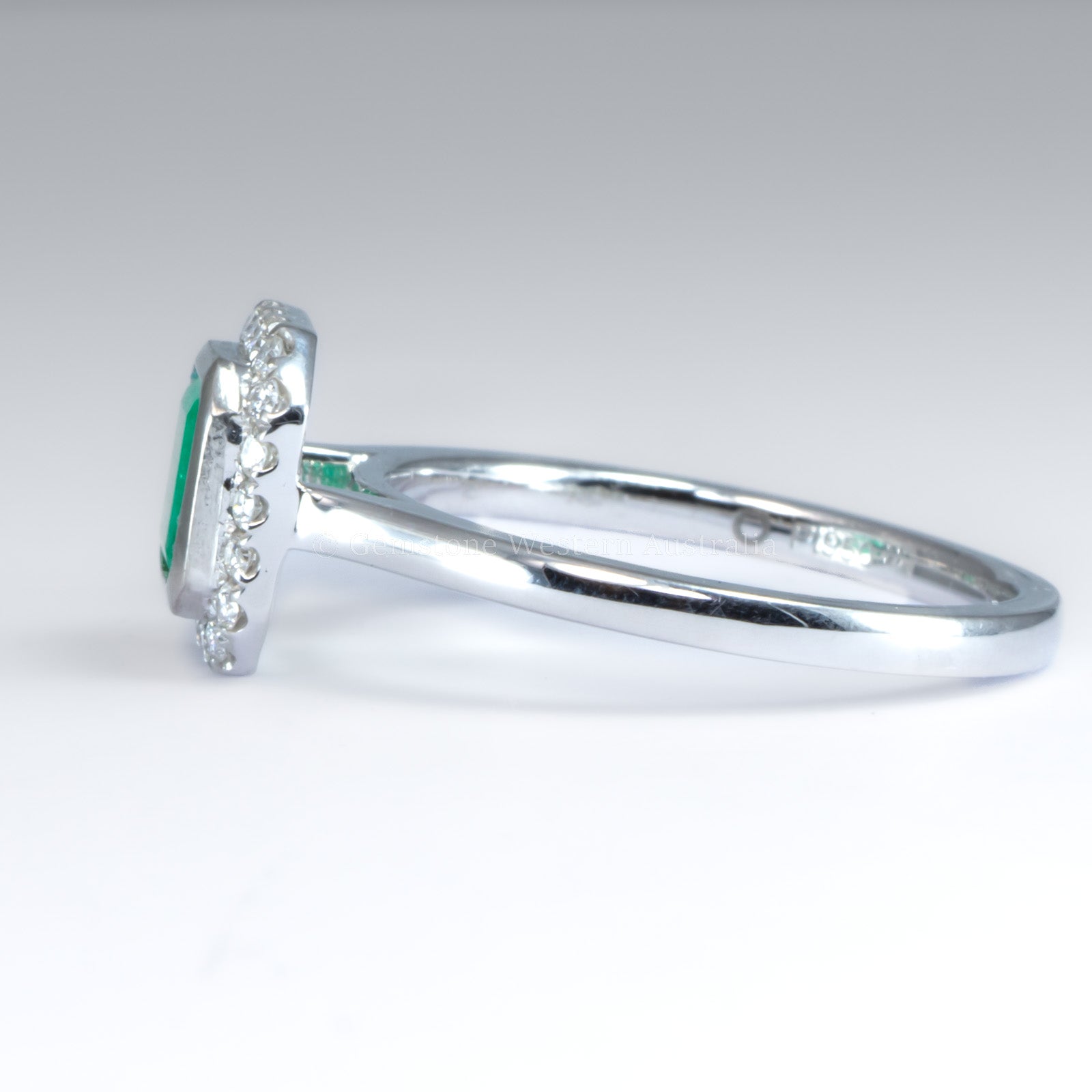 Emerald Cut Colombian Emerald Ring Emerald Cut Colombian Emerald Ring highlights a 0.74ct emerald cut Colombian emerald, bezel set in platinum and encircled by a dazzling diamond halo. This refined design emphasises the unique beauty and elegance of the natural Colombian emerald, making it a true statement piece. Explore our collection of 2000+ gems in stock, including Loose Emeralds. Can't find what you want? Contact us here for a wider selection. For custom designs, expert advice, and more information, book here a complimentary appointment with our expert gemologist and designers.