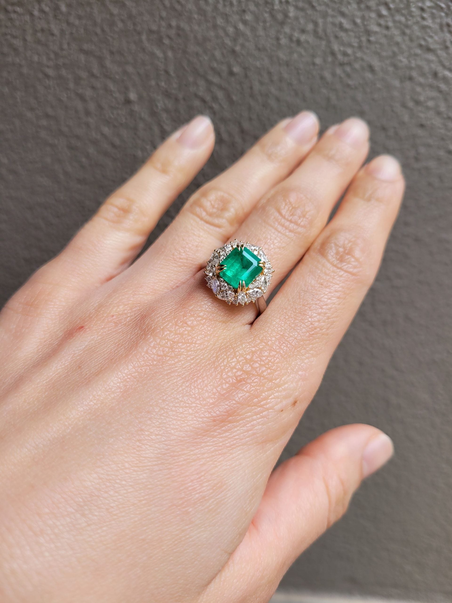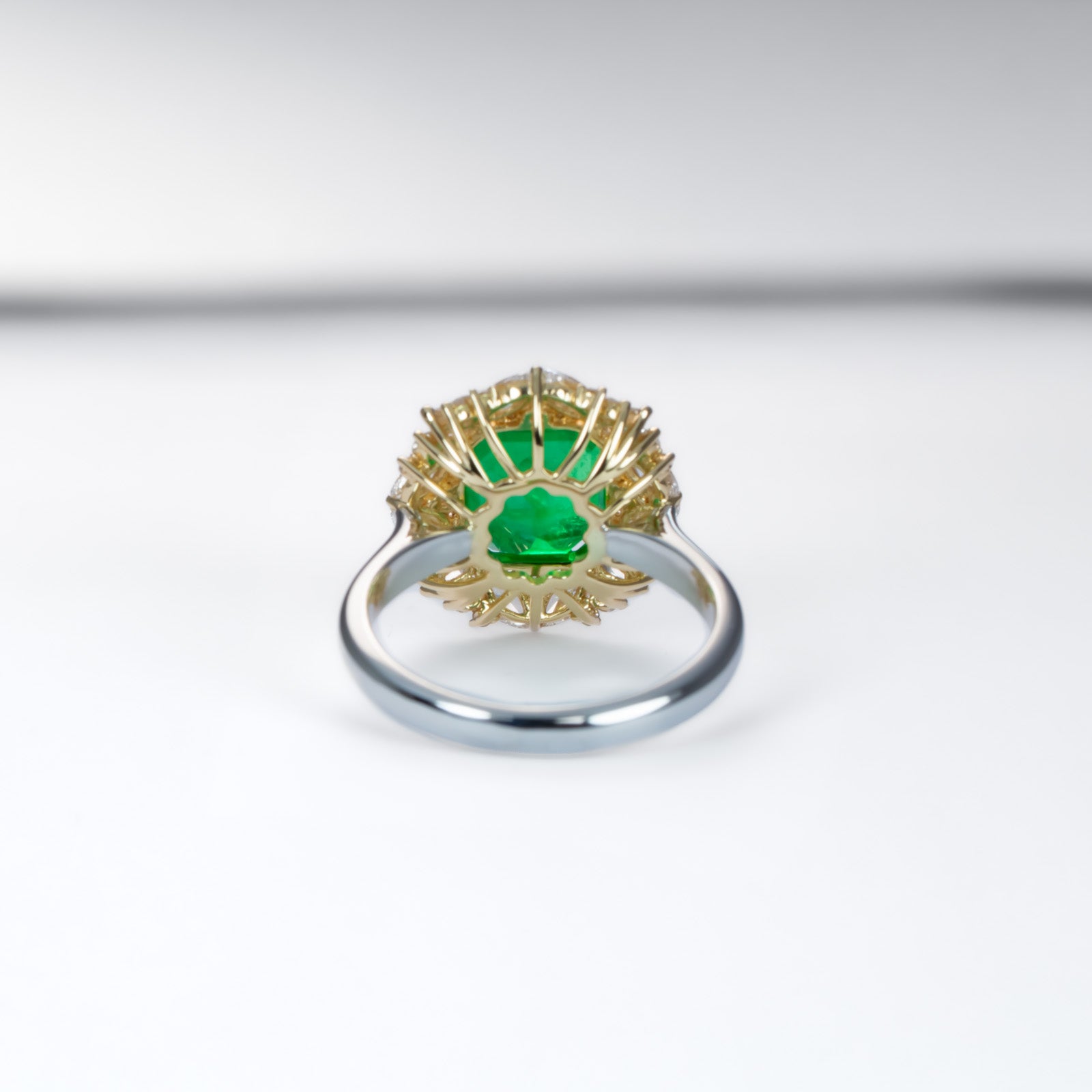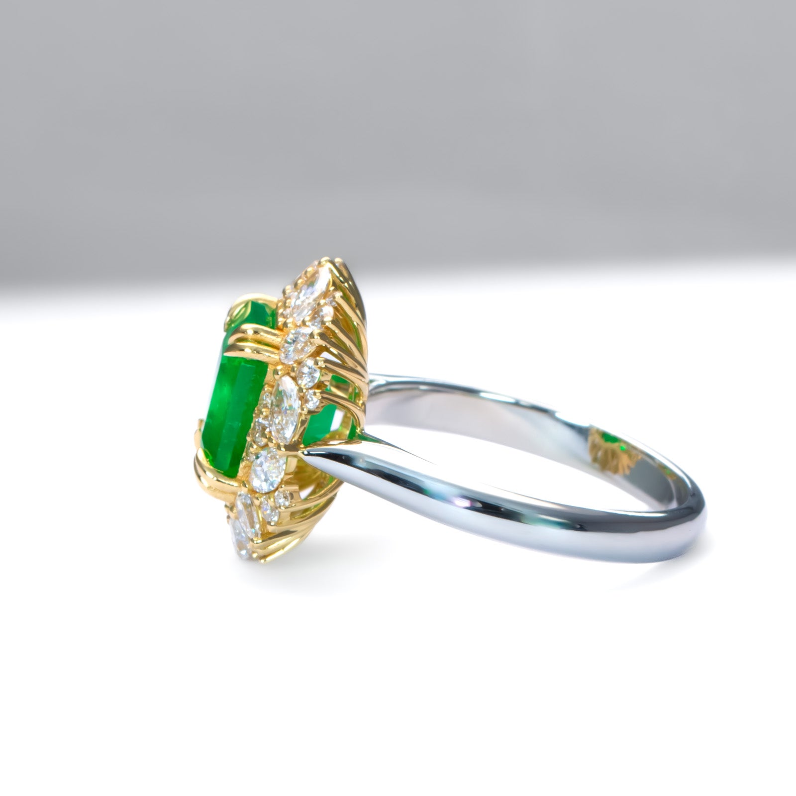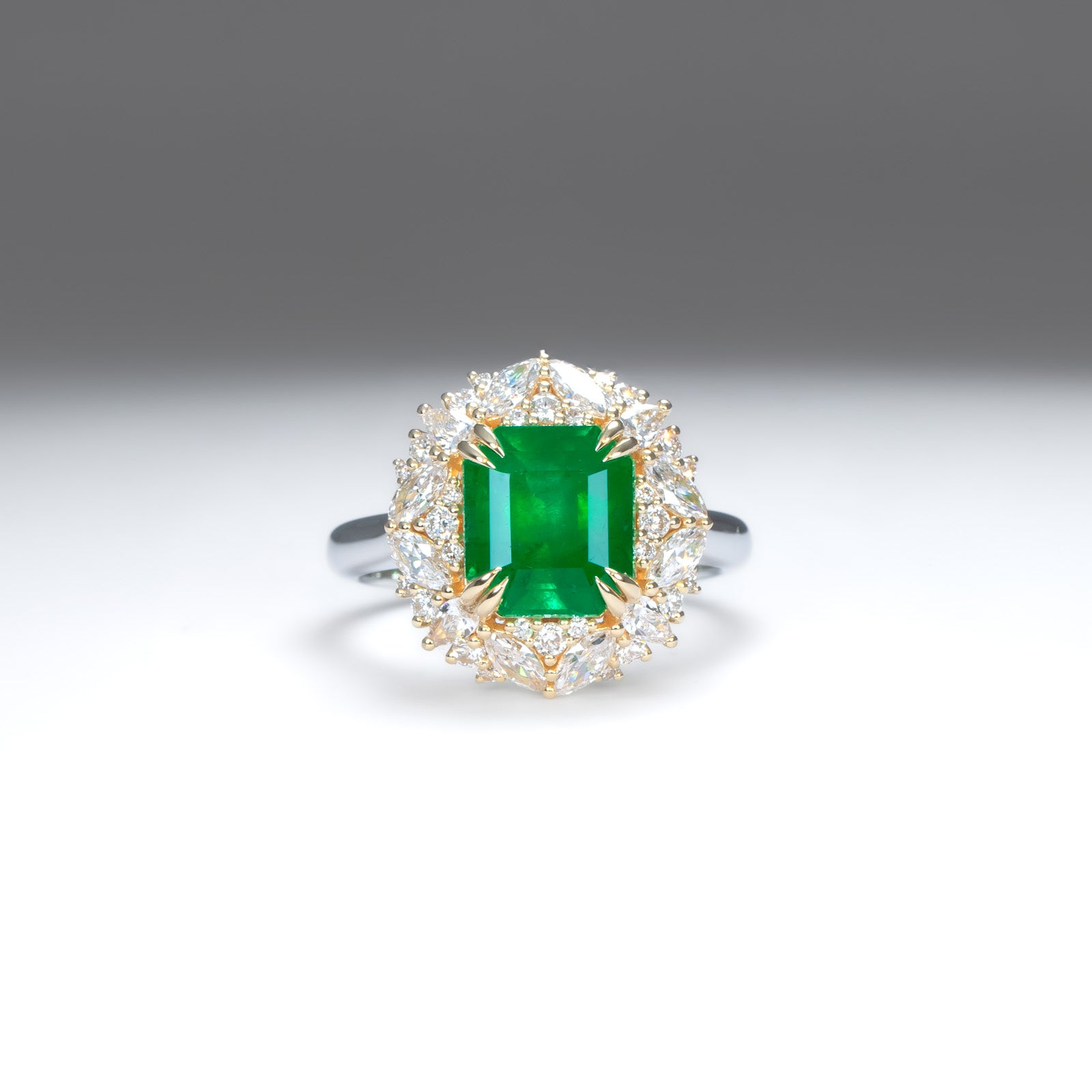Emerald Statement Ring Emerald statement ring showcasing a vivid Colombian emerald, chosen for its rich green hue and natural beauty. This exceptional gemstone is framed by a sculptural diamond halo, composed of marquise cut, pear cut, and round brilliant cut diamonds. The dynamic arrangement creates texture and brilliance, enhancing the emerald’s colour and capturing the light from every angle. The under-rail and gallery are formed in 18K yellow gold, adding warmth and contrast to the design. A platinum 950 band completes the ring, offering strength, durability, and a sleek finish. Handcrafted with care, this one-of-a-kind piece is a timeless expression of bold elegance. Explore our collection of 2000+ gems in stock, including Loose Emeralds. Can't find what you want? Contact us here for a wider selection. For custom designs, expert advice, and more information, book here a complimentary appointment with our expert gemologist and designers.