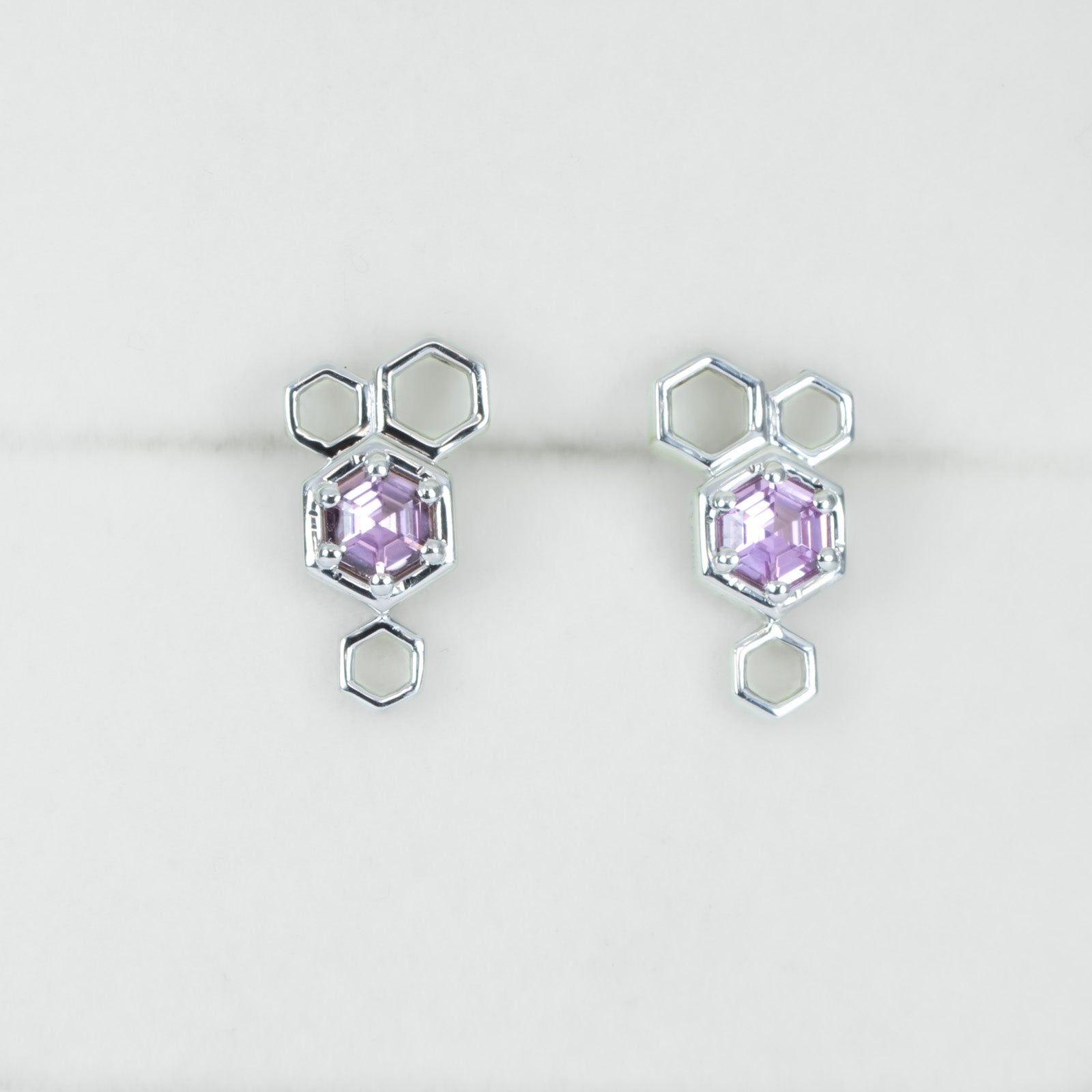 Hexagon Pink Sapphire Earrings in Platinum with Honeycomb Design