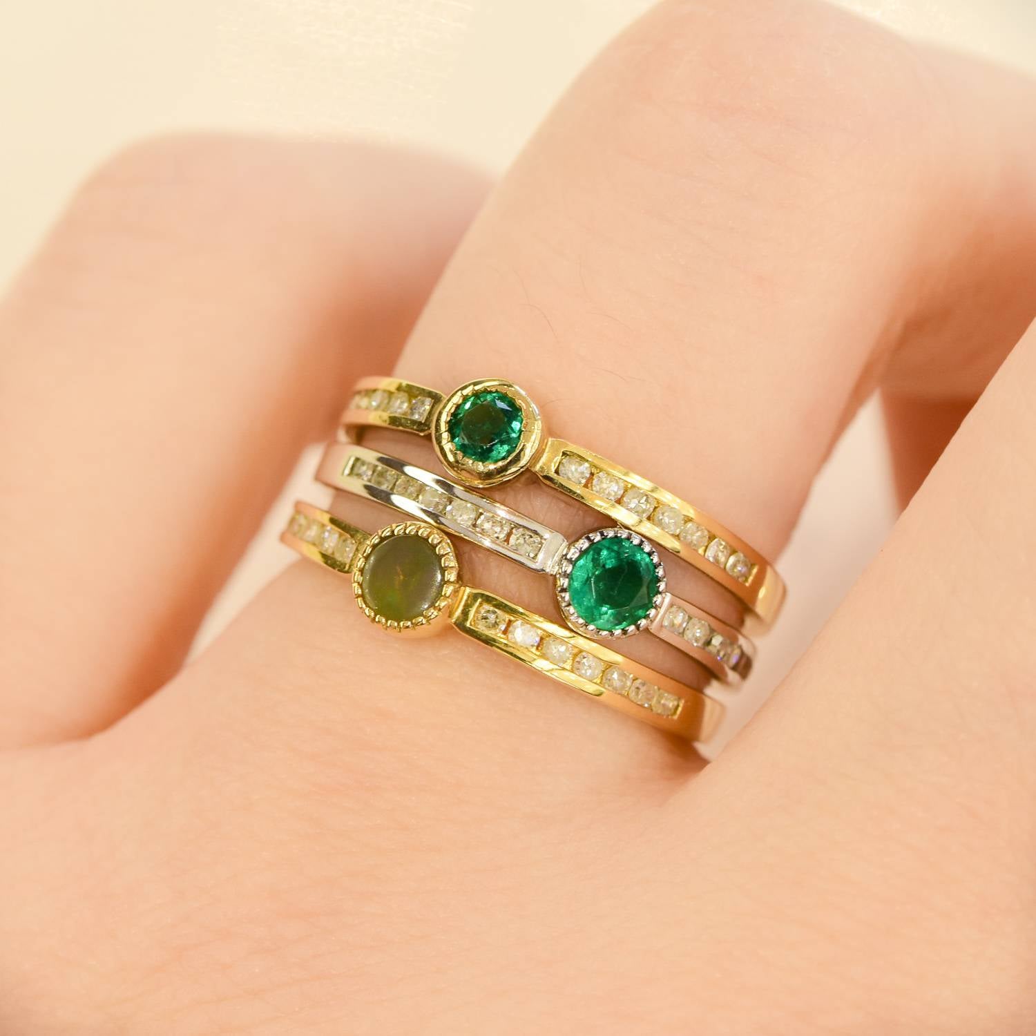 A dainty Colombian Emerald Diamonds Stackable Ring in 10k gold stackable features a centre round cut Colombian Emerald bezel set accented with 14 channel set diamonds (7 to each side of the emerald). This ring is the perfect gift and beautiful addition to your stackable rings collection, great for everyday wearing. Explore our collection of 2000+ gems in stock, including Loose Emeralds. Can't find what you want? Contact us here for a wider selection. For custom designs, expert advice, and more information, book here a complimentary appointment with our expert gemologist and designers.