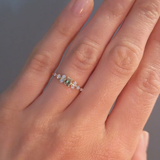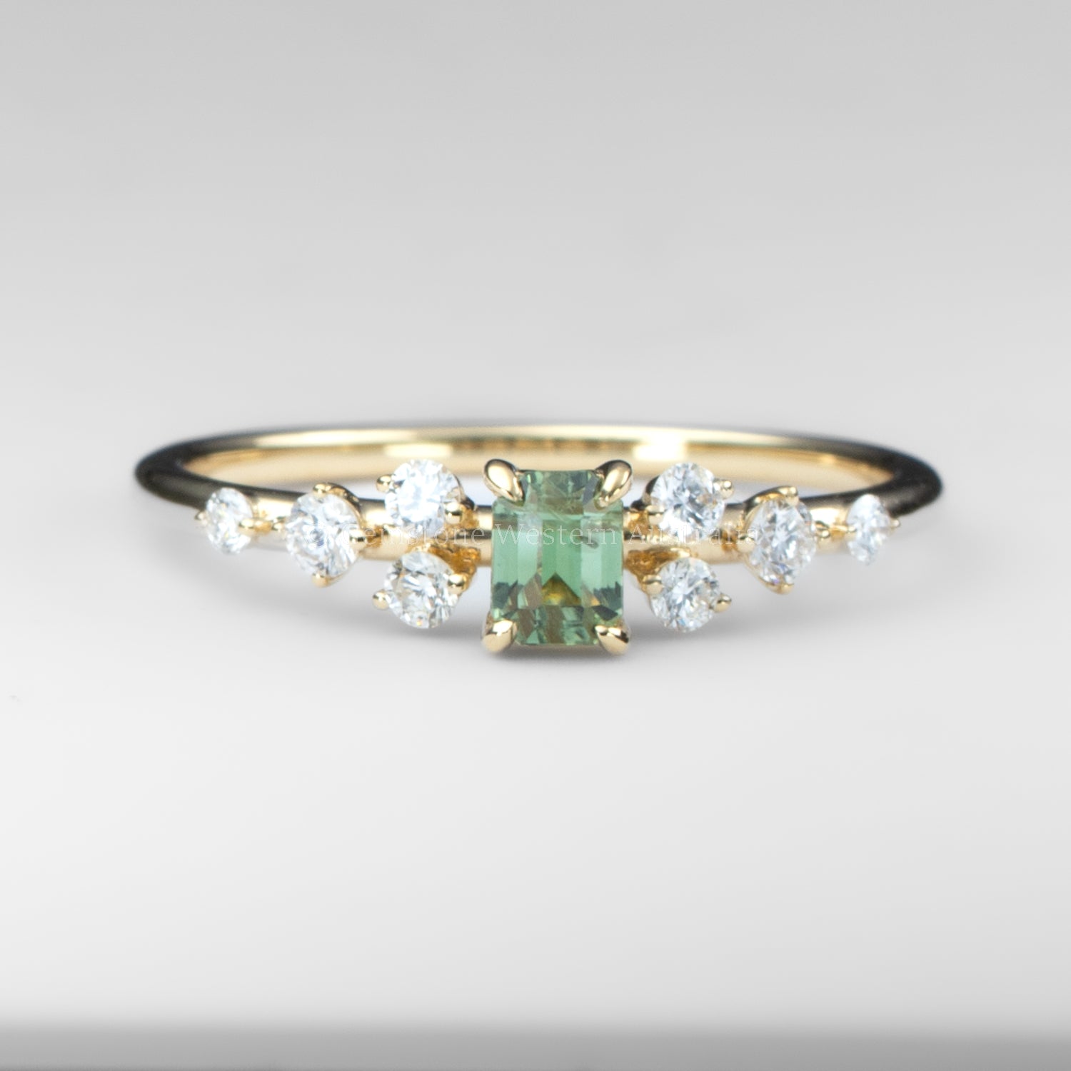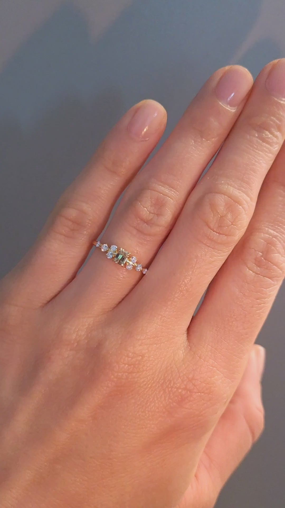 This petite and elegant ring features a natural alexandrite, emerald cut, weighing 0.26ct, flanked by sparkling natural diamonds and set in 18K yellow gold. Its delicate design highlights the unique beauty of alexandrite, a rare and captivating gemstone known for its subtle colour change under different lighting.
