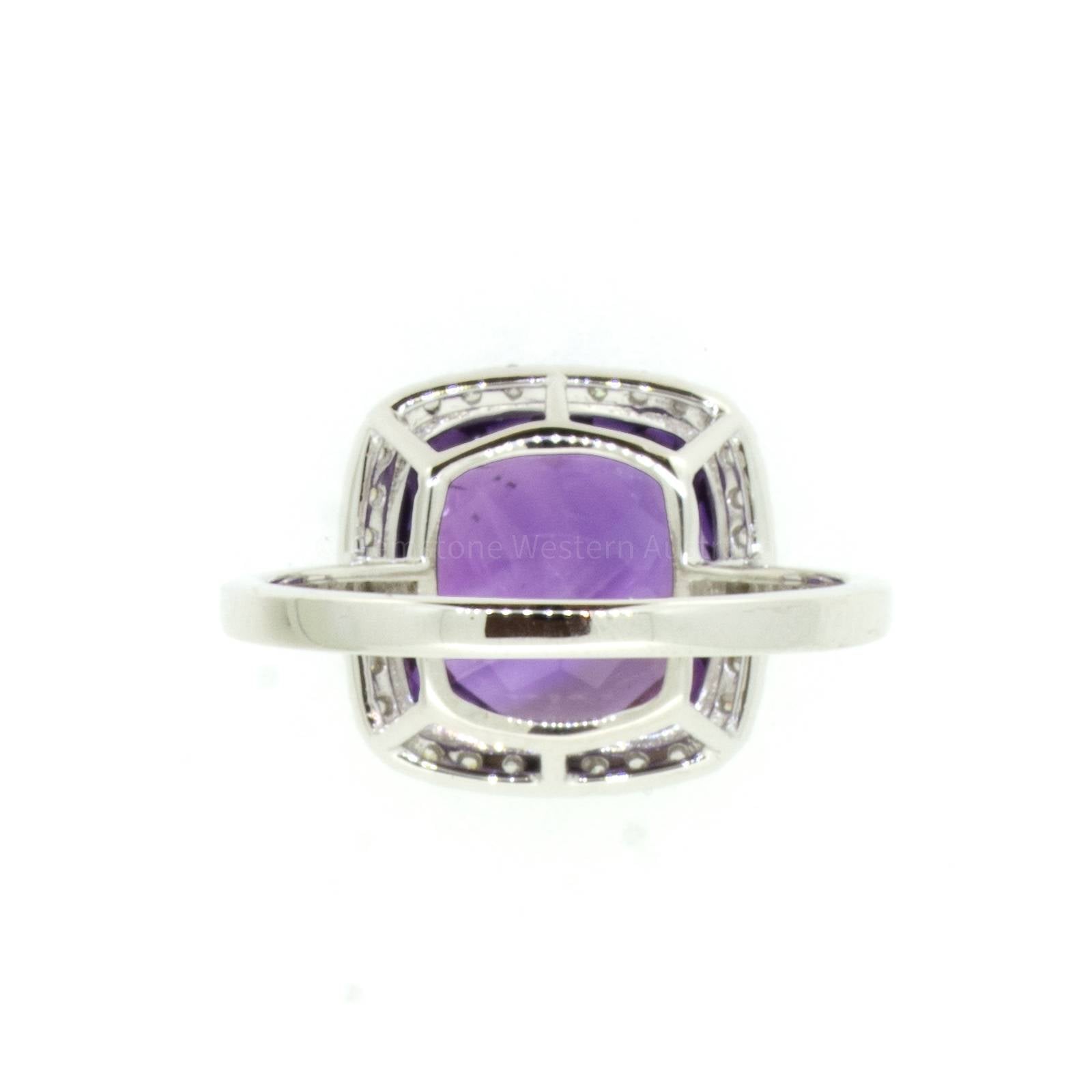 This stunning Natural Amethyst and Diamond Ring in 18ct White Gold features a vivid cushion cut natural amethyst as a centre stone. The amethyst is adorned by a halo of sparkling diamonds that frames the gemstone beautifully. Diamond accents cascade down the shoulders of the 18k white gold Natural Amethyst and Diamond Ring for extra sparkle. SPECIFICATIONS: 1982358 Central stone: One cushion cut natural amethyst. 11.0x11.0x7.0mm approx. Side Stones:  46 Round cut Diamonds. Material: 18K white gold. Total Weight: 3.70 grams approx. Ring Size: 7 or N.   Our family-owned business is built on generations of expertise, bringing together gemmologists, miners, and dealers who specialise in natural emeralds and coloured gemstones. With boutiques in the heart of the emerald world - Bogotá, Colombia - and Perth, Australia, we offer over 40 years of experience and expert guidance you can trust. We take great pride in our craftsmanship and are committed to ensuring our customers understand the true value and authenticity of every piece they purchase. For those seeking something truly unique, we also offer custom jewellery services to bring your vision to life.