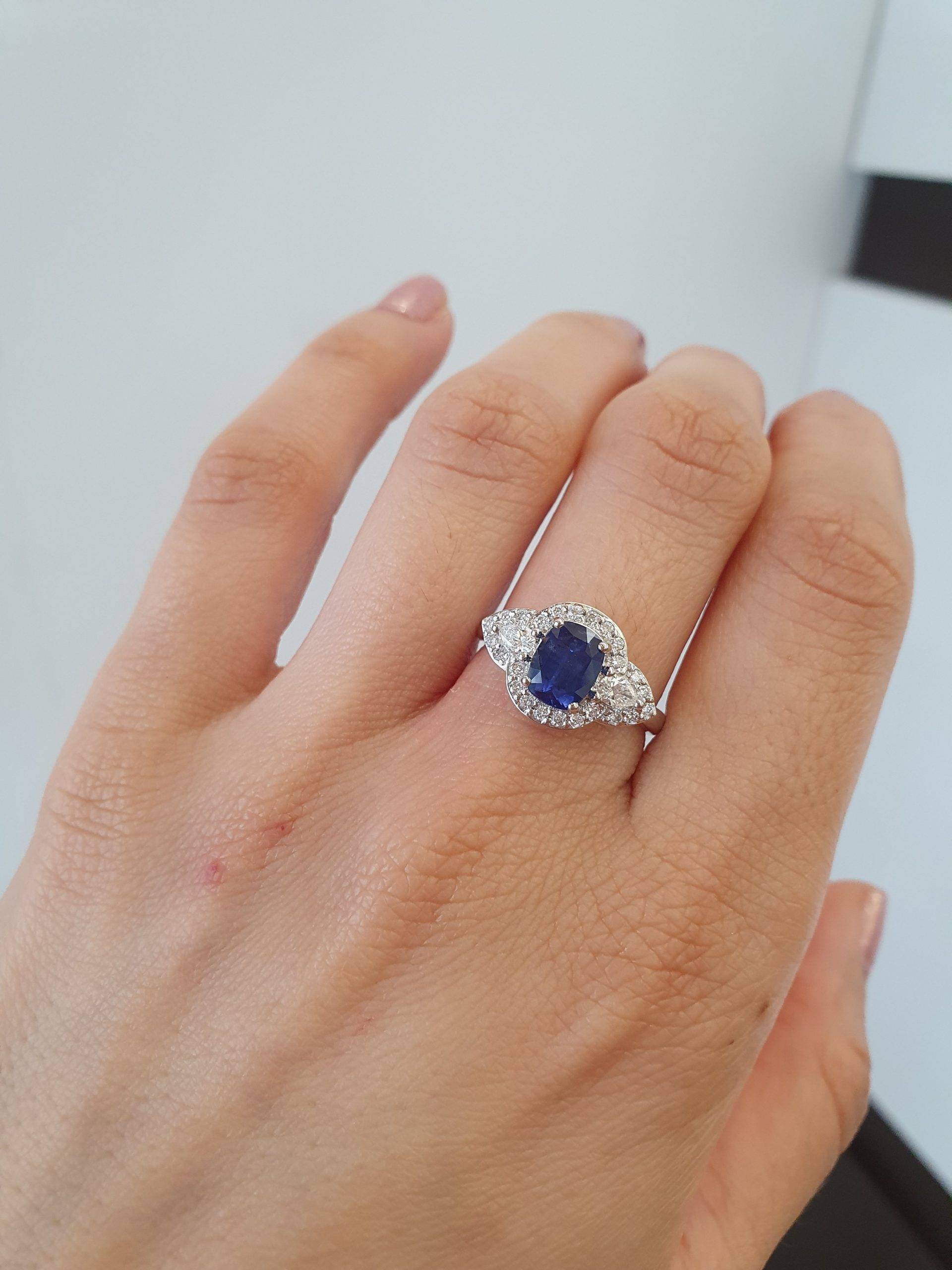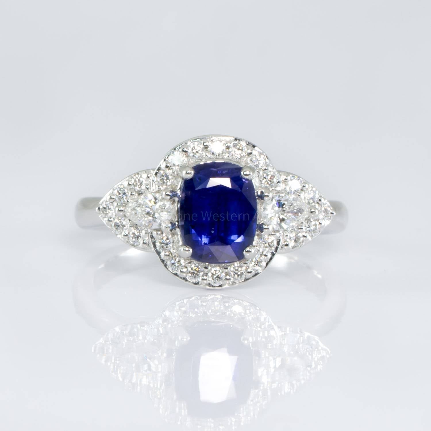 A spectacular Sapphire and Diamonds Cluster Ring presents a beautiful 1.65 carat natural blue sapphire with gorgeous royal blue colour and a second reflection of purplish hues. The sapphire is flanked by a pair of pear-shaped diamonds. The three-stone arrangement is further adorned by a halo of round brilliant cut diamonds that complement the design. Explore our collection of 2000+ gems in stock, including Loose Sapphires. Can't find what you want? Contact us here for a wider selection. For custom designs, expert advice, and more information, book here a complimentary appointment with our expert gemologist and designers.