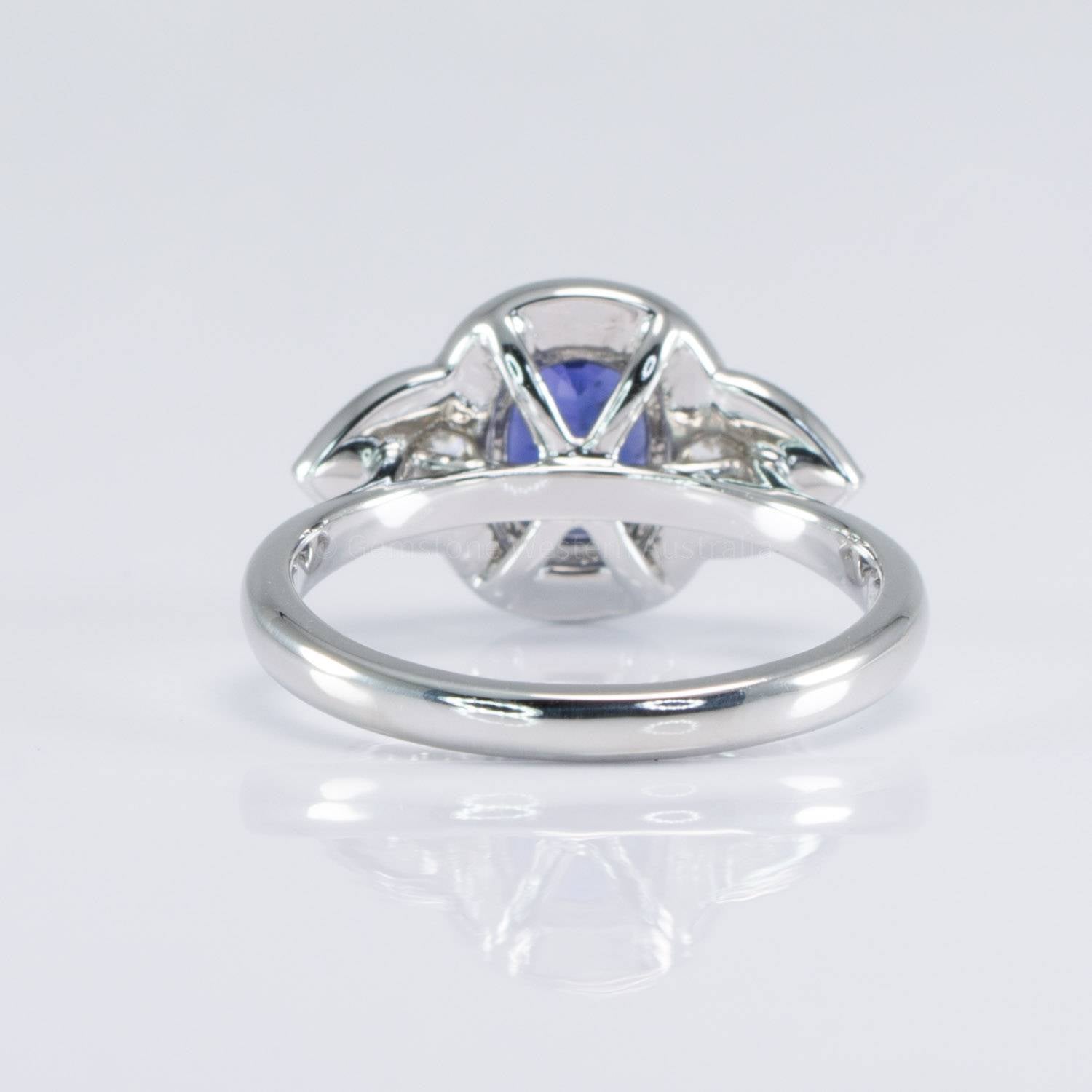 • Central stone: Cushion cut, natural, royal blue sapphire, 7.45 x 5.80mm. Weight: 1.65ct.