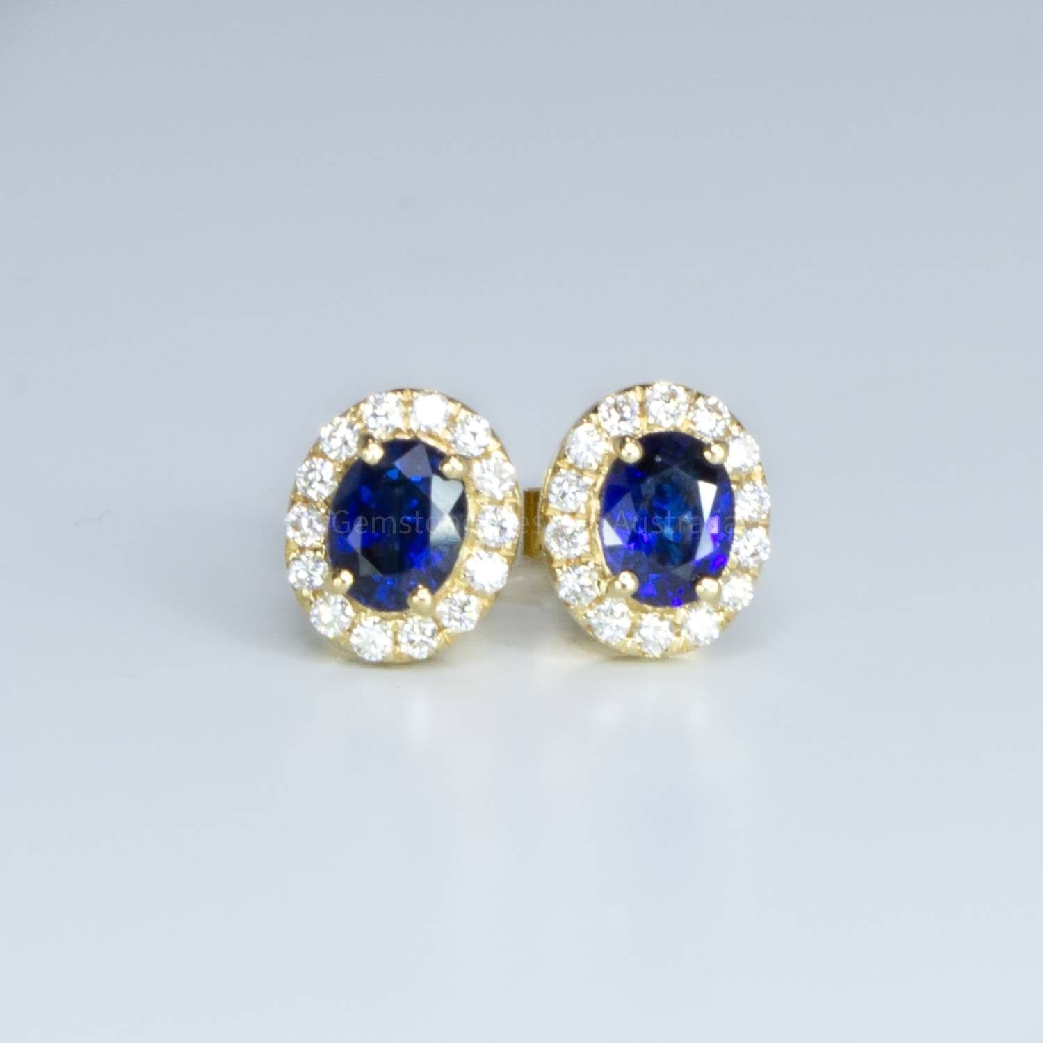 A timeless pair of Blue Sapphire Stud Earrings showcase two oval cut natural sapphires of royal blue colour surrounded by a delicate halo of round cut diamonds. The stud earrings are made in 18 carats yellow gold, they perfect for special occasions as well as for the everyday.