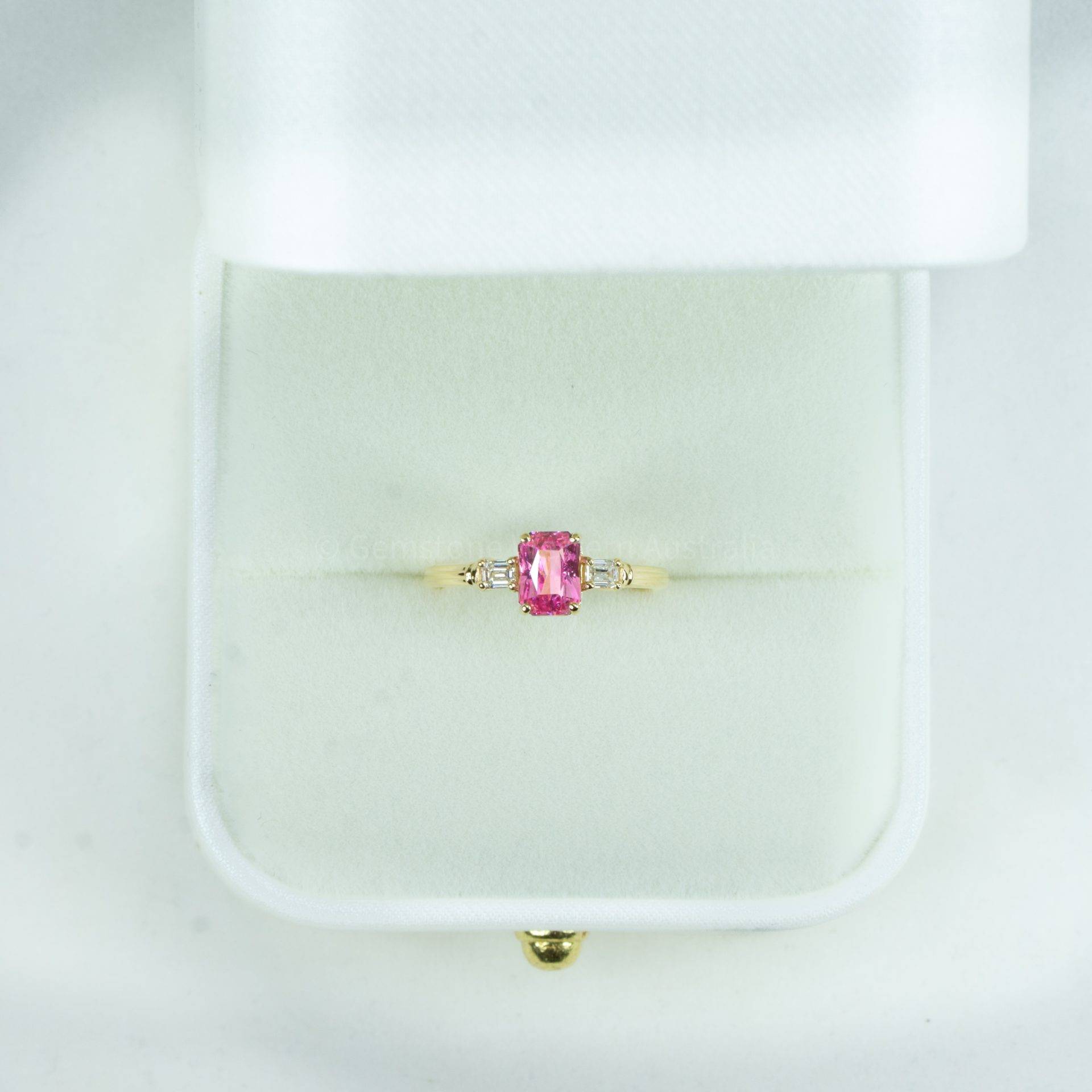• Central stone: Natural padparadscha sapphire, radiant mix cut. Measures: 6.64 x 4.91 x 3.63mm. Weight: 1.20ct.