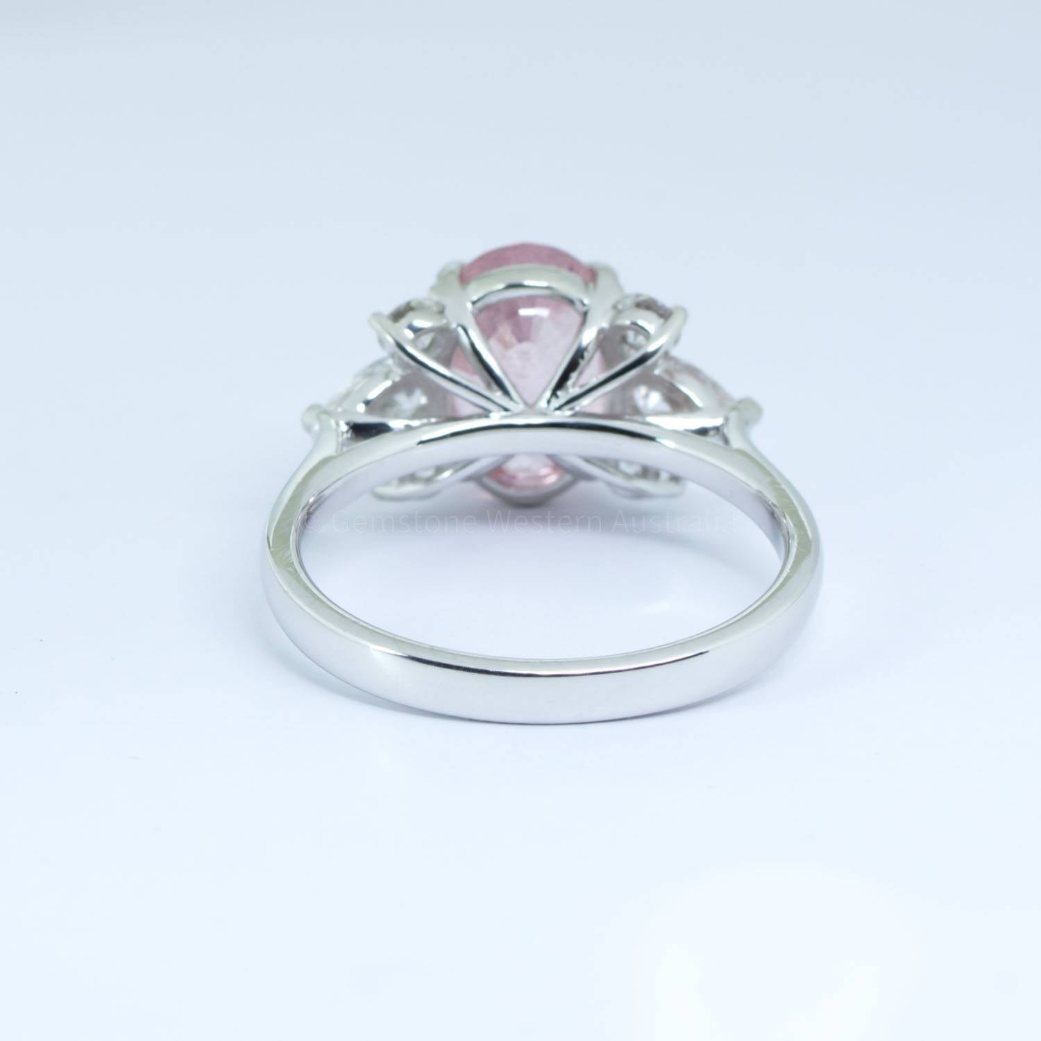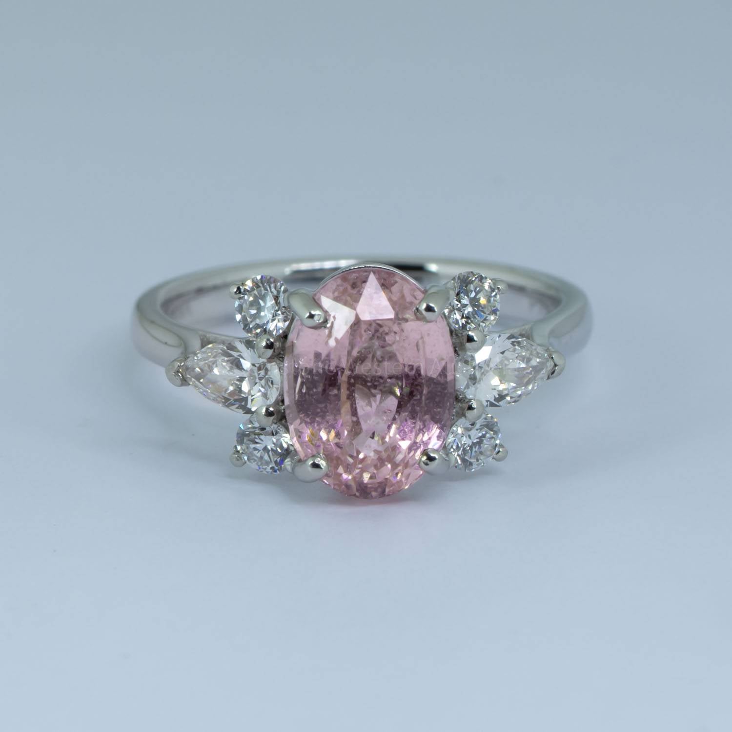 • Central stone: Natural unheated padparadscha sapphire, oval mix cut. Measures: 9.88 x 7.27 x 5.40mm. Weight: 3.55ct.