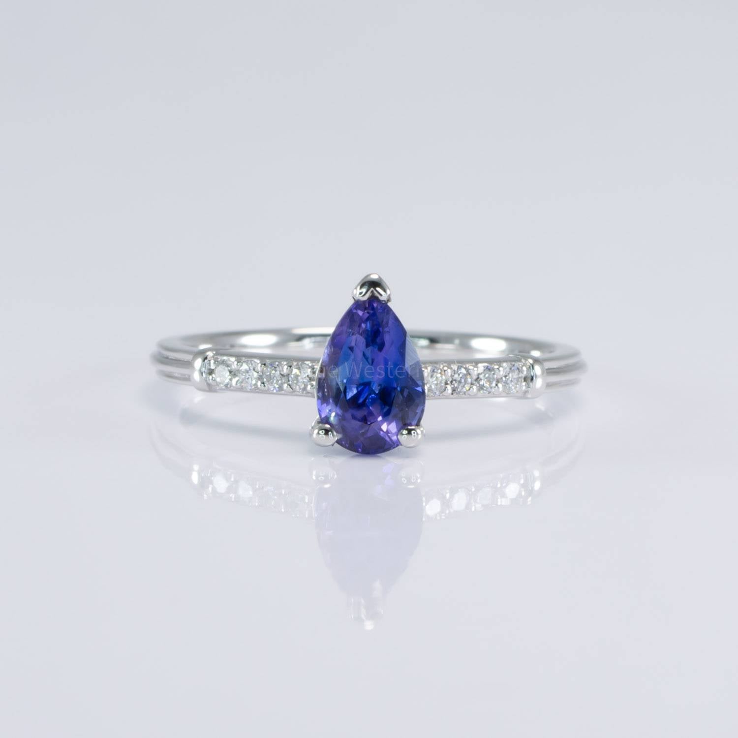 • Central stone: Pear cut, natural, blue/purple sapphire, 7.2 x 4.7mm. Weight: 1.01ct.