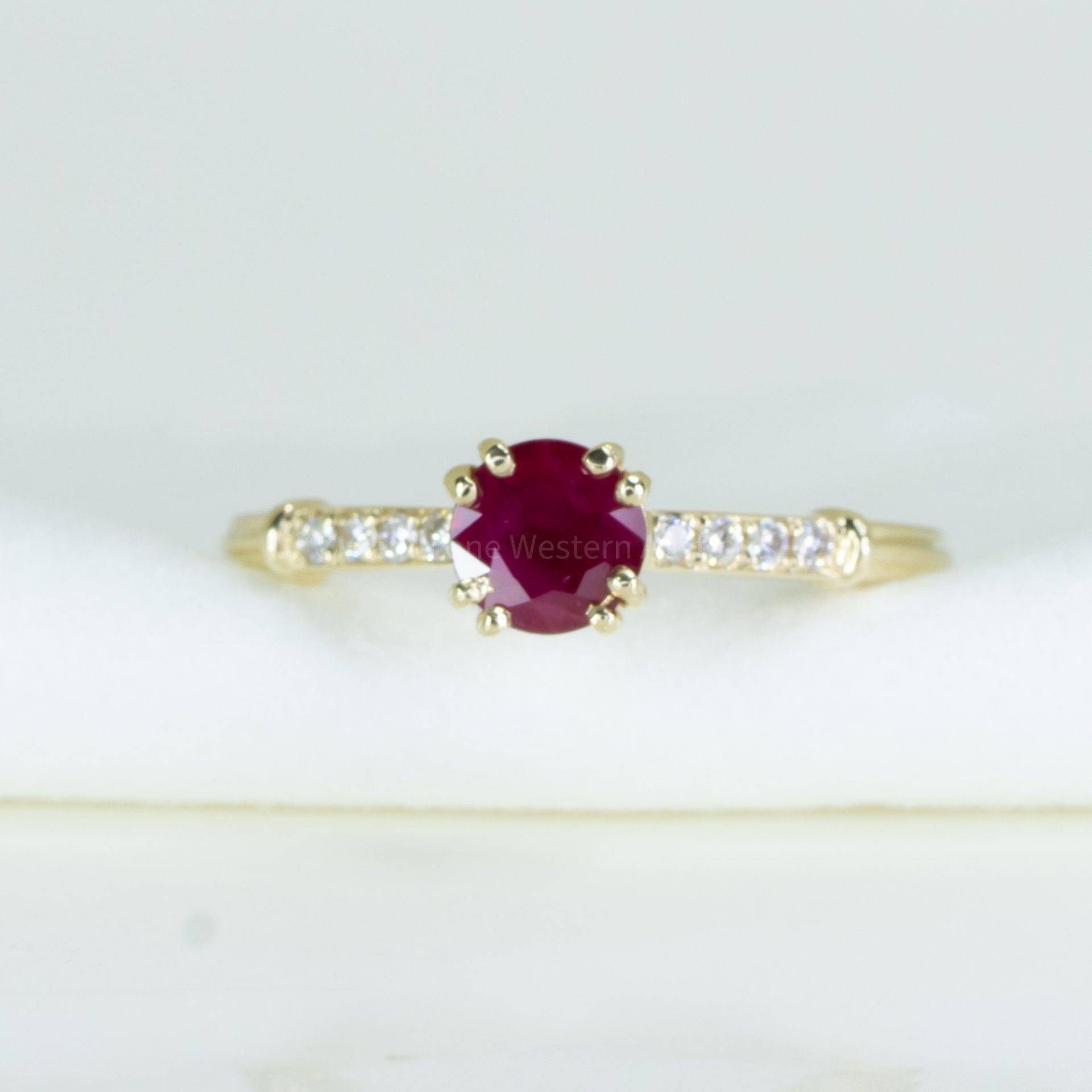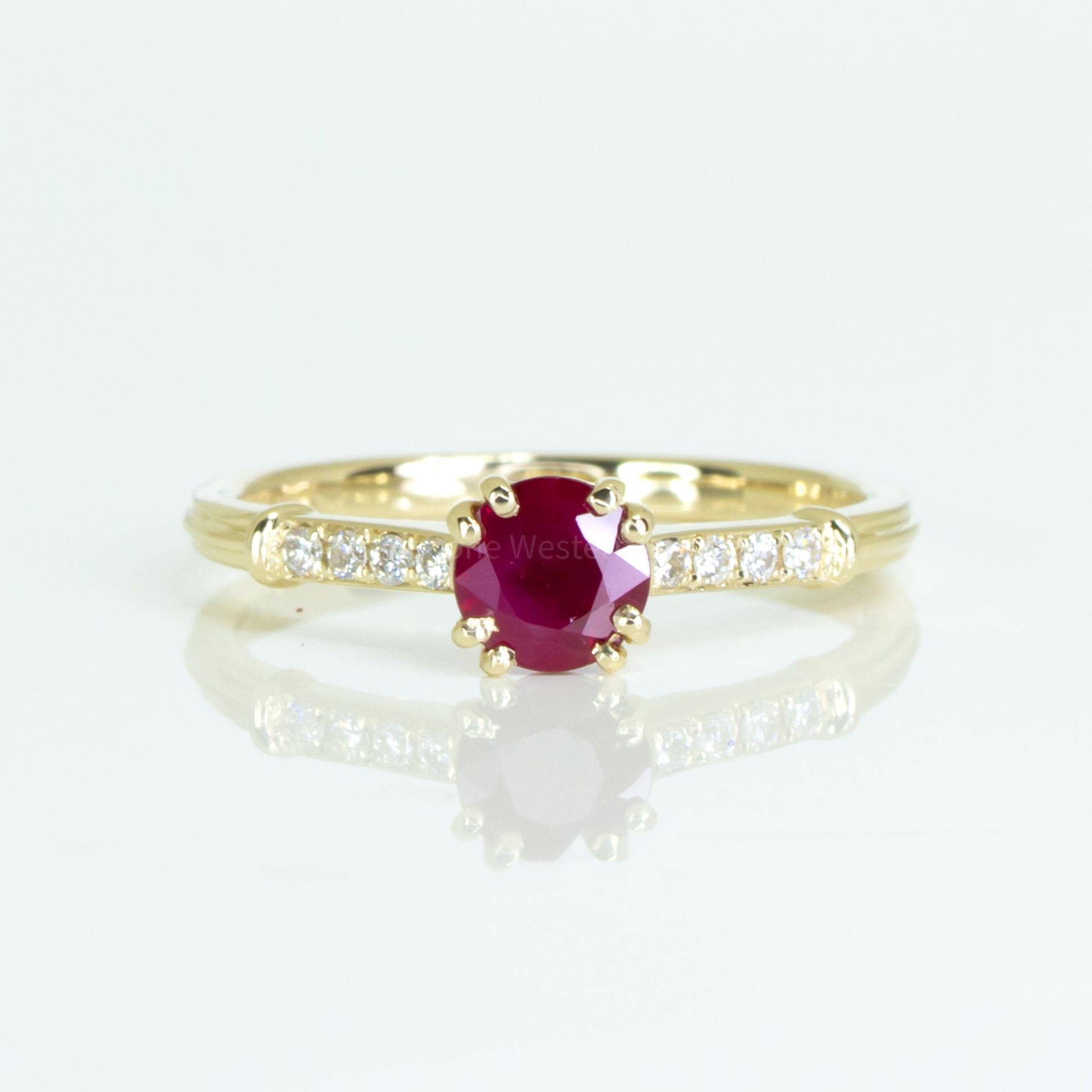 A lovely Natural Ruby and Diamonds Ring presents a vivid round ruby set as the star of this petite 9-stone ring in yellow gold. The natural ruby is flanked by four round brilliant cut diamonds on each side. Explore our collection of 2000+ gems in stock, including Loose Rubies. Can't find what you want? Contact us here for a wider selection. For custom designs, expert advice, and more information, book here a complimentary appointment with our expert gemologist and designers.