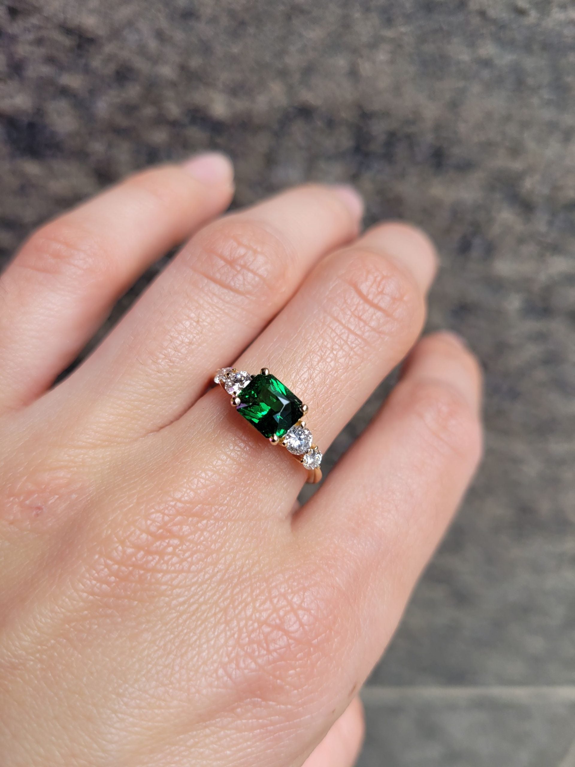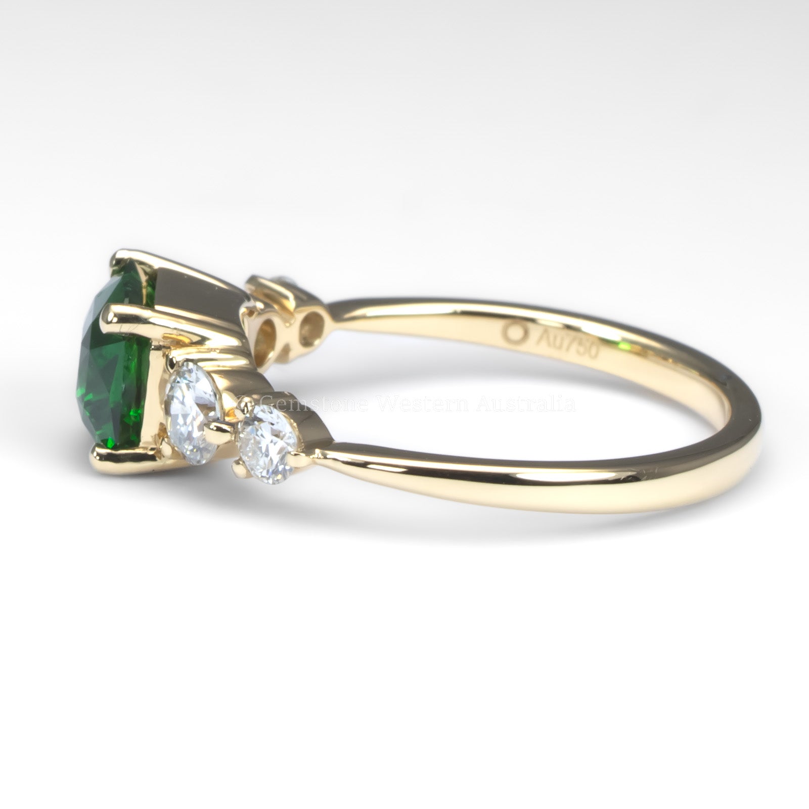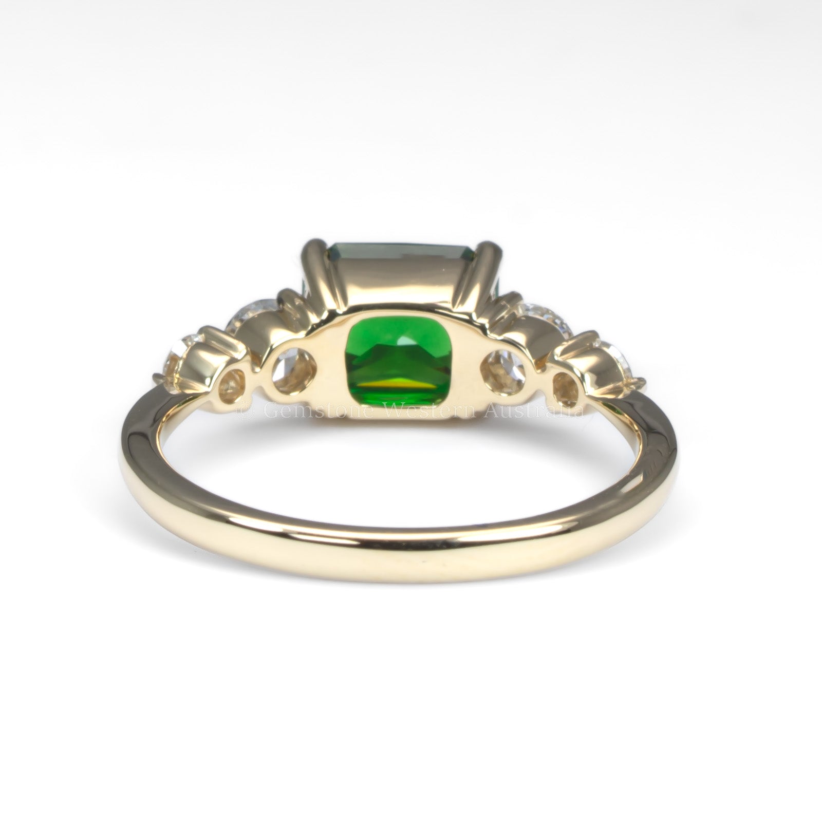Flanking the centre stone are four round brilliant cut diamonds. Two larger GIA-certified diamonds weighing a combined 0.36ct, and two smaller accent diamonds totalling 0.17ct. The diamonds enhance the vivid green hue of the garnet, adding sparkle and perfect symmetry to the design.