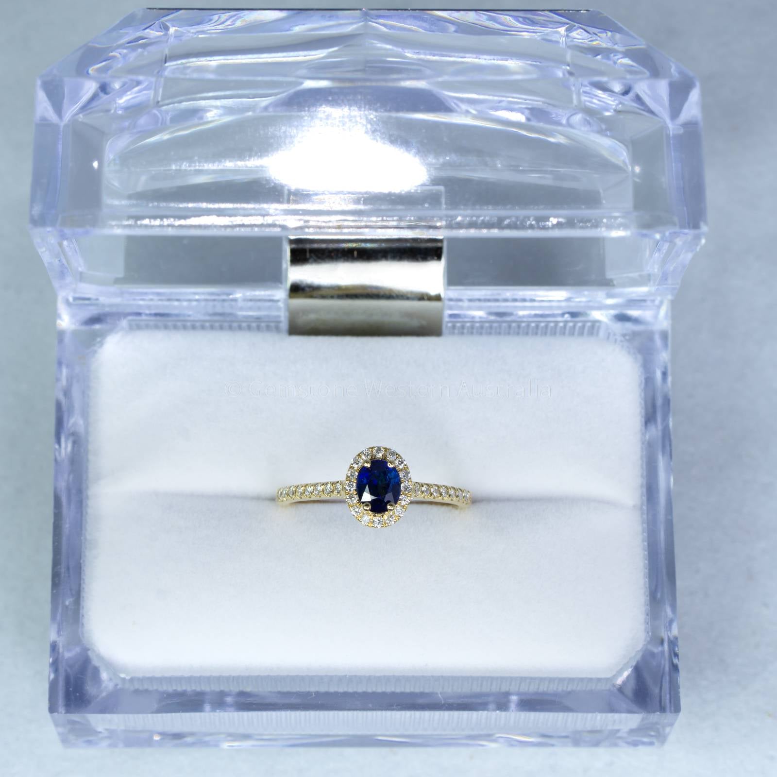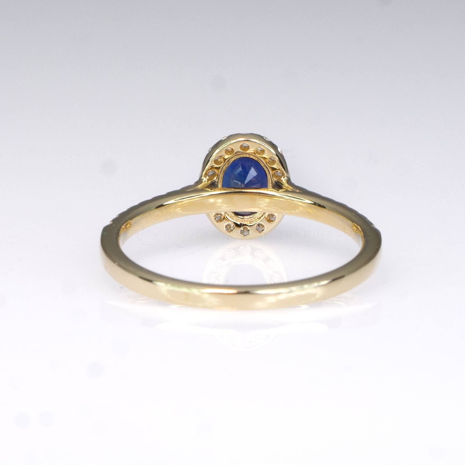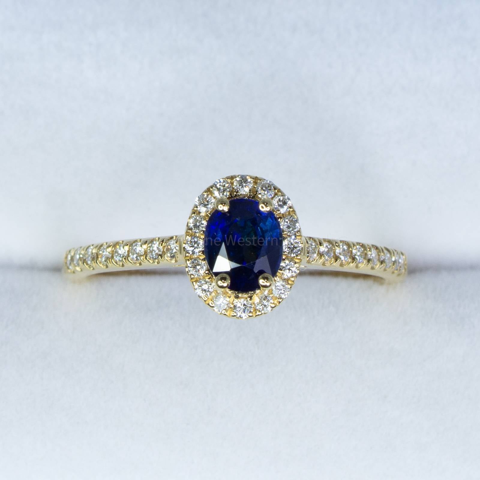 This dazzling Sapphire Diamond Halo Ring features an oval cut natural, unheated, royal blue sapphire prong set in 18ct yellow gold with a halo of sparkling diamonds surrounding the centre sapphire, to add more sparkle to this delicate design, diamond accents are set on the shank of the ring to complete 32 round brilliant cut diamonds.  Explore our collection of 2000+ gems in stock, including Loose Sapphires. Can't find what you want? Contact us here for a wider selection. For custom designs, expert advice, and more information, book here a complimentary appointment with our expert gemologist and designers.