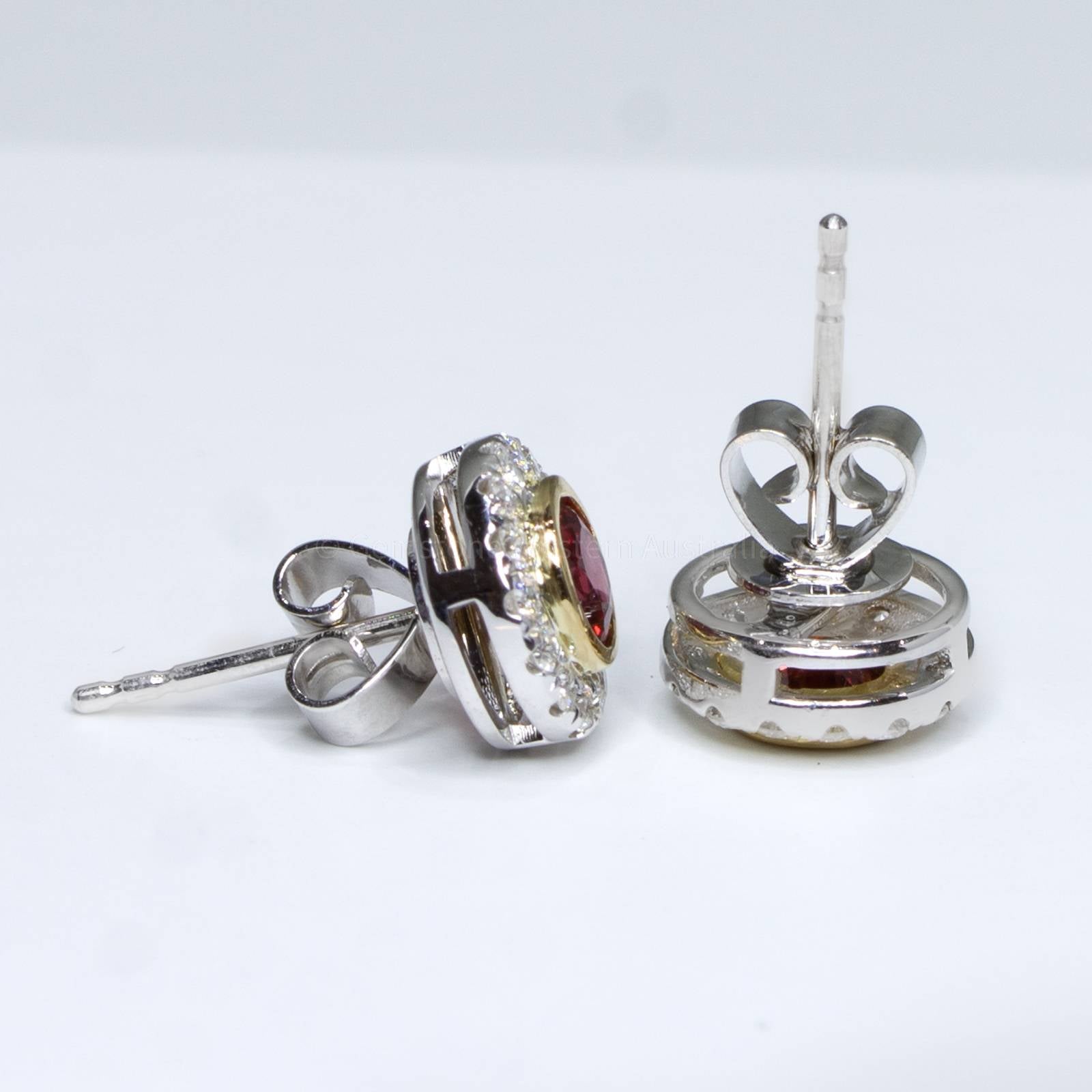 RRV: $7.450 A pair of stunning Natural Unheated Ruby Earrings display two gorgeous rubies with vivid red colour and great clarity that are bezel set in 18 carats yellow gold and surrounded by a delicate halo of round brilliant cut diamonds.  The Natural Unheated Ruby Earrings are crafted in mixed 18 carats white and yellow gold. *Item made to order. Specifications are a guide of a previous ring made to this design. Item can be customised.  SPECIFICATIONS: 1982391