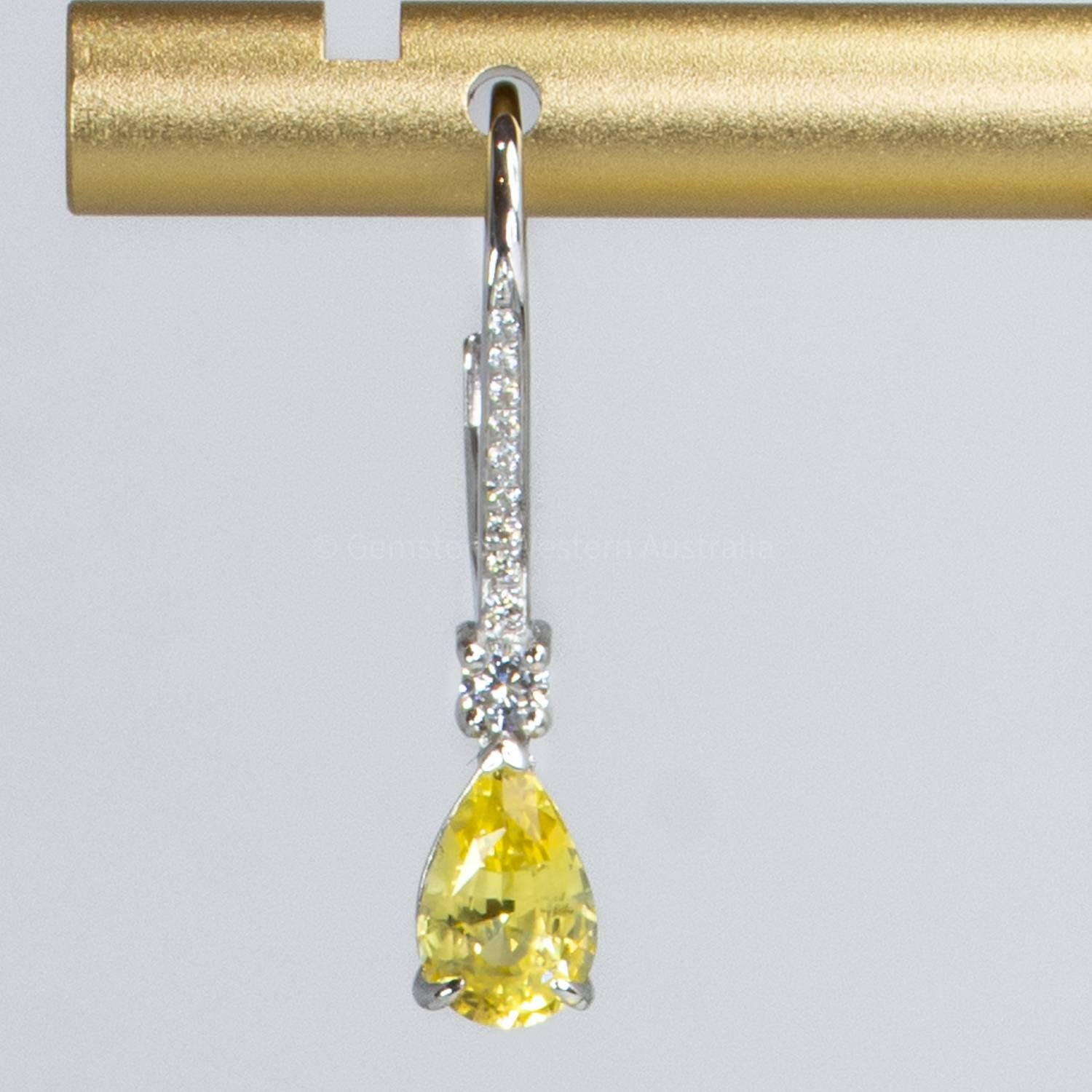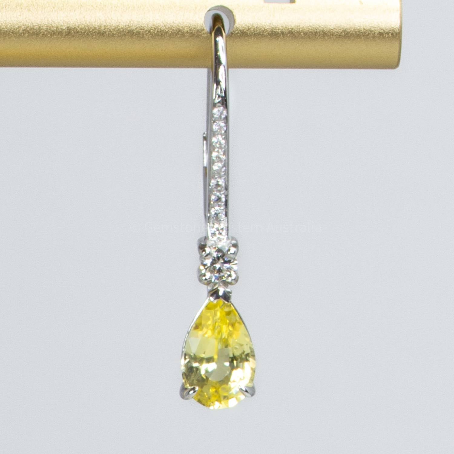 Delicate and elegant Natural Unheated Yellow Sapphire Dangle Earrings designed in 18k white gold. The diamond dangle earrings feature a gorgeous pair of pear cut natural unheated sapphire of vivid yellow colour and incredible clarity. The unheated yellow sapphires weight 2.15 carats and dangle from a 2.4mm brilliant cut diamond that is connected to lovely diamonds set hinged earrings. RRV: $4,950 SPECIFICATIONS: 1982517 Central stones: Two natural unheated yellow sapphires, pear cut, vivid yellow colour. Dimensions: 7.84 x 4.89 x 3.44 & 7.85 x 4.87 x 3.62mm. Weight:2.15ct.   Side Stones: