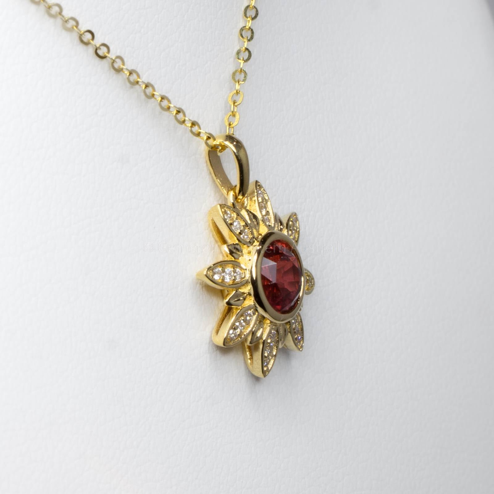 Sapphire and Diamonds Flower Pendant A stunning floral design pendant was created to showcase a gorgeous deep orangy red sapphire that is vibrant in colour and has excellent clarity. The sapphire is a bezel set surrounded by gold petals set with 24 sparkling brilliant cut diamonds. This sapphire accented flower pendant is made in 18ct yellow gold. RRV: $6.000 Explore our collection of 2000+ gems in stock, including Loose Sapphires. Can't find what you want? Contact us here for a wider selection. For custom designs, expert advice, and more information, book here a complimentary appointment with our expert gemologist and designers.