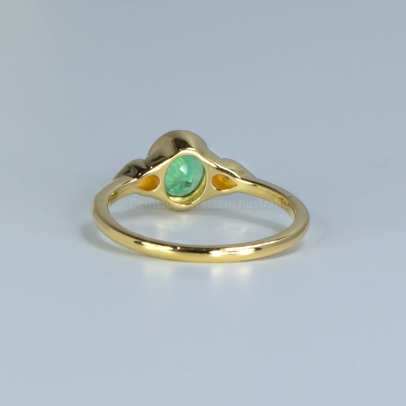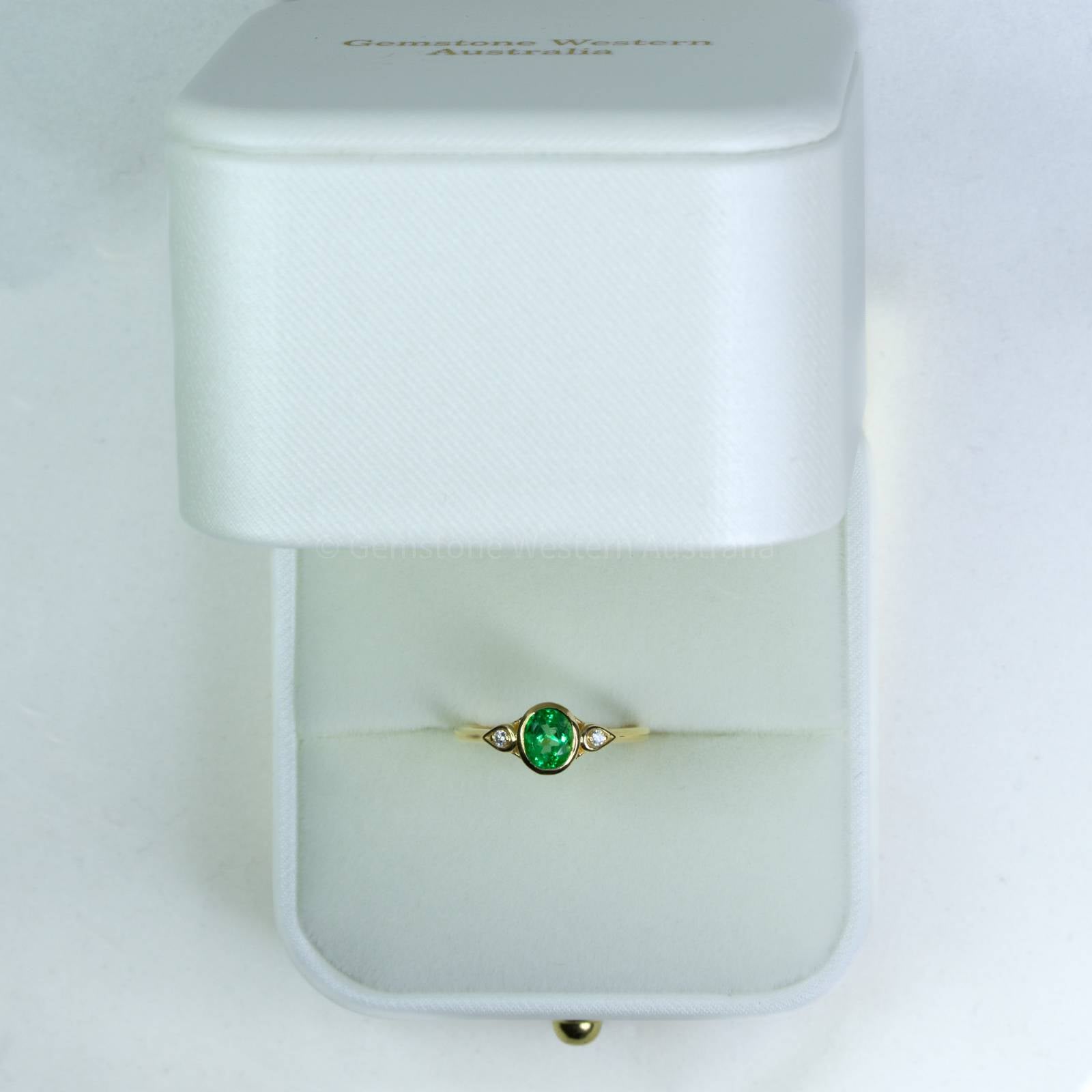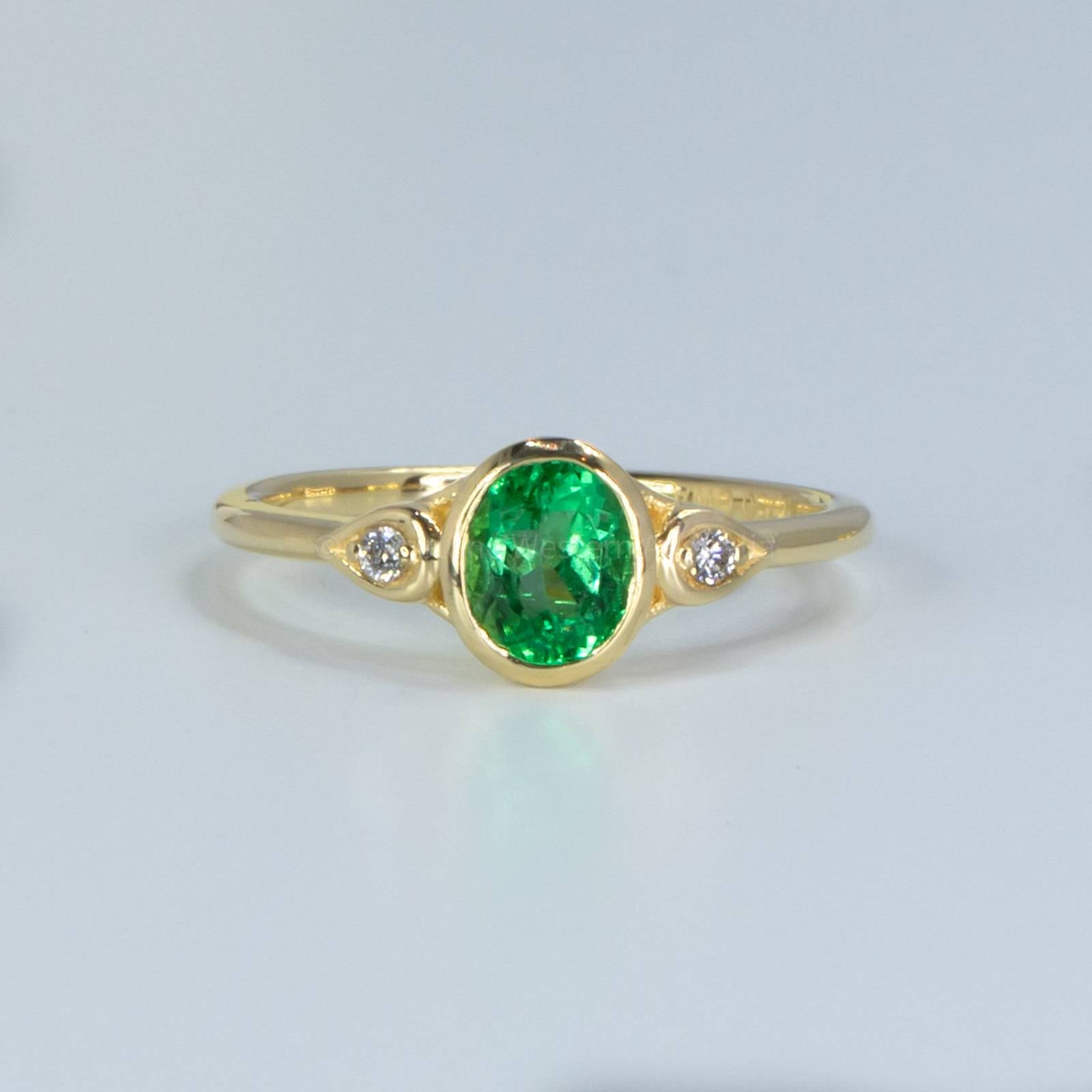 A spectacular Oval Colombian Emerald and Diamonds Ring displays a lovely oval cut emerald in a bezel style setting. The emerald has an incredible clarity and medium green colour that captivates at first glance and is adorned by a round diamond to each side. The diamonds are claw set in a drop like design giving design to this ring and making it perfect as engagement ring or dress ring, super comfortable for everyday use. *Item made to order. Specifications are a guide of a previous ring made to this design. Item can be customised.