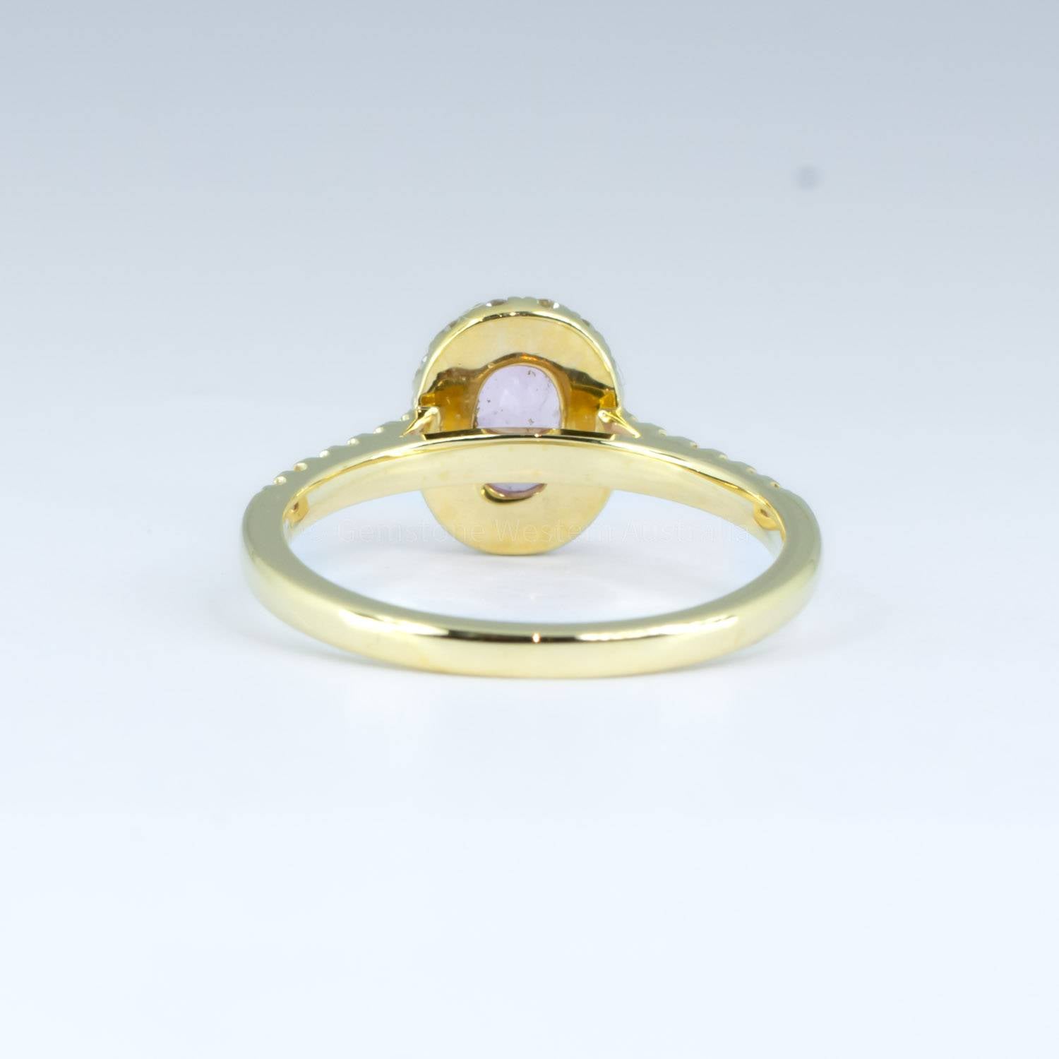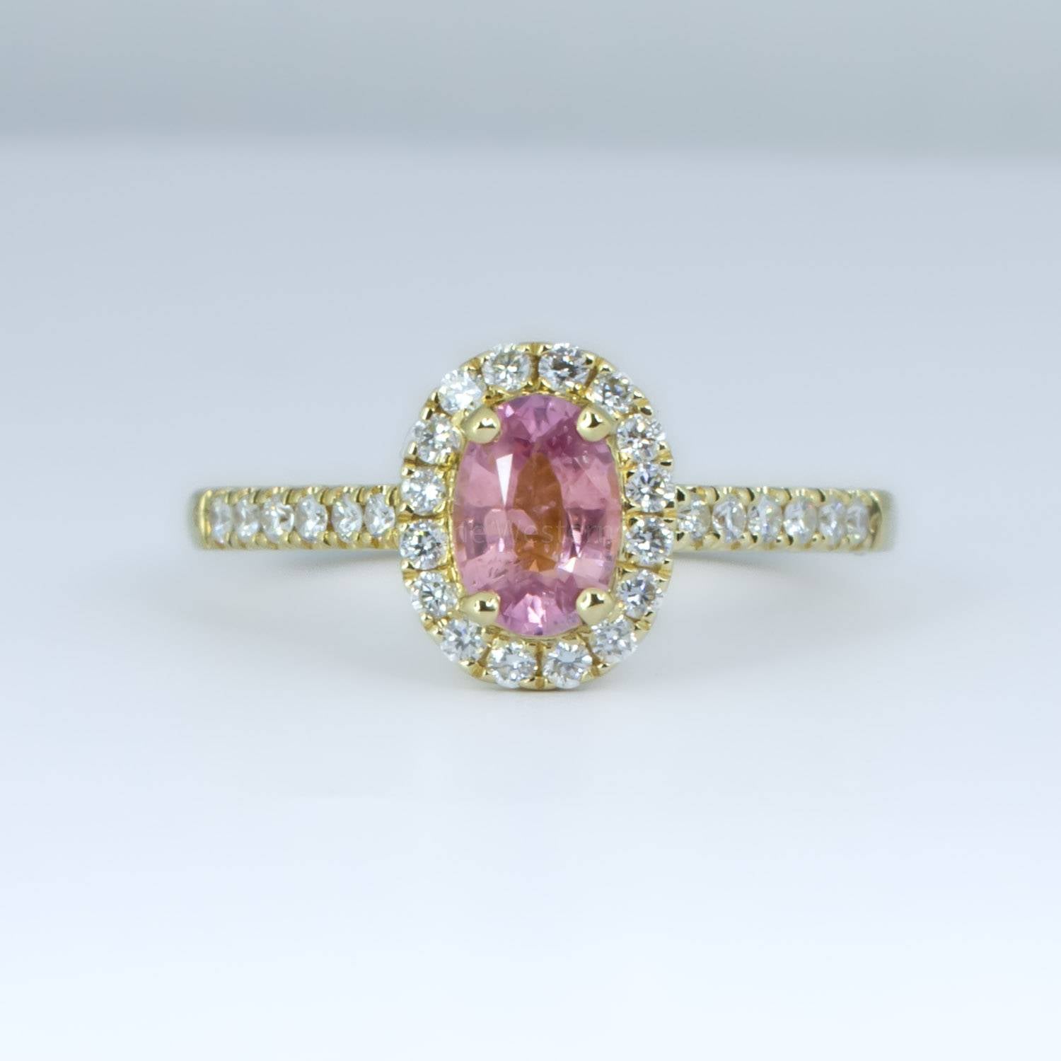 A breathtaking Padparadscha Sapphire Ring features a beautiful oval cut natural, unheated, padparadscha sapphire set in a classic diamond halo setting. The gorgeous ring was designed in 18K yellow gold for a stunning contrast with the soft pink/orange padparadscha colour and brilliant diamonds surrounding the gemstone and adorning the upper half of the band. Explore our collection of 2000+ gems in stock, including Loose Sapphires. Can't find what you want? Contact us here for a wider selection. For custom designs, expert advice, and more information, book here a complimentary appointment with our expert gemologist and designers.
