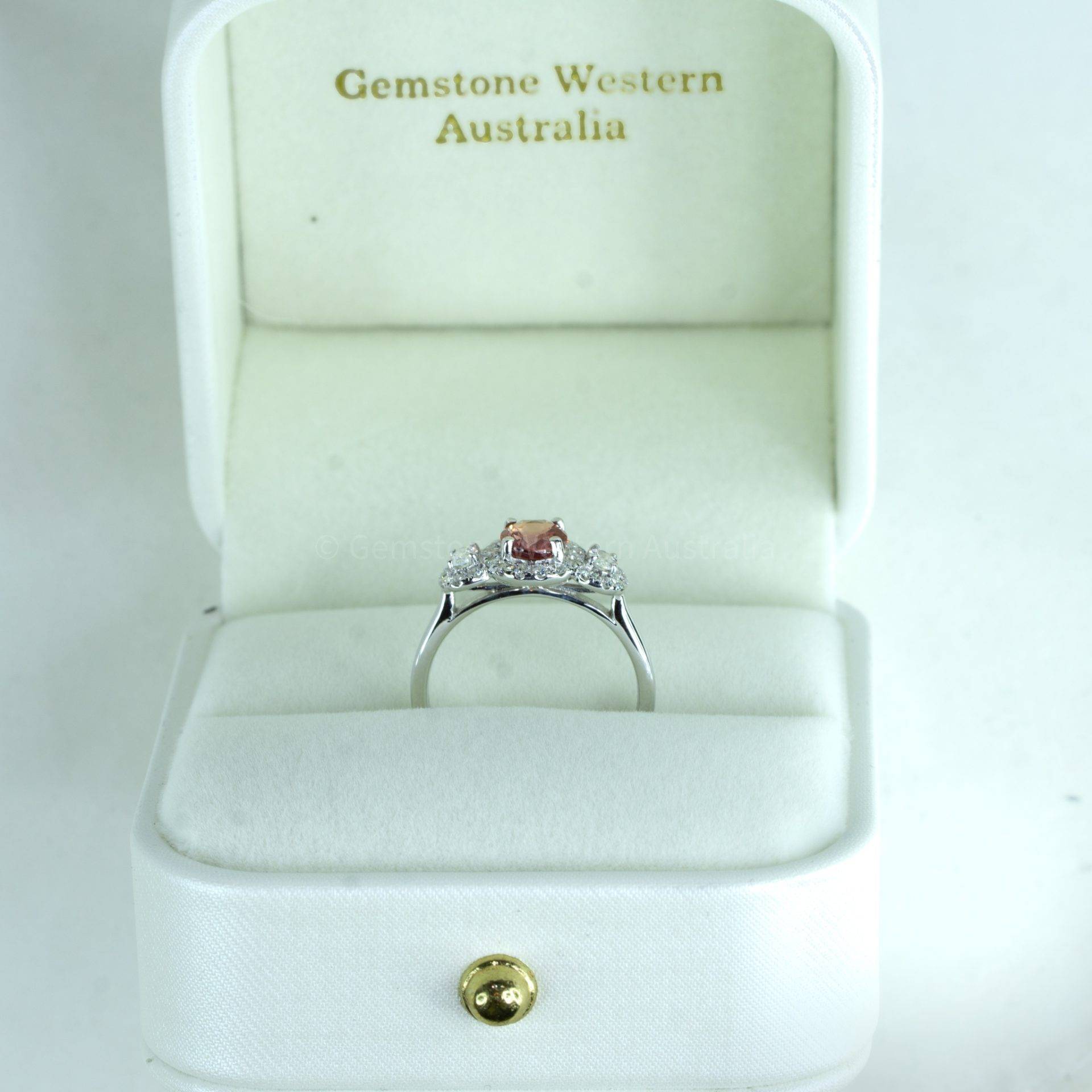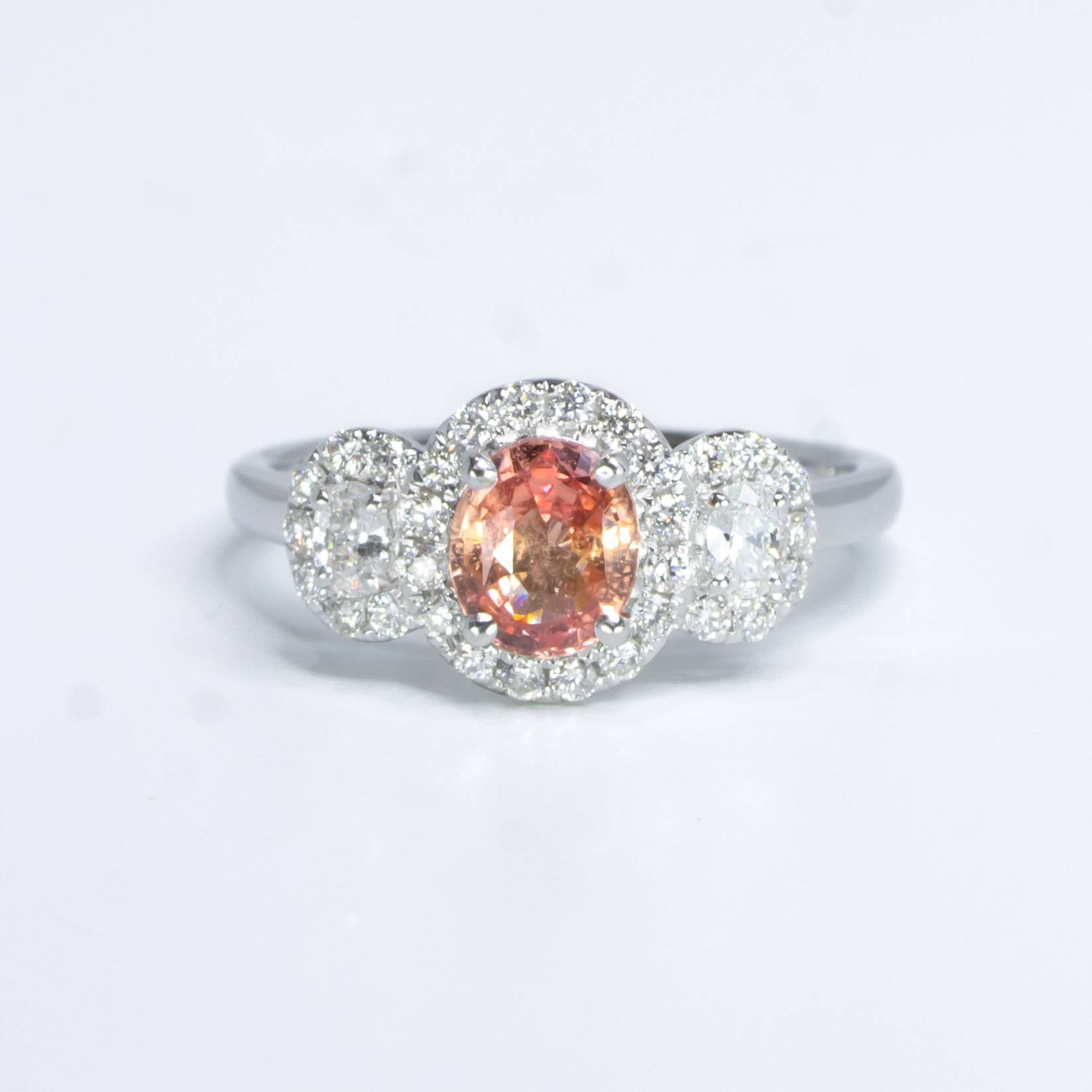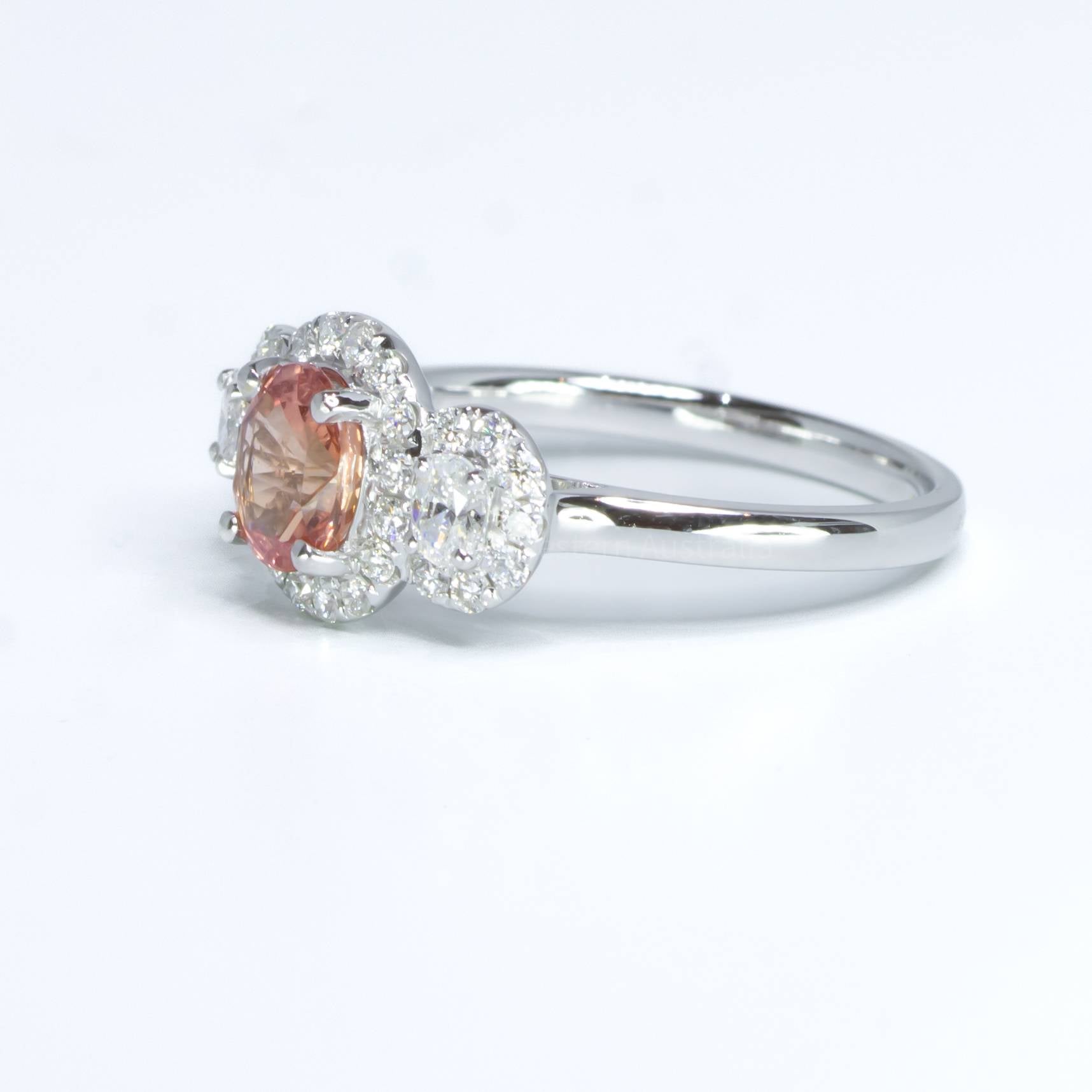 Carefully crafted 18-carat white gold this spectacular Padparadscha Sapphire Three Stone Halo Ring features a stunning oval cut natural unheated padparadscha sapphire and two oval brilliant cut diamonds to each side of the main gemstone. The padparadscha and diamonds are beset with a delicate border of sparkling white round brilliant cut diamonds to complement the charming vintage-inspired design. RRV: $11,900 Explore our collection of 2000+ gems in stock, including Loose Sapphires. Can't find what you want? Contact us here for a wider selection. For custom designs, expert advice, and more information, book here a complimentary appointment with our expert gemologist and designers. SPECIFICATIONS: 1982516
