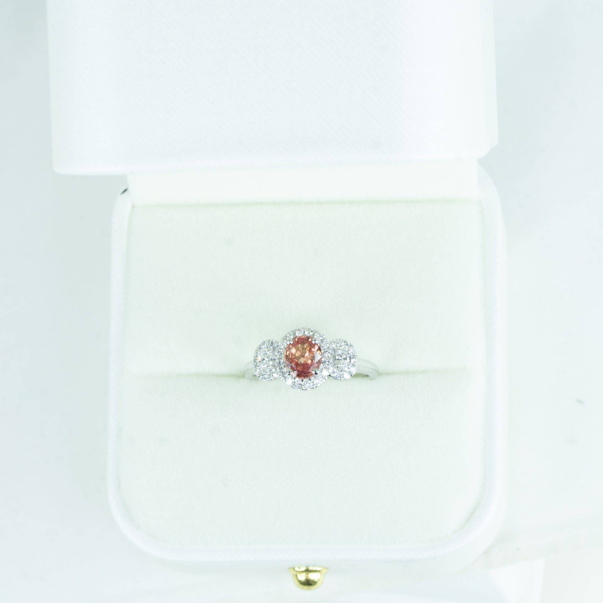 • Central stone: Natural unheated padparadscha sapphire, oval mix cut. Measures: 6.45 x 5.55 x 3.46mm. Weight: 1.12ct.