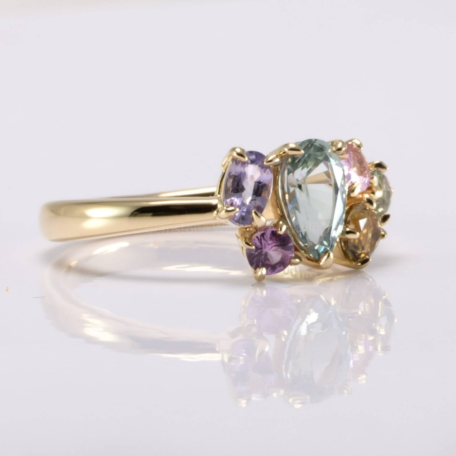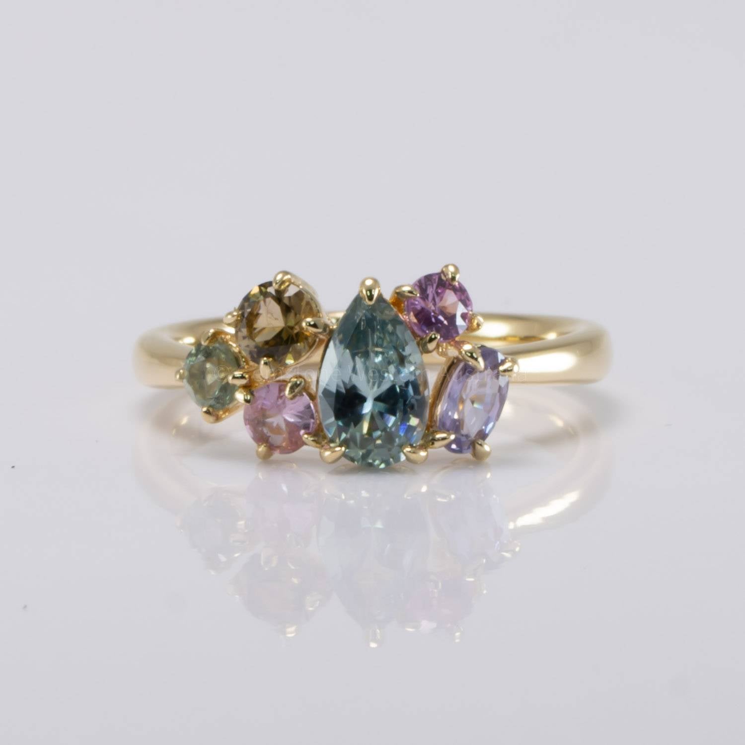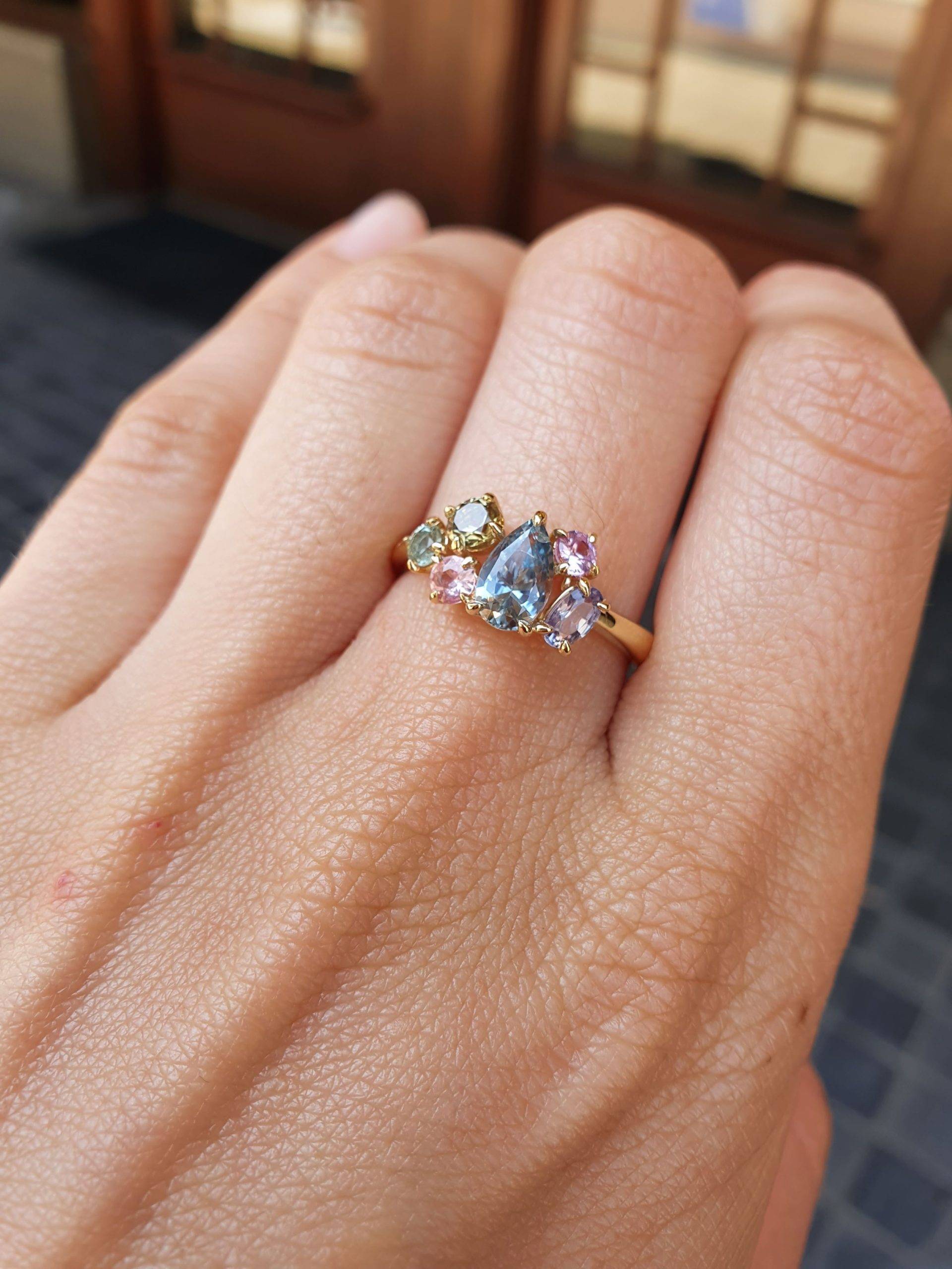 Dare to defy tradition with our 18K Yellow Gold Asymmetrical Ring, featuring a striking pear-cut natural unheated teal sapphire at its heart. This one-of-a-kind piece boasts an unconventional design, with an oval lilac sapphire, a round hot pink sapphire, a yellow tourmaline, a light pink tourmaline, and a green tourmaline asymmetrically adorning the sides. Embrace individuality with this unique blend of hues, meticulously set to elevate your style and make a bold statement. Explore our collection of 2000+ gems in stock, including Loose Sapphires. Can't find what you want? Contact us here for a wider selection. For custom designs, expert advice, and more information, book here a complimentary appointment with our expert gemologist and designers.